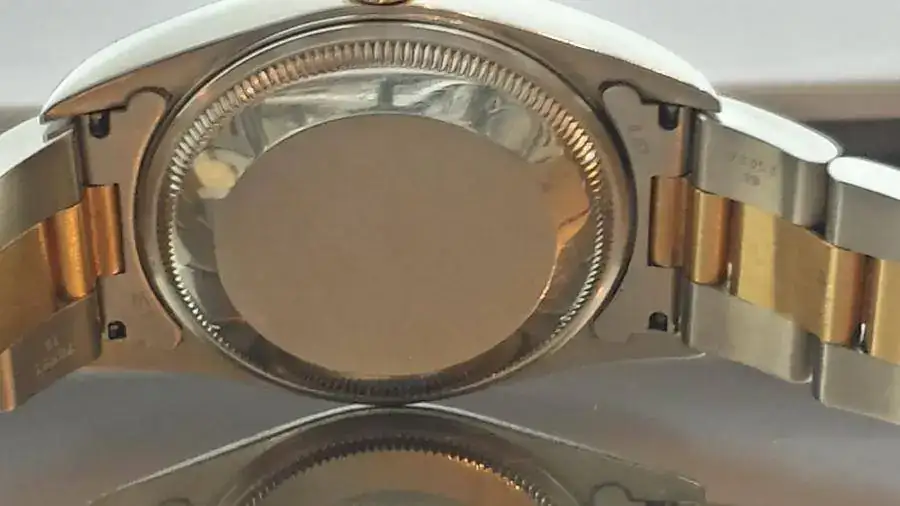 Esfera con numeros romanos e indices y logo aplicados tambien en oro amarillo. El brazalete esta completo de todos los eslabones y en estado muy bueno y sin practicamente ninguna holgura. El cristal zafiro no tiene ningun arañazo y esta muy limpio. El reloj NO ha sido pulido nunca exceptuando un pulido superficial al brazalete.