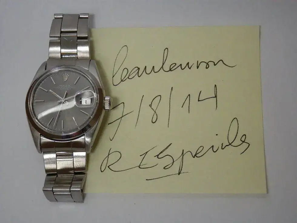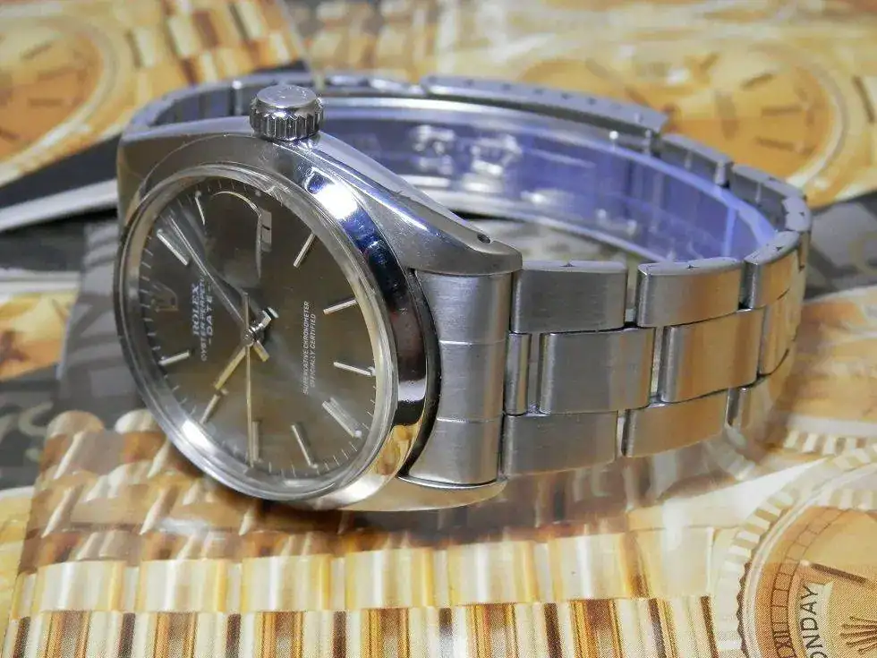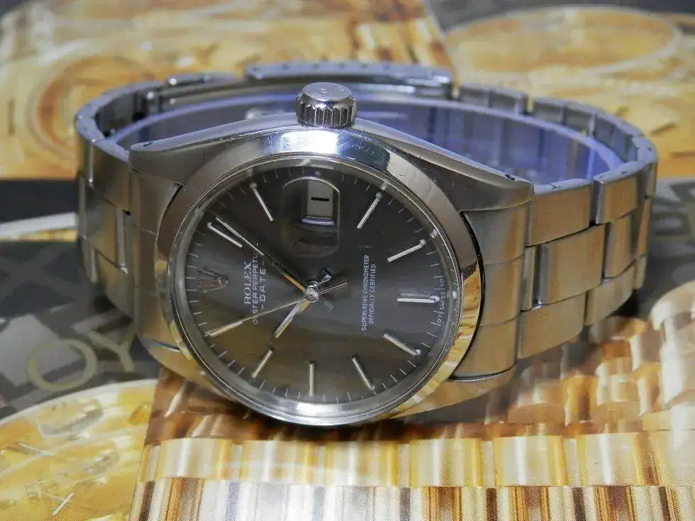 Se trata de un Rolex modelo Date con caja de 34mm de diámetro sin contar la corona Ref. del modelo 1500. Lleva un brazalete Oyster Ref. 7835 y finales Ref. 357 de la época. La esfera es de color gris plomo, preciosa. La marcha y funcionamiento son correctos. El cristal está nuevo, no tiene absolutamente ningún desperfecto y el estado general del reloj es bueno, ha aguantado bien los años. Tiene algunas señales del paso del tiempo pero no grandes desperfectos, golpes, etc...