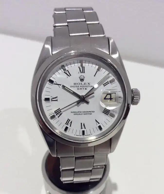 ROLEX DATE REF. 1500€ número 16909XX, esfera blanca,armis ref. 7205, terminales 57. Año 1963. En buen estado.