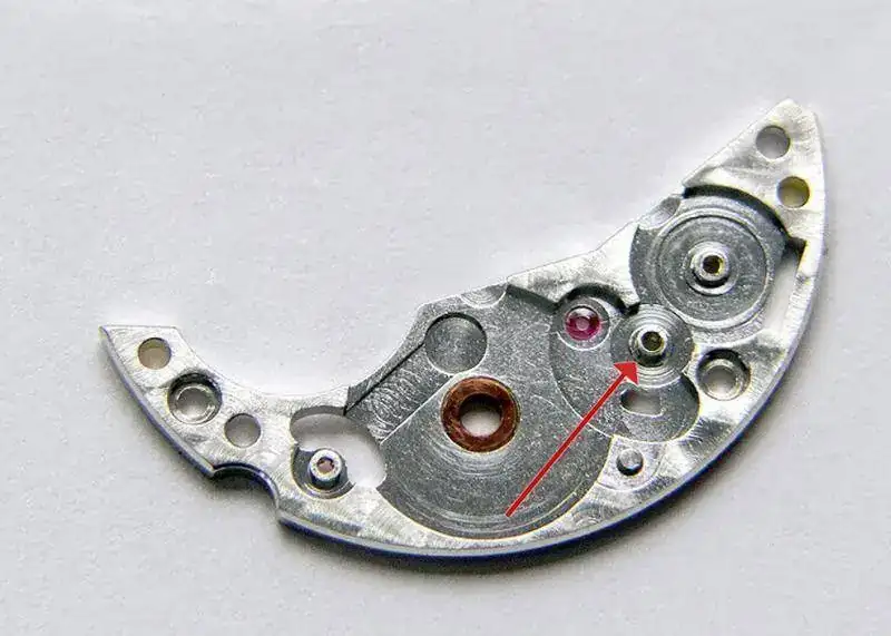 El puente de carga tiene ese cañon que señalo en la foto.... ese cañon alberga un engranaje que sólo hace fuerza al darle cuerda manualmente, ya que otro engranaje se desliza por la ranura que se ve abajo... engranando o no con el susodicho dependiendo de si es el sistema de carga automático o si es la corona la que está accionando los sistemas de carga... el problema es que ese cañon es de latón, ya que está mecanizado en el própio puente y por lo visto es bastante tensión la que hay entre el cañon y el engranaje cuando damos cuerda, el engranaje de acero girando sobre un cañon de latón, sumado a demasiados años sin grasa, sumado a alguien que usa poco el reloj y cuando lo hace tiene que darle cuerda si o sí, pués se produce un desgaste.