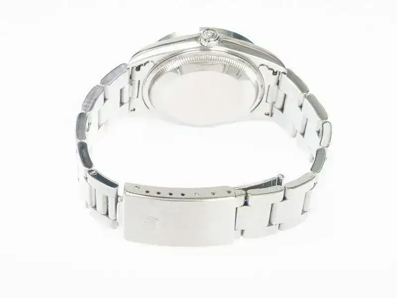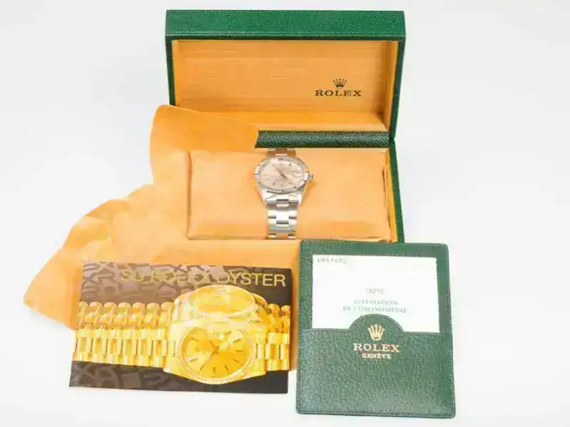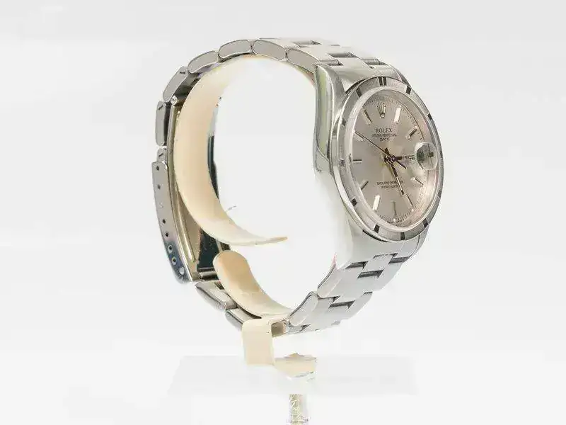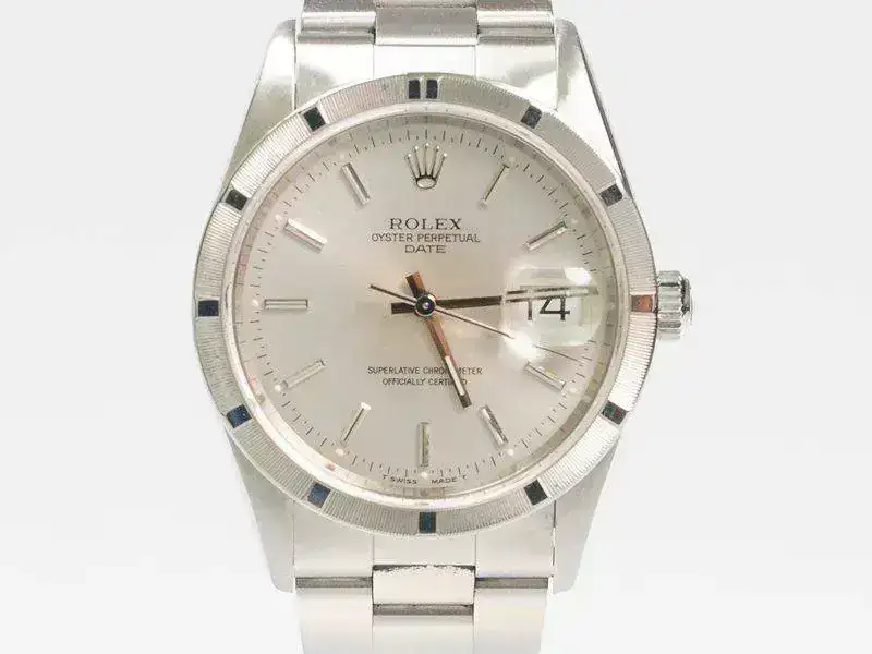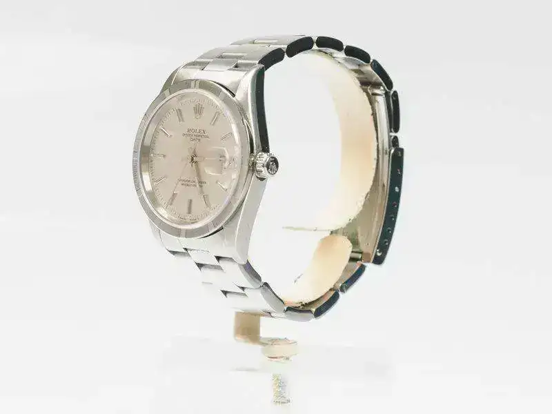 Año 1999. Reloj Rolex Date, Movimiento automático con fecha calibre 3135. Caja en acero inoxidable con diámetro de 34mm, bisel ancho con estrias. Brazalete Oyster en acero inoxidable. Corona a rosca. Cristal de zafiro. Esfera plateada “trazos”. Hermético hasta 100m de profundidad. Estuche y garantía original Rolex.