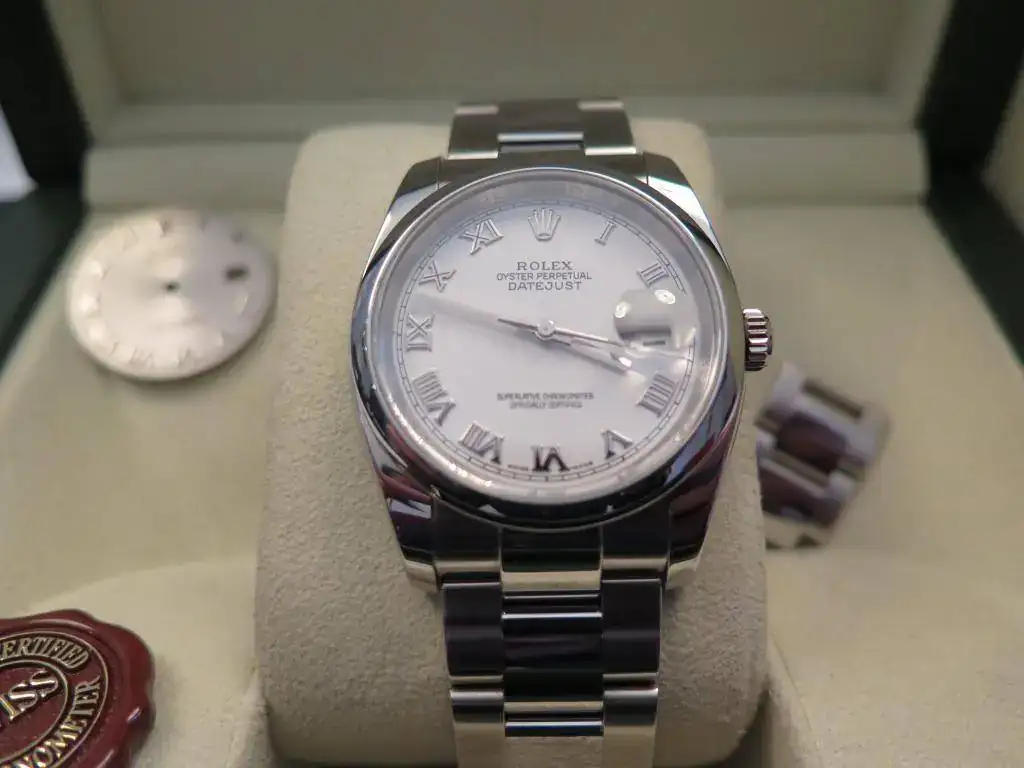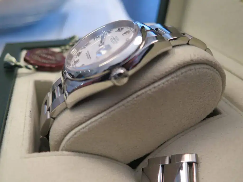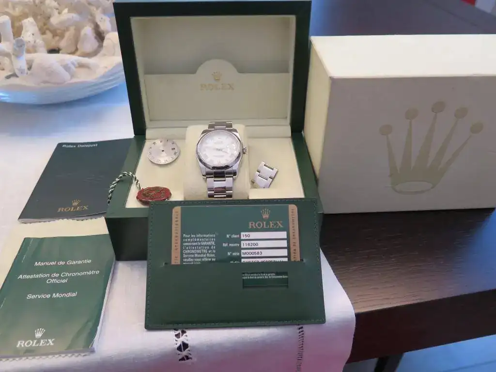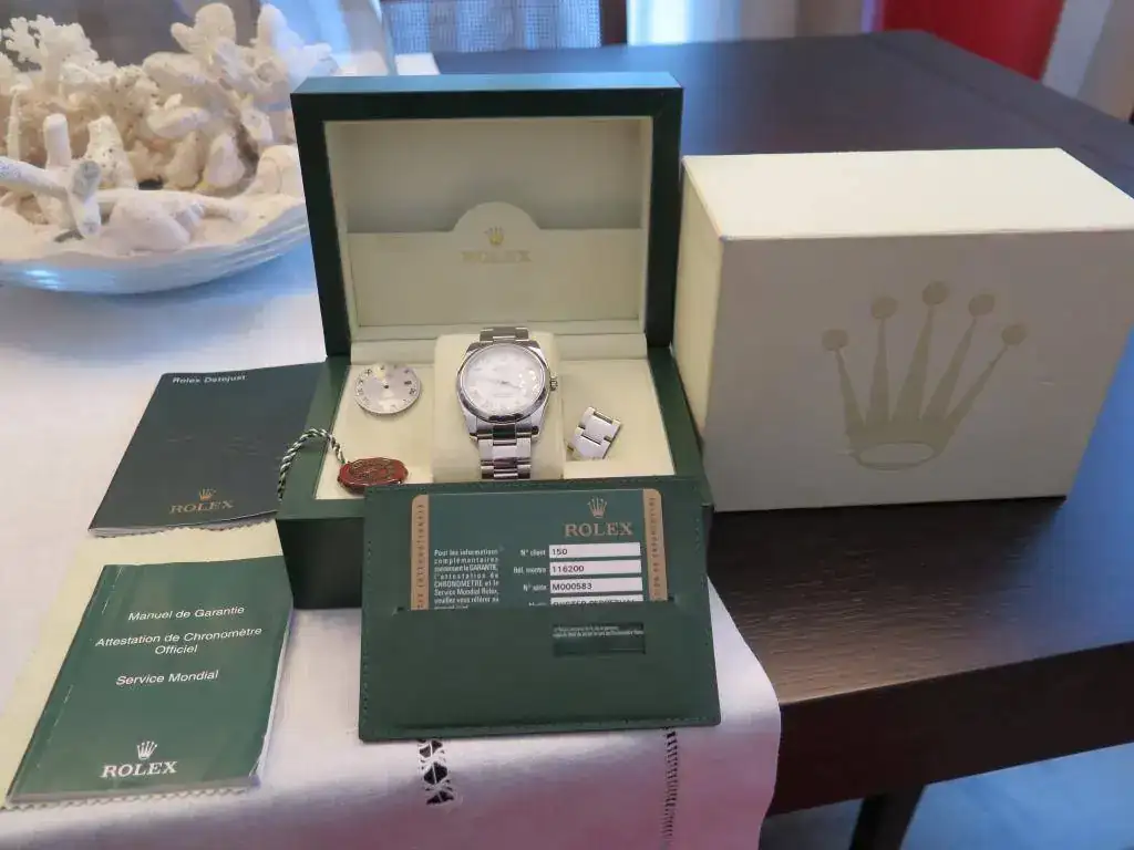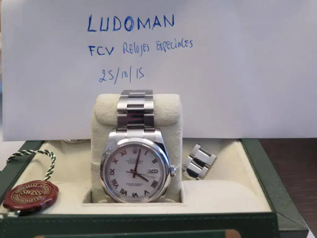 Muy a pesar mío saco a la venta este precioso Datejust en acero de 36 mm del año 2008 con aro de seguridad y esfera blanca con números romanos. El reloj esta completo y no tiene ningún golpe ni roce, salvo los típicos pelillos del cierre. El brazalete oyster completo con cierre oysterlock que permite un ajuste de 0,5cm para mayor comodidad. Además viene de regalo con una esfera gris. Le he dado muy poco uso, pero con la llegada del Daytona se que se va a quedar en la caja sin usar. No acepto cambios para esta pieza.