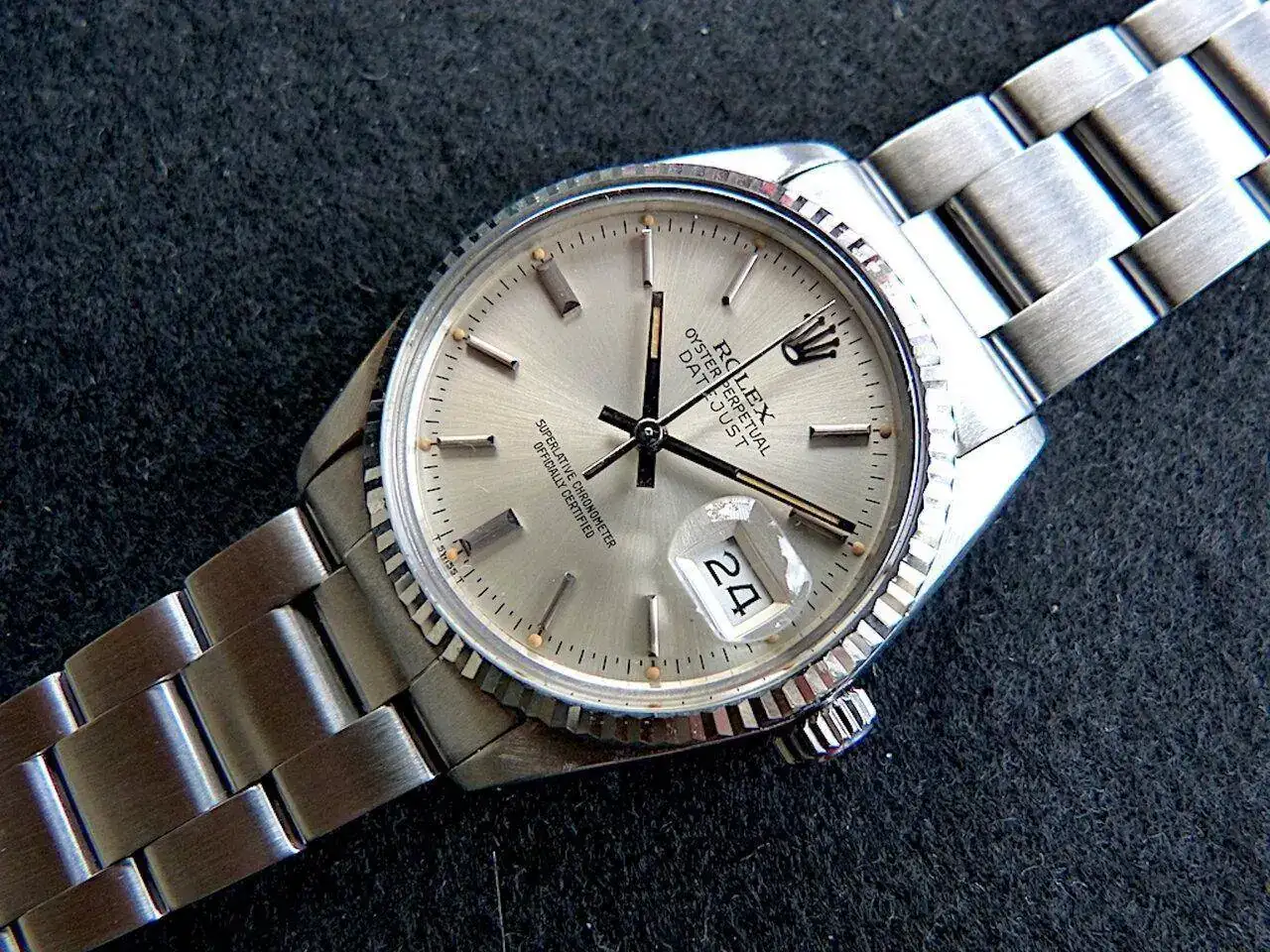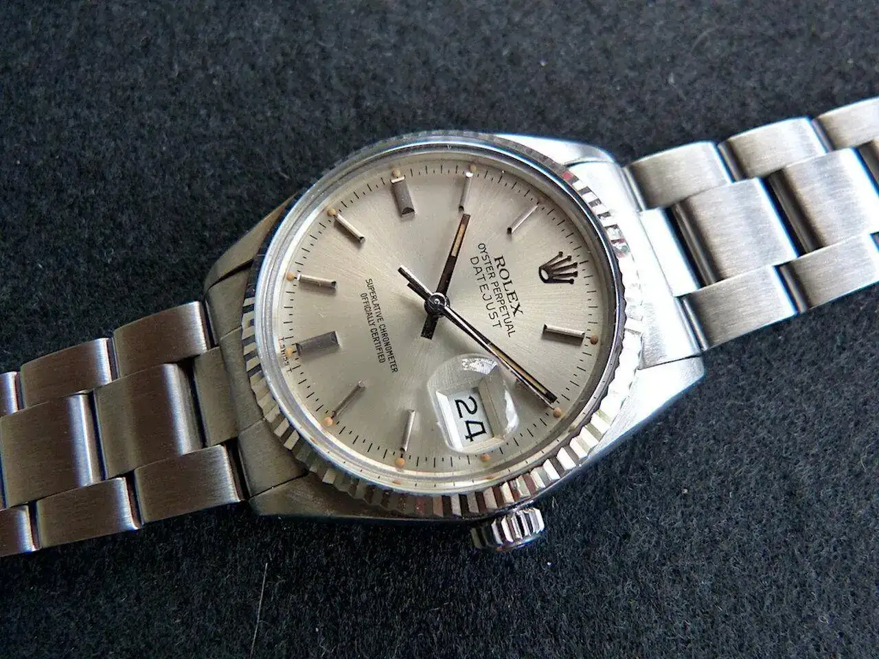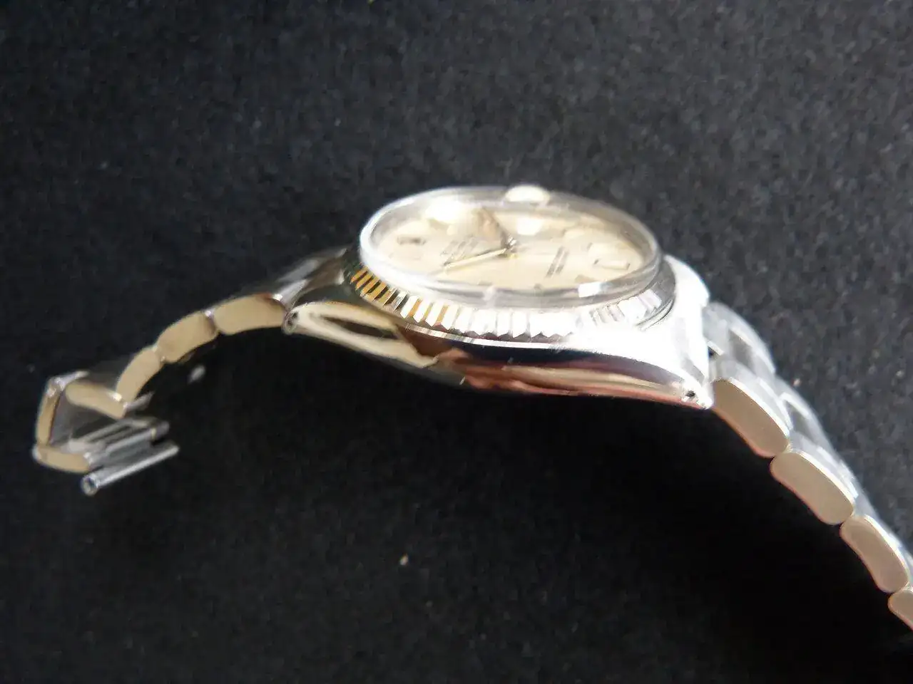 Reloj en muy buen estado general y original. Caja bien conservada, seguramente con algún pulido leve en el pasado pero aun entera y sin desperfectos. Bisel de oro blanco en muy buen estado. Esfera original en estado impecable, con los puntos de tritio íntegros y con una patina espectacular, una de las esferas Rolex mejor conservada que han pasado por mis manos. Plexiglass en muy buen estado. Brazalete Oyster 78360 raro de ver en esta referencia (casi todos venían con Jubilee) también en muy buen estado, sin holguras de importancia, con todas sus piezas marcadas y código clasp H correcto.