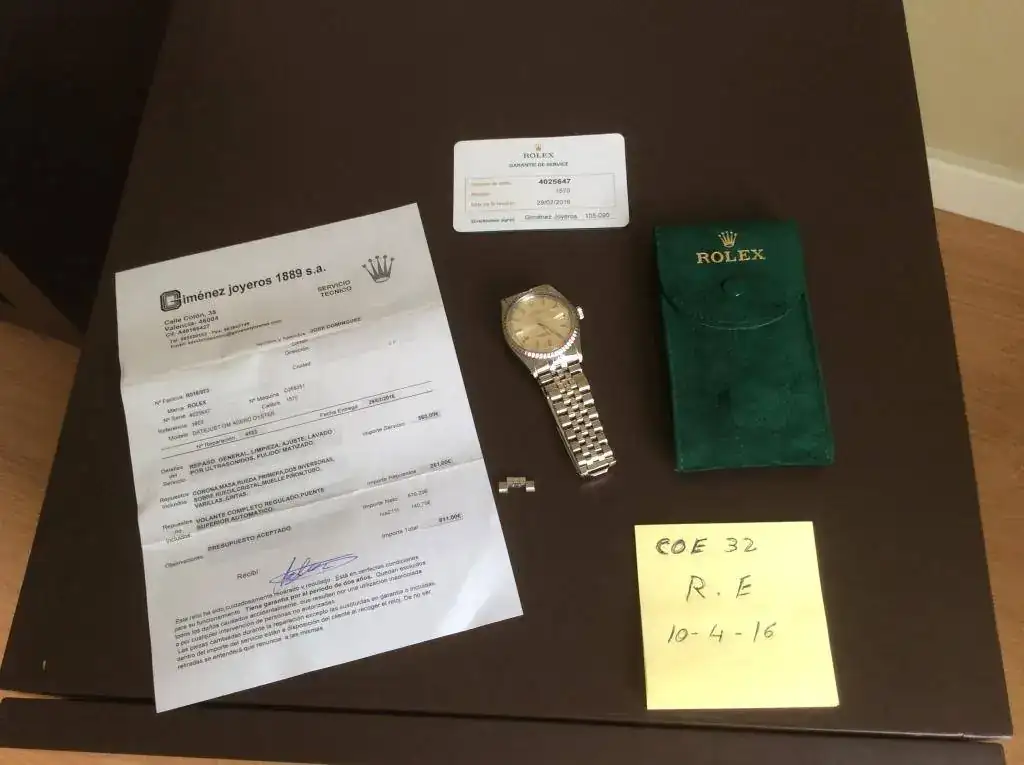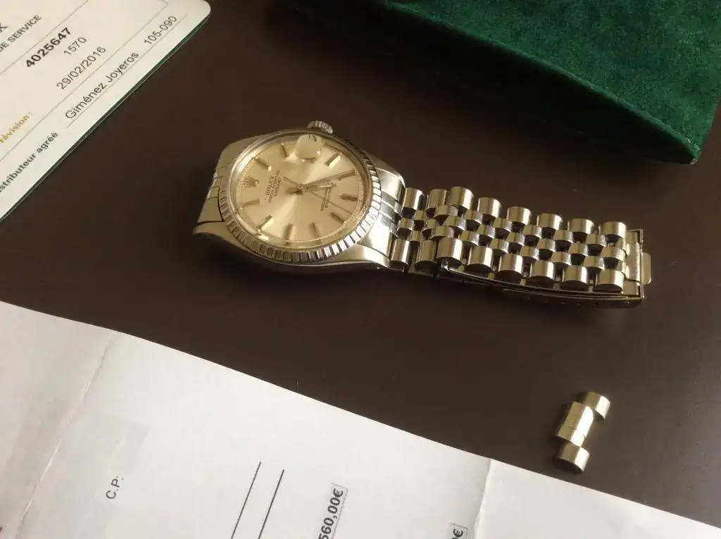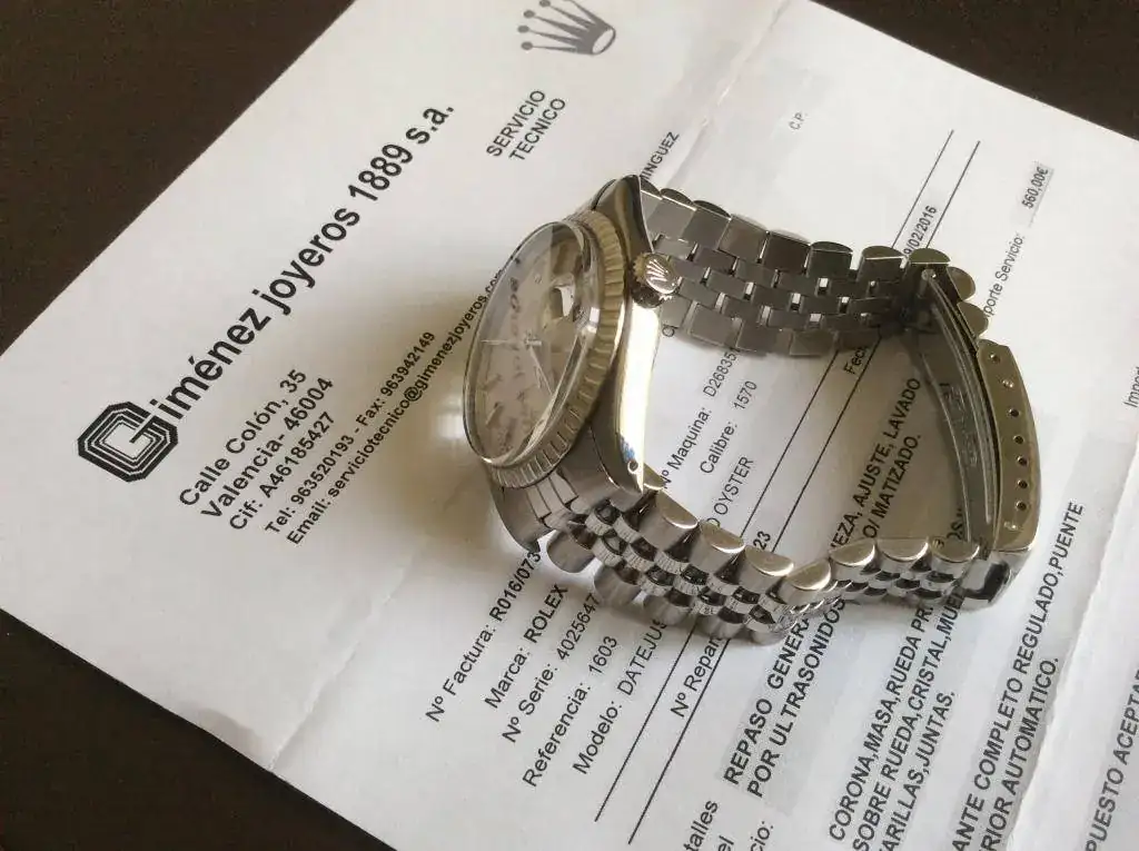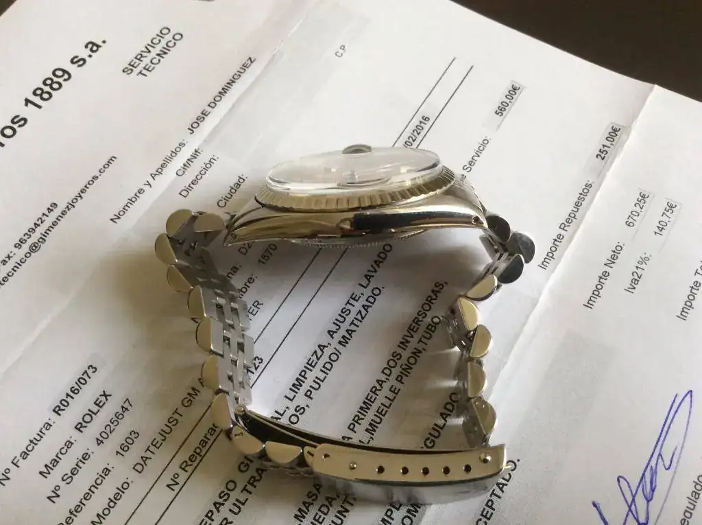 Pongo para su venta este Datejust del año 1974, un autentico vintage en toda regla, el reloj a pasado una revision general en Rolex donde aparte de la revision general, se le han sustituido algunas piezas que por los años tenian desgaste, la factura ascendio a 811€. Decir que ahora mismo el reloj esta perfecto para soportar 40 años mas. Solo señalar una minuscula manchita en el dial a la altura de las 11, pero no quise sustituir un dial con tanta solera por una manchita que apenas se ve.
