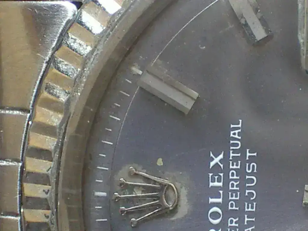 Su estado general es bueno excepto la esfera que debería ser reemplazada. La pintura alrededor de la corona ha saltado y los índices entre la una y las dos también. Una esfera nueva ronda los 100 eur así que por un poco más tenéis un reloj estupendo. Incluso hay una motita de óxido casi invisible (pero no quiero que haya absolutamente ninguna duda) pero el relojero dice que fue porque seguramente entró algo de humedad por la junta del cristal. Repito: el calibre está perfecto y funcionando correctamente.