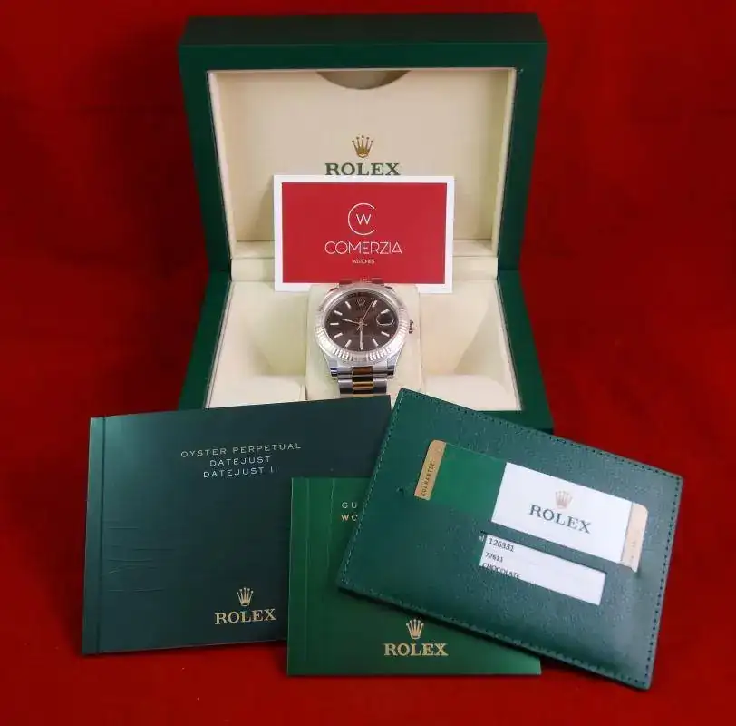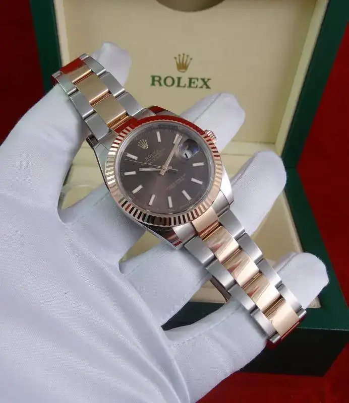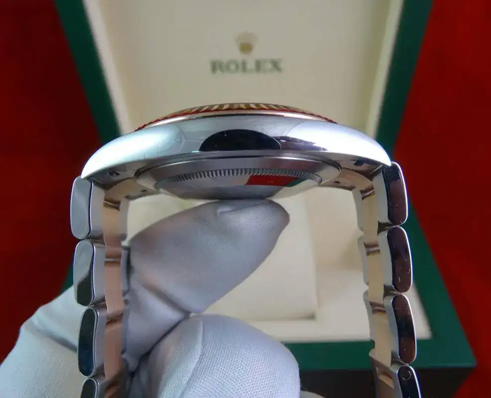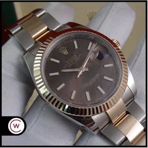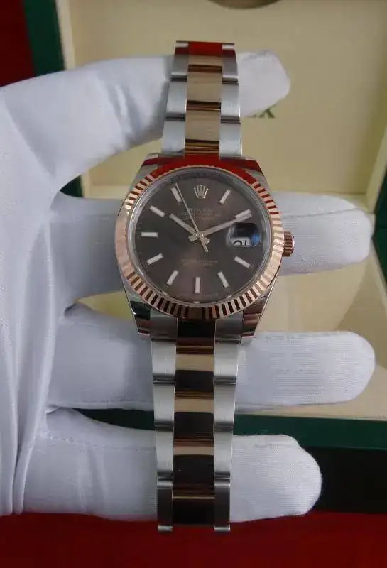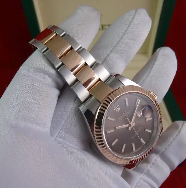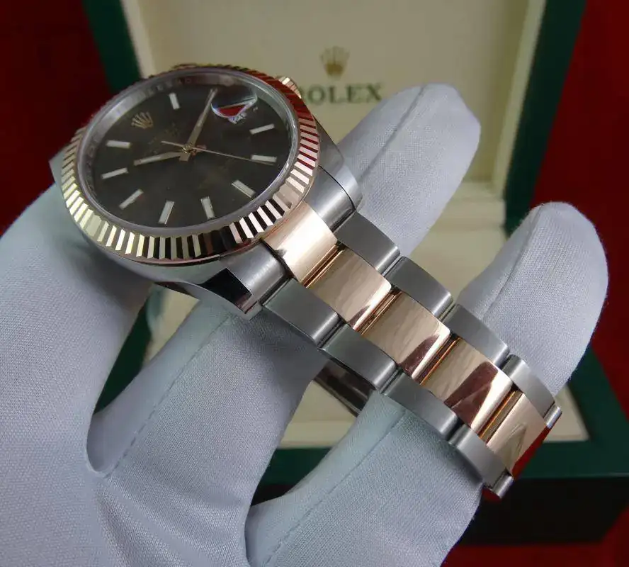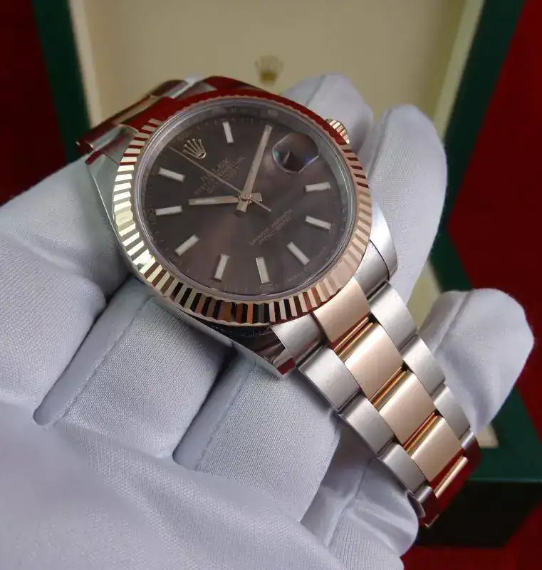 Hoy proponemos otro reloj especial: ROLEX Datejust 41 mm, en su edición Everose, combinación de acero y oro rosa. El modelo Datejust 41 sustituye al Datejust II, con varios cambios a mejor, principalmente una caja rediseñada y más cómoda, un bisel mas proporcionado y el último calibre de ROLEX con 70 horas de marcha. El reloj es impresionante en la muñeca, destacando la combinación de acero con oro rosa, y la esfera de chocolate con rayos de sol, que le da una profundidad especial al reloj.