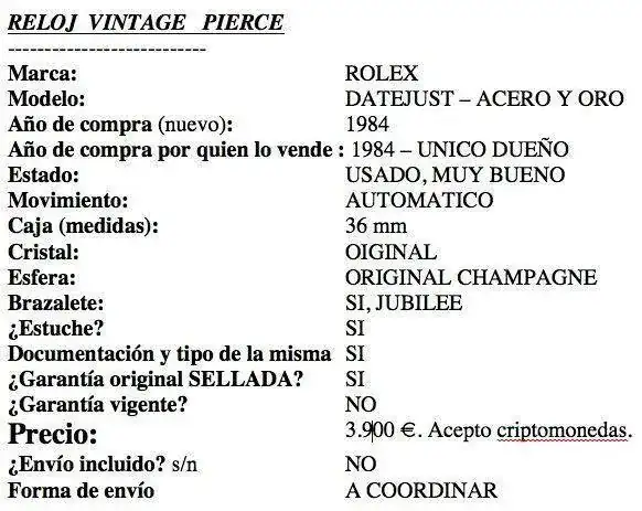 Vendo este tradicional reloj, el cual compré nuevo en el año 1984 y tengo la factura original. Unico dueño, poco uso, en muy buen estado, nunca fue pulido ni lo necesita, solo detalles imperceptibles en la esfera. Envío a preferencia del comprador no incluido. Acepto cryptomonedas estables como pago parcial o total.