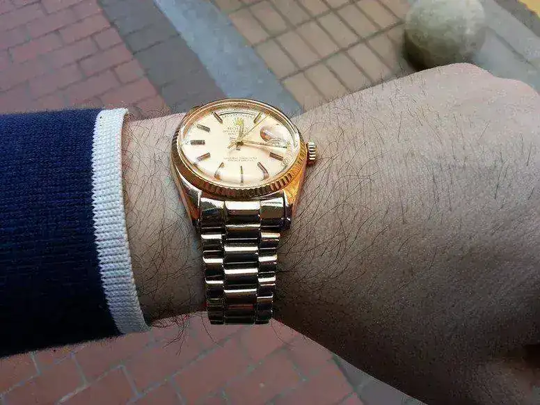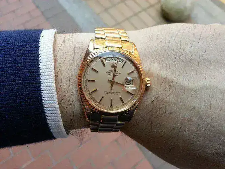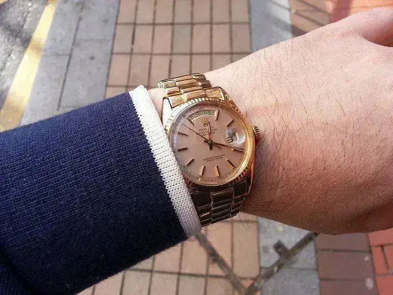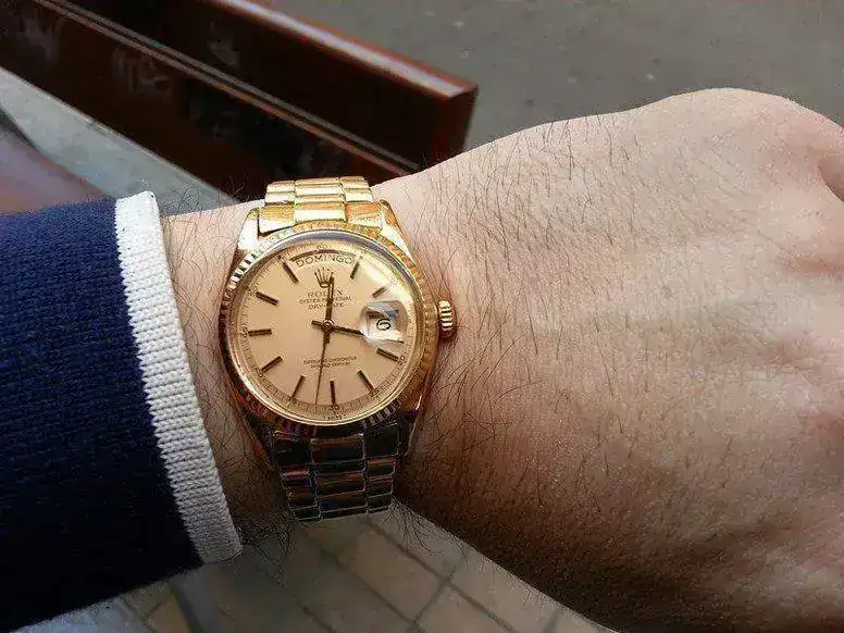 Vendo este Rolex President de "oro Rosa" ( "MAS EXCLUSIVO QUE EL DE ORO AMARILLO" ) , el reloj acaba de pasar revisión y su estado de conservación es MUY bueno para su edad, un detalle que me gusta es la tonalidad rosada del oro y de la esfera.