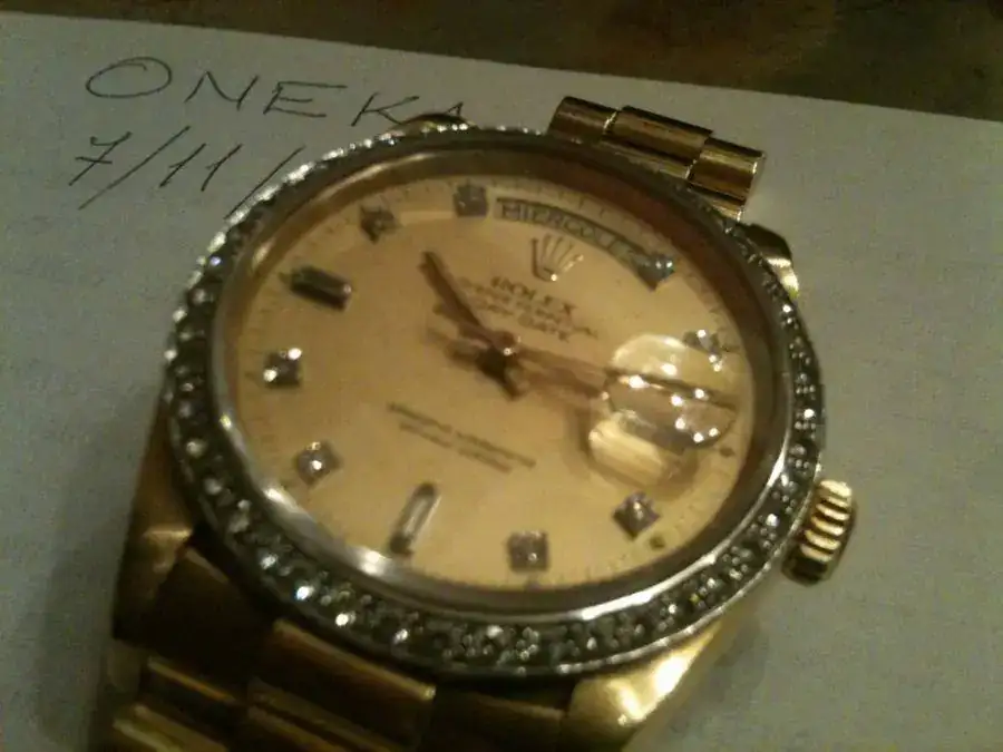 Seguimos con la venta de varios relojes espectaculares de la colección familiar. En este caso se trata de un conocido Rolex Day-Date en oro de 18k, con bisel de diamantes y esfera color champagne con diamantes en talla brillante y baguette.