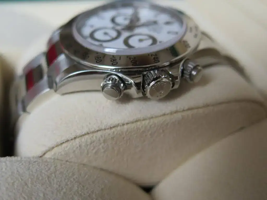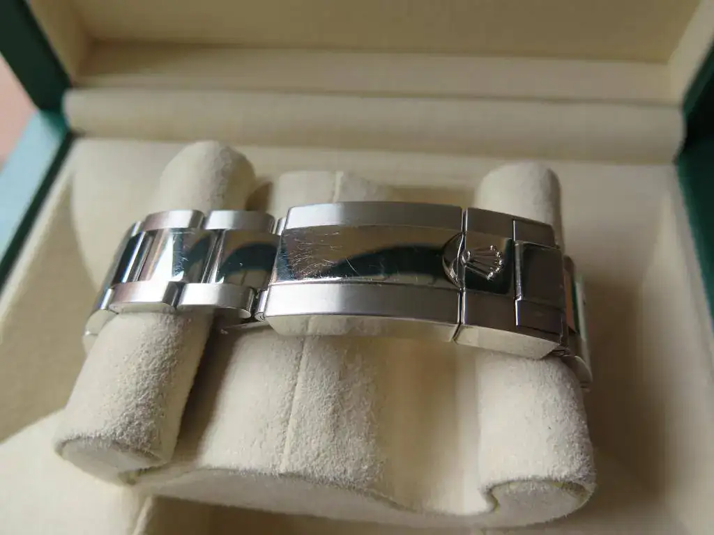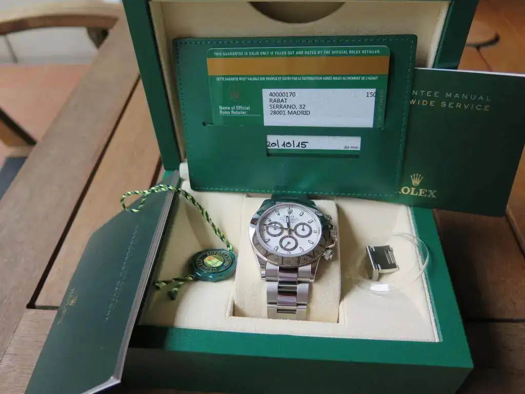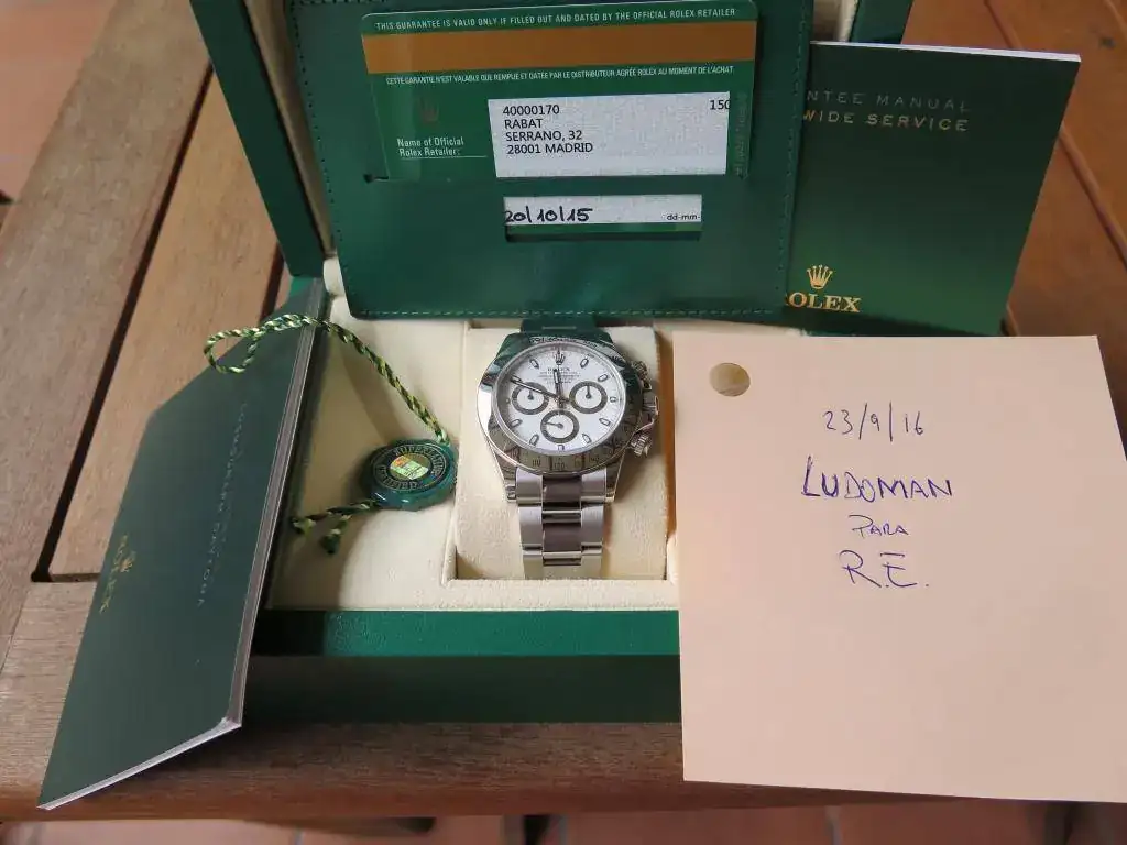 Como estoy reduciendo mi colección, pongo a la venta con muchas dudas este Rolex Daytona comprado por mi en CO nacional, set completo que incluye la caja samoa, así como la caja exterior de cartón blanco y caja verde junto con toda su documentación original como se puede ver en las fotos. El estado del reloj es muy bueno, pero no puedo ponerle la etiqueta de re-estreno porque con el armis pulido a espejo es imposible no tener pelos. A las fotos me remito sobre su estado y he intentado resaltar al máximo los pelos del armis. El reloj no tiene golpes ni daños y sólo destacar un pelo en el bisel entre el 90 y el 100 del taquimetro.