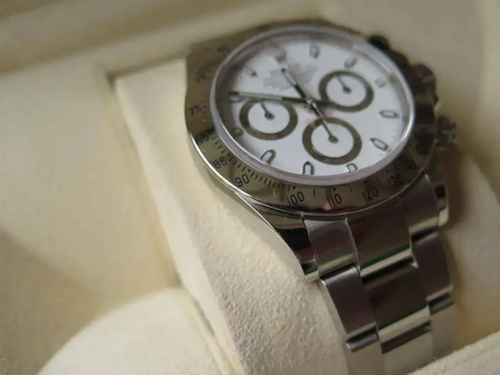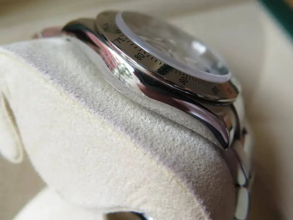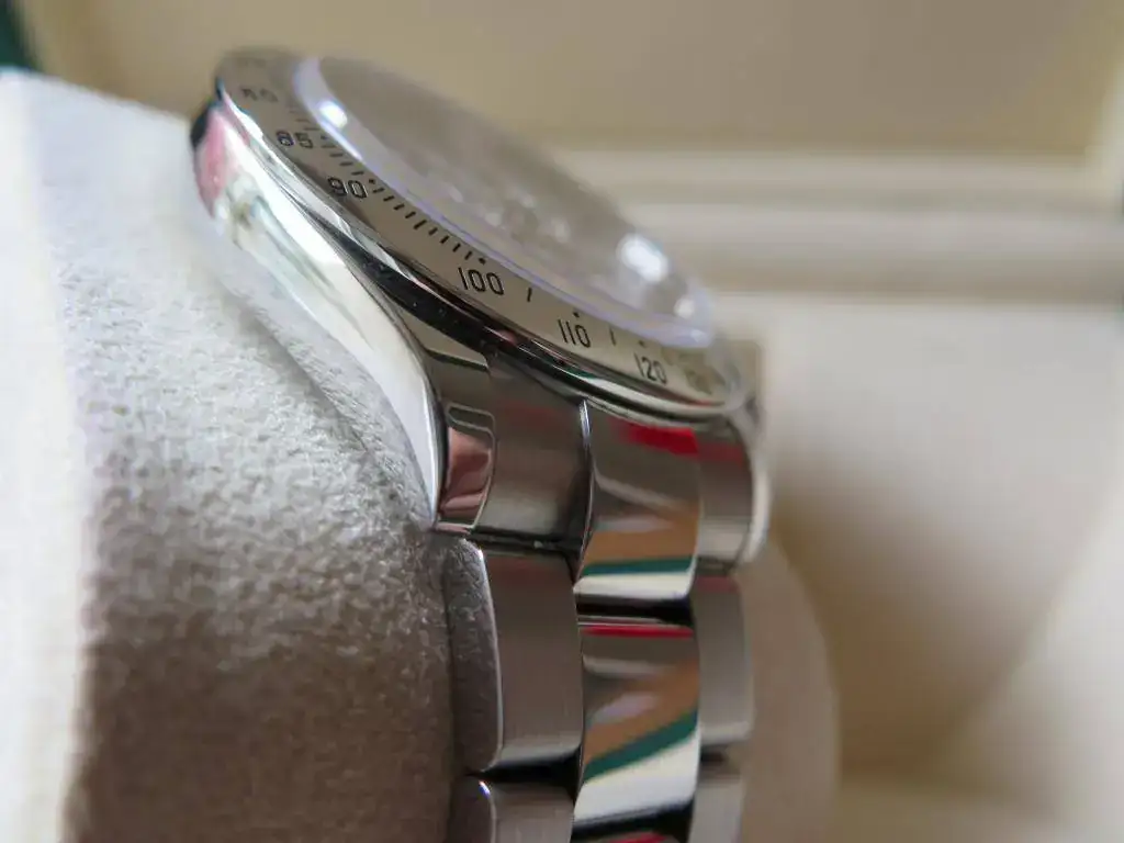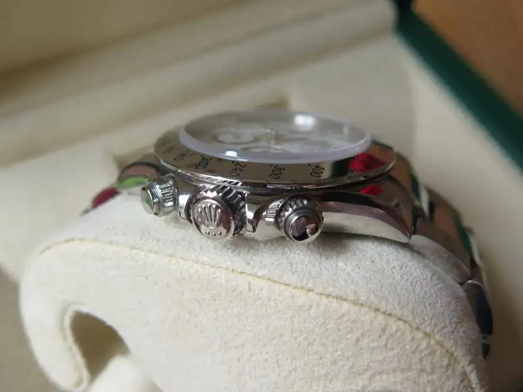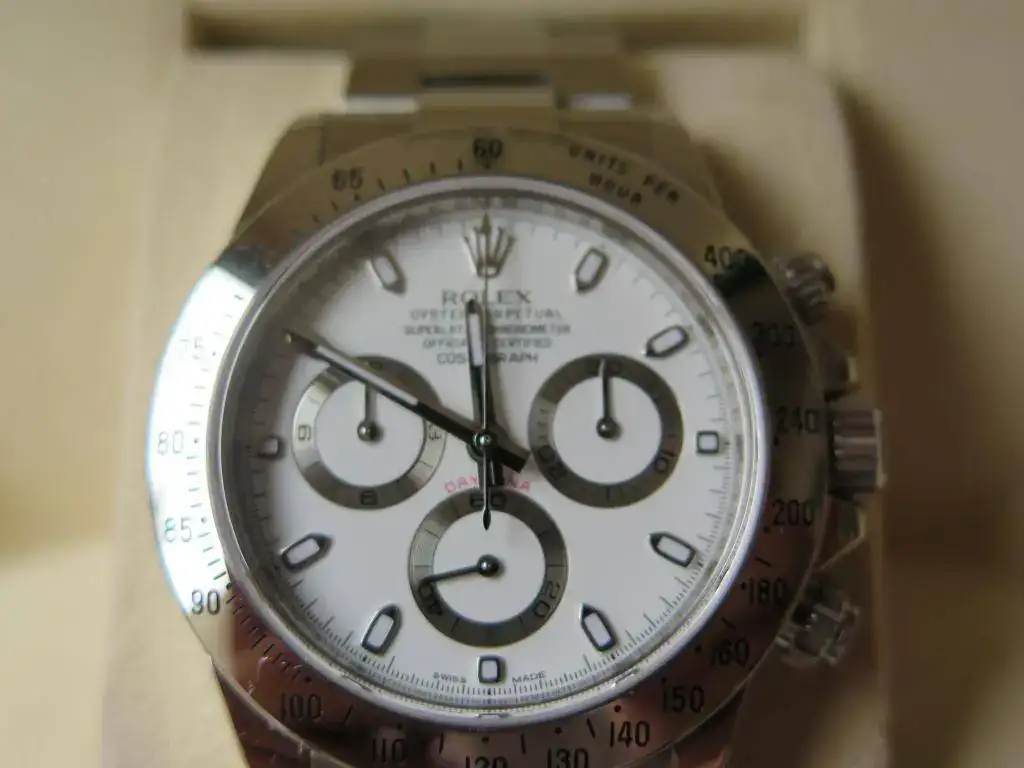 Como estoy reduciendo mi colección, pongo a la venta con muchas dudas este Rolex Daytona comprado por mi en CO nacional, set completo que incluye la caja samoa, así como la caja exterior de cartón blanco y caja verde junto con toda su documentación original como se puede ver en las fotos. El estado del reloj es muy bueno, pero no puedo ponerle la etiqueta de re-estreno porque con el armis pulido a espejo es imposible no tener pelos. A las fotos me remito sobre su estado y he intentado resaltar al máximo los pelos del armis. El reloj no tiene golpes ni daños y sólo destacar un pelo en el bisel entre el 90 y el 100 del taquimetro.
