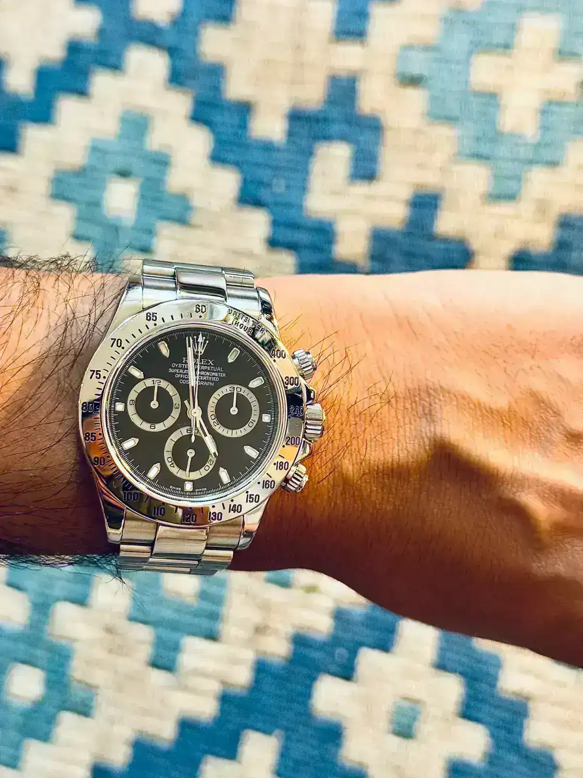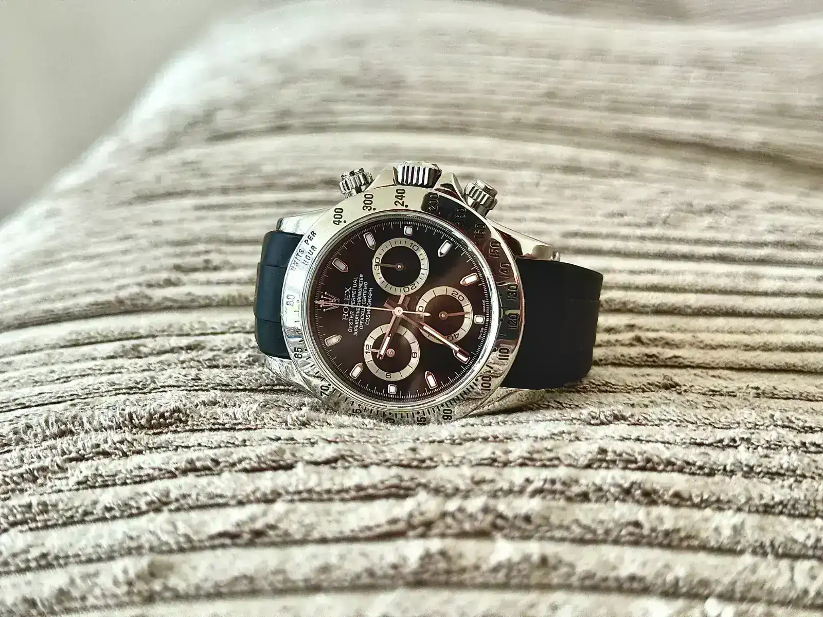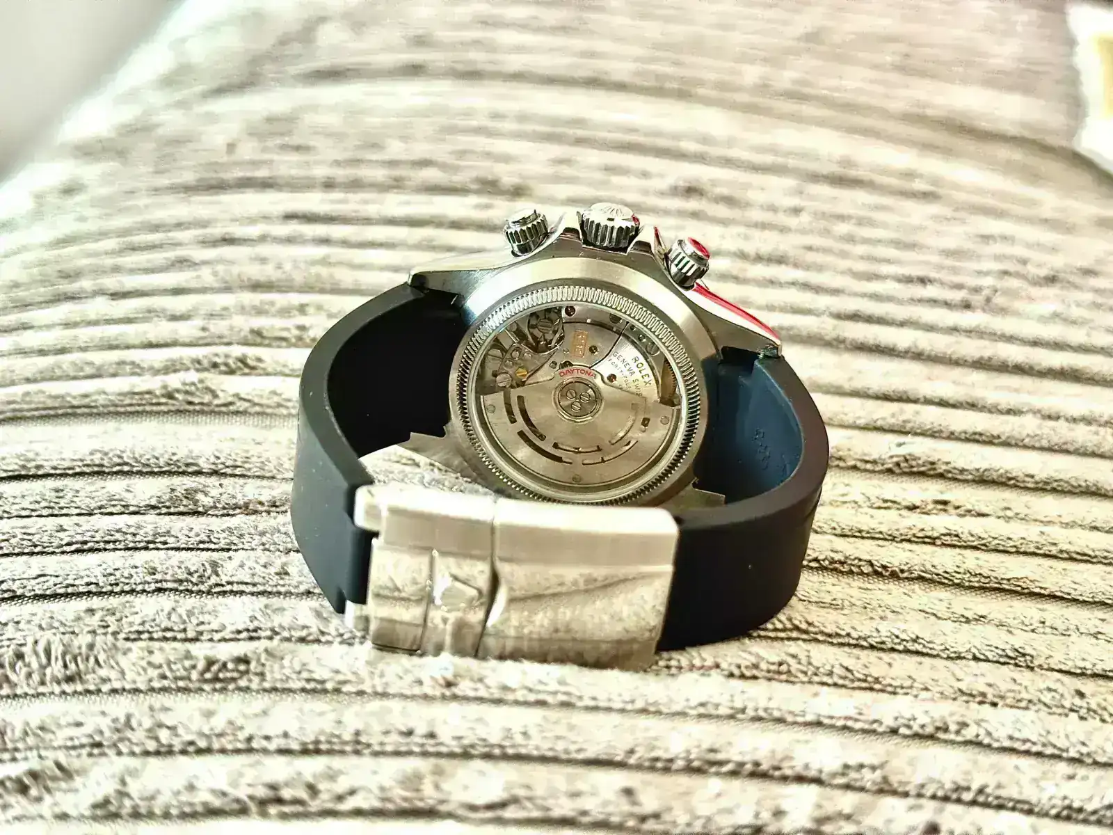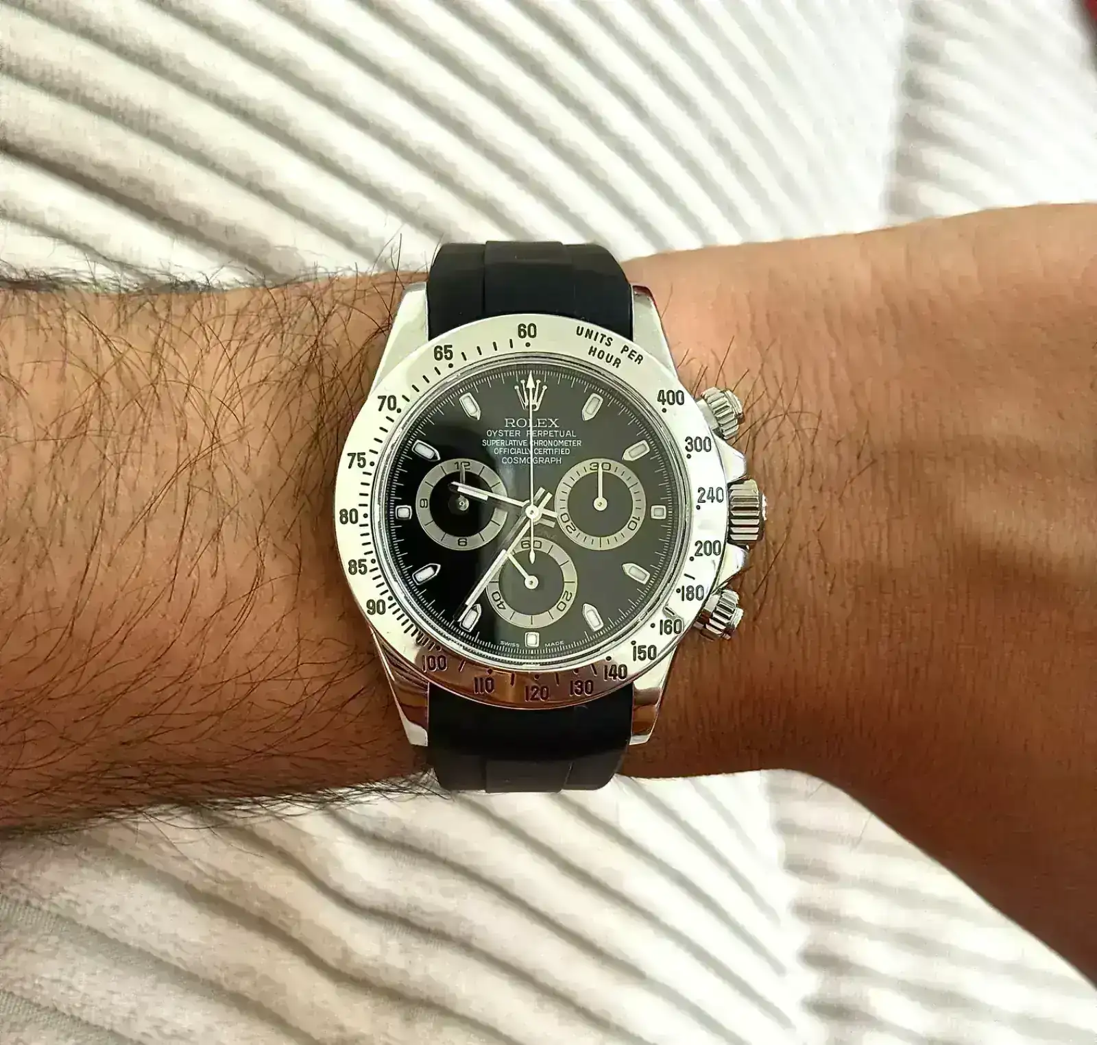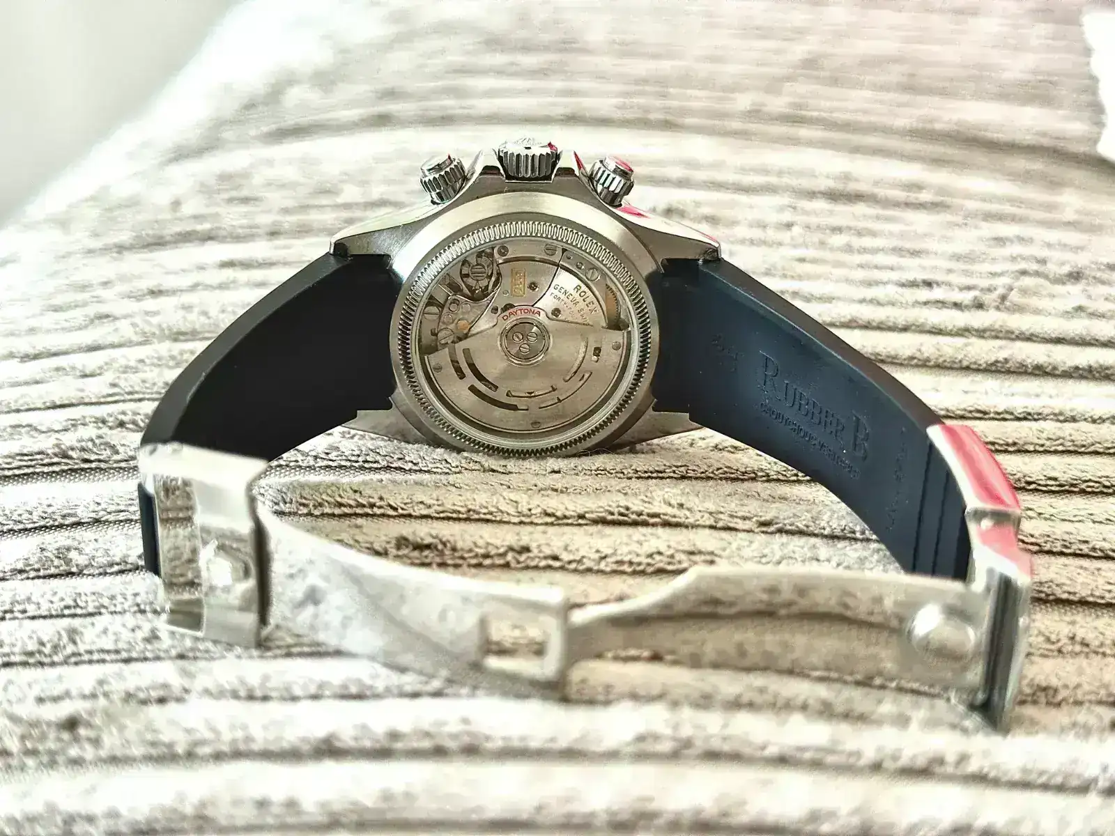 Opino que le queda muy bien el cambio. Yo soy uno de los que cambia habitualmente “de pantalones”.Les comparto unas fotos de mi Rolex Daytona con fondo de zafiro y correa Rubber B. Me encanta cómo se ve el movimiento y lo bien que queda con este look más deportivo.