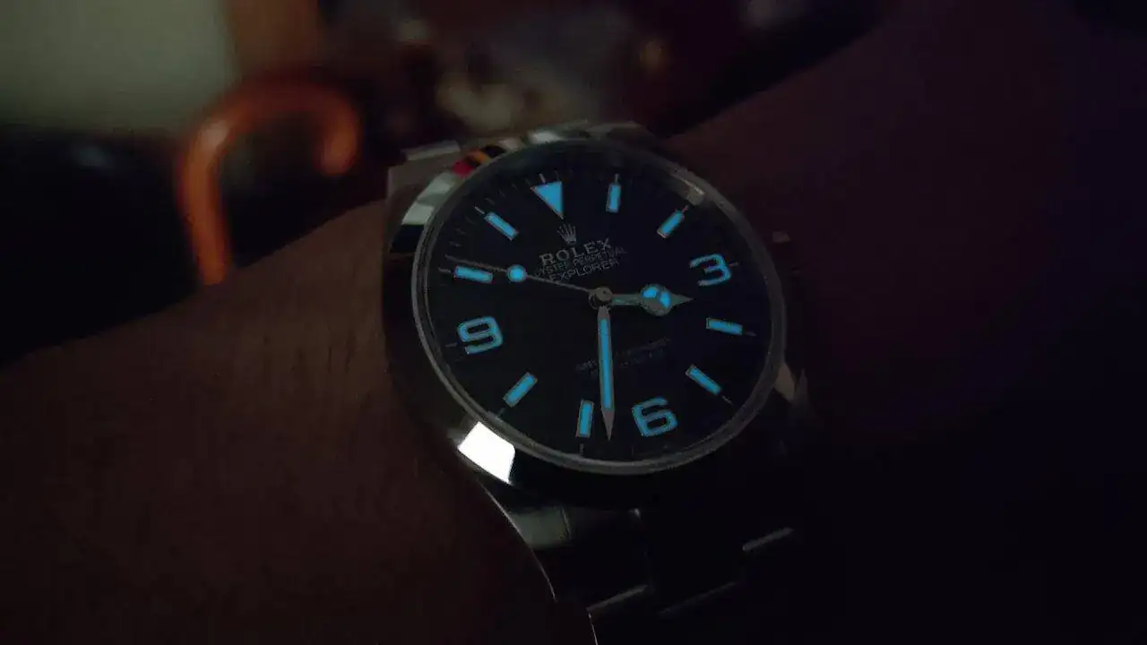 El Explorer lleva un calibre 3230 manufactura de la casa, con 70 h de reserva de marcha. La caja de 40 mm x 46.5 de lug to lug y poco más de 11 de alto. El cristal también de zafiro pero no convexo. Los índices y números 3, 6 y 9 son alpicados. Con buena visibilidad en la oscuridad. Mejor la del Explorer.