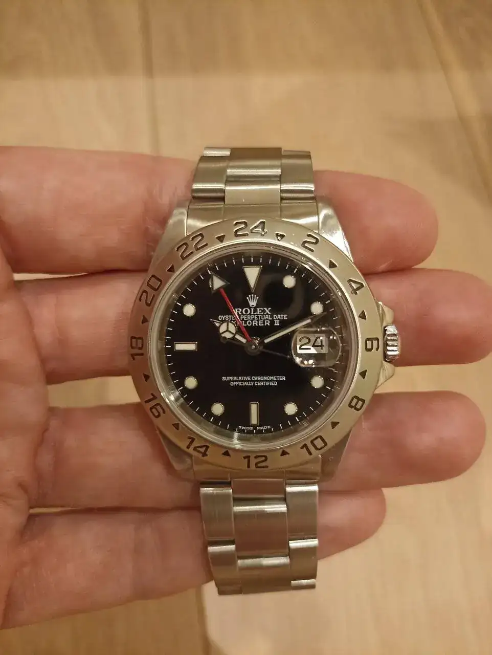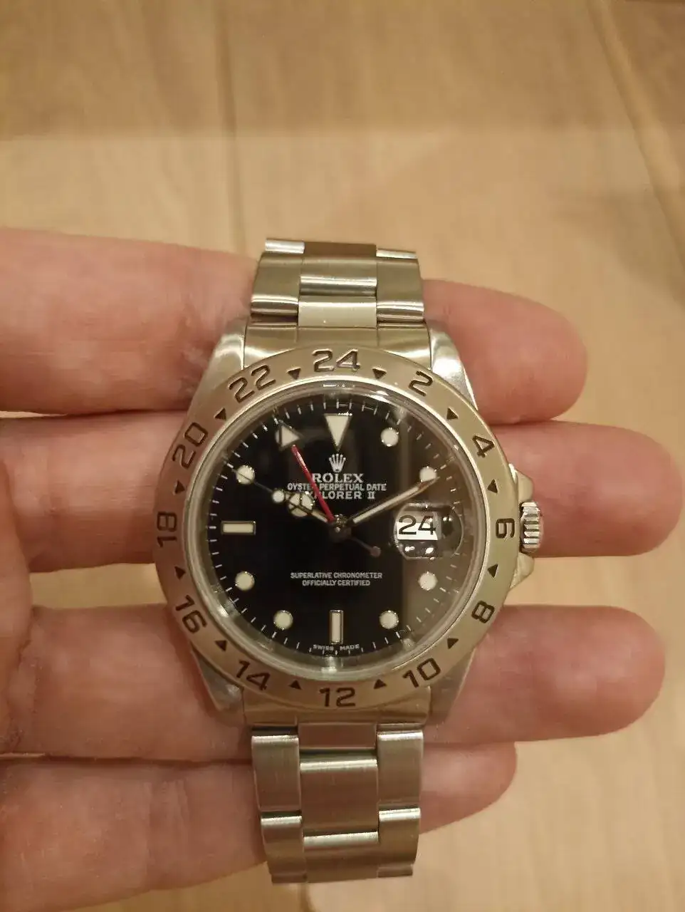 Pongo a la venta este Rolex Explorer II 16570 full set. El reloj fue comprado en el año 2002 en un CO nacional y luego se le hizo una revisión oficial en 2015. En aquella revisión no se le cambio el zafiro a pesar de que estaba marcado. Hace unos meses le pedí a mí relojero que me cambiase el zafiro y le puso uno que no procede de Rolex y el aumento del cyclops es menor (se entrega también el antiguo zafiro). No se le cambio nada más ni se le hizo revisión, salvo engrase del calibre y un ligero pulido para eliminar alguna marca. El brazalete esta completo, menos una malla que ha sido rota de manera voluntaria para ajustar a mi muñeca de menos de 16 (en todo los Rolex de esta época me tengo que cargar la malla 4 por el lado de las 6 para que me ajuste bien y el cierre quede centrado). Podría valorar algún cambio por otro Rolex (36mm), pero principalmente priorizo la venta.