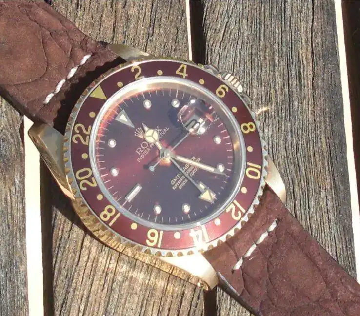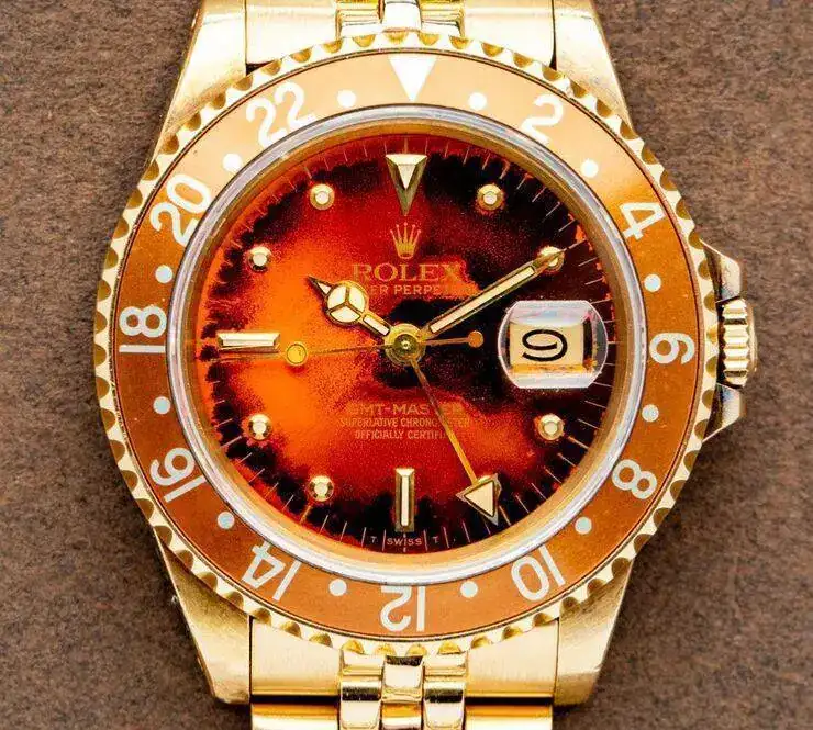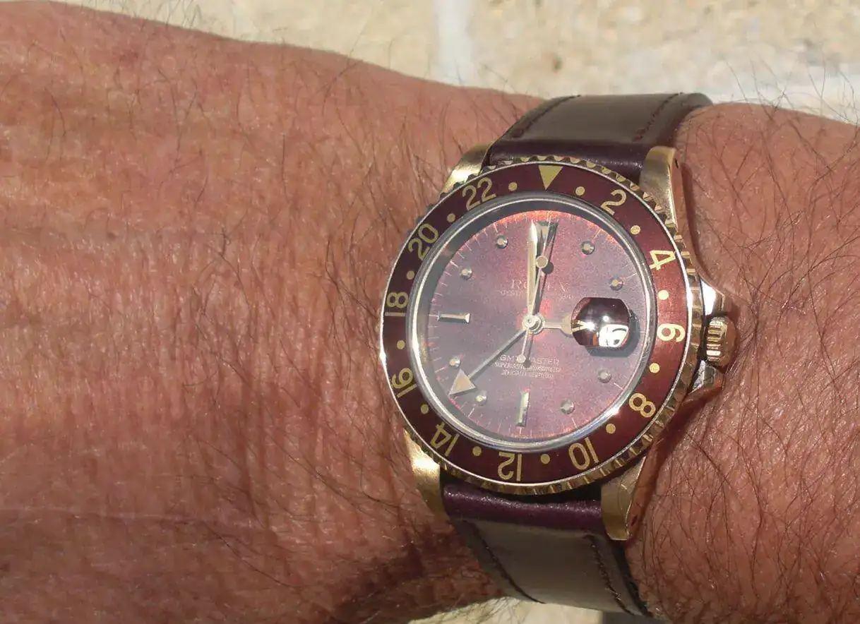 El GMT Master tiene lo mismo que los ROOT BEER, perdida de pigmentos negros y sale un marron.