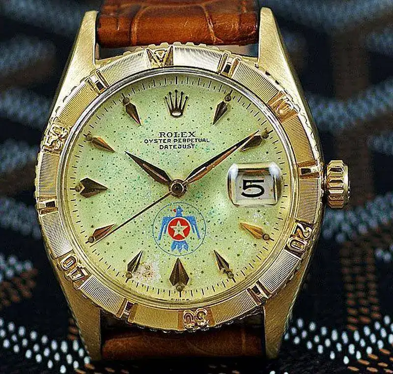Efectivamente el envejecimiento de esta esfera no tiene nada que ver con el Explorer del hilo. Estos puntitos vienen con 60+ anos que tiene este reloj. El escudo es de algun ejercito, probablemete iraqui, saudi, algo de esta zona. Esto sube el valor, porque es un reloj militar autentico.