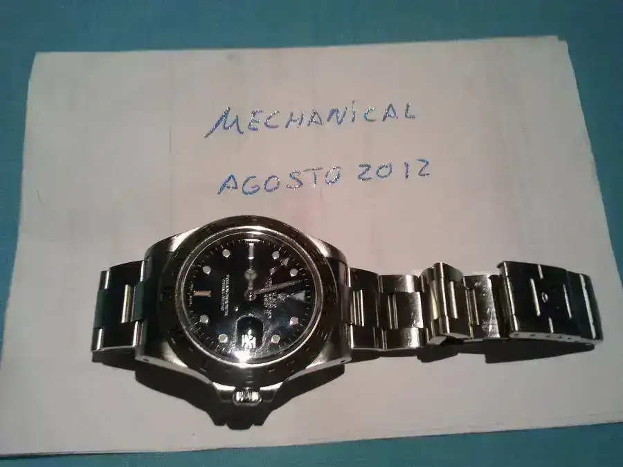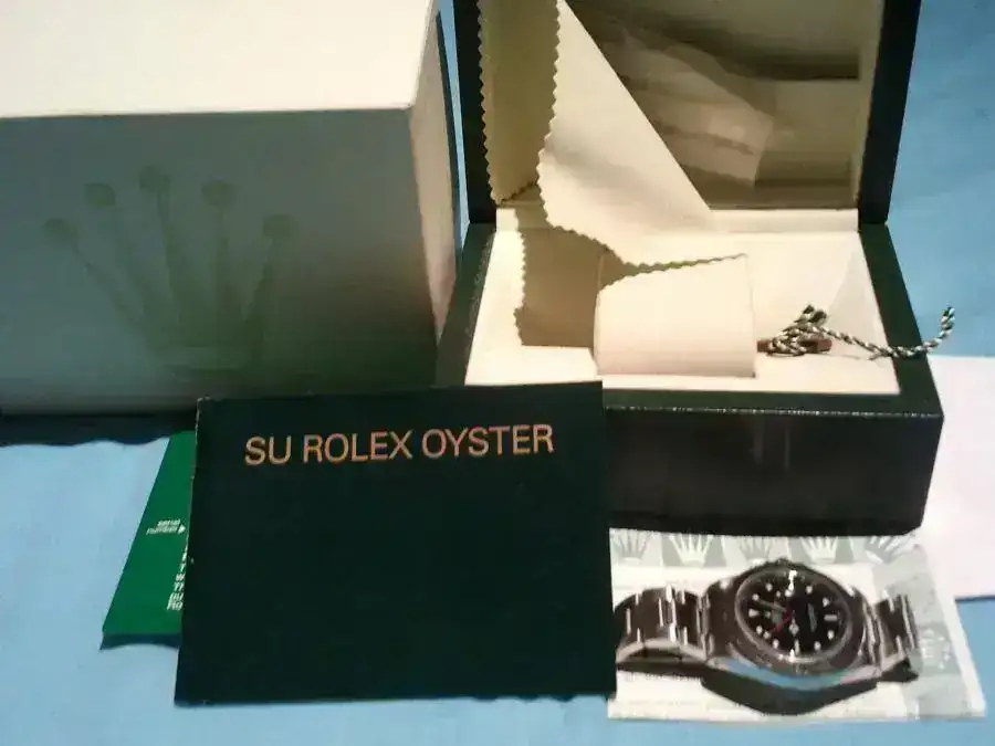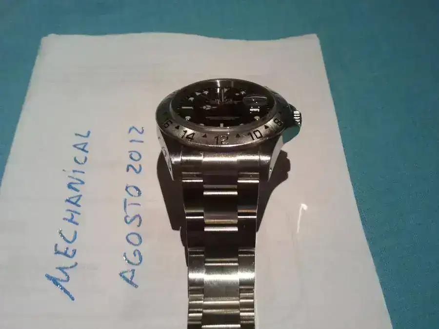 vendo este fabuloso Rolex Explorer II referencia 16570 con esfera negra y agujeros en la carrura. Las características conocidas por todos de 40mm función GMT etc. Año 2001 completo con cajas y papeles, eslabones, sin golpes aunque si marcas de uso normal. A reseñar rozduras superficiales en las puntas de las garras que se irían con un simple estropajo pero, yo paso de quitarlas. El armis lleva eslabons final SEL y carece de ningún tipo de holgura, repito sin holguras. La marcha es estupenda (+3sg/día) y me baño con el o sea que considero que para uso cotidiano, más que de sobra.