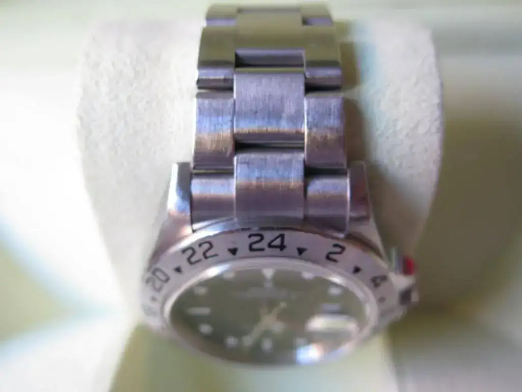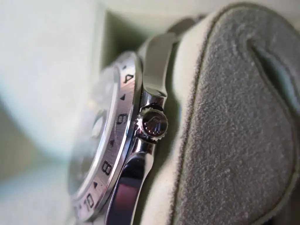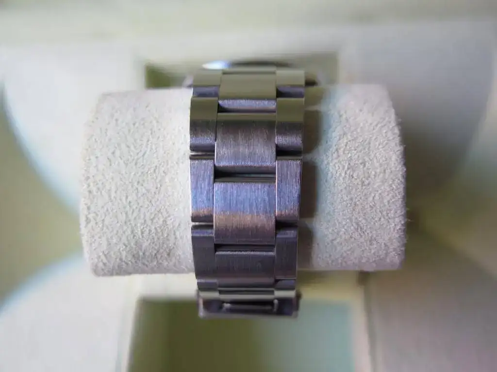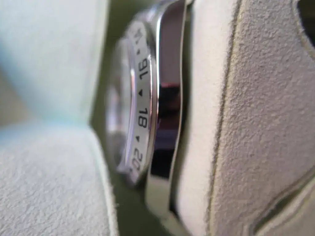 El reloj esta en muy buen estado y a las fotos me remito. Sólo destacar un pequeño roce en el bisel a la altura del 10 que en función de como le de la luz se aprecia una sombra o no. He macro de la misma foto para que se aprecie la diferencia en función de como incide la luz (son las 2 últimas).