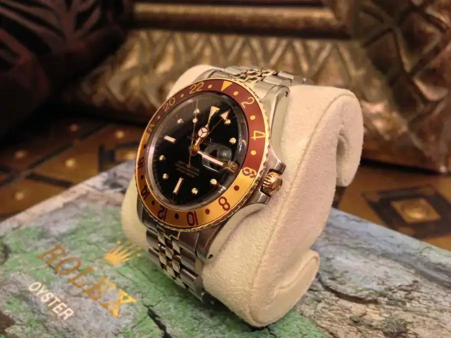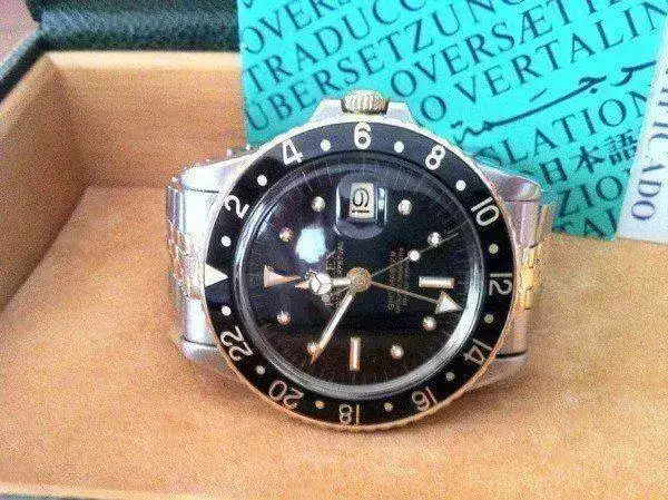 Rolex "Vintage" fabricado en 1969 de la segunda referencia de la gama GMT-MASTER en versión mixta, cristal de plexiglass, bisel negro y esfera "nipple dial" (indices de pezón) en color negro mate. El reloj es completamente "coevo" (caja, armis, cierre, cristal plexiglass , bisel negro, cierre y movimiento son originales y salieron de fabrica con este reloj). El armis tipo Jubilee es completamente original del reloj y de primera serie con broche correspondiente, quizas el mas antiguo con eslabones vacíos y no lleva tornillos para ajuste en ningún eslabón, se ajusta por el cierre o poniendo/quitando piezas en joyero en el mas dificil de los casos.