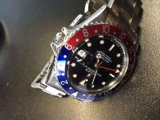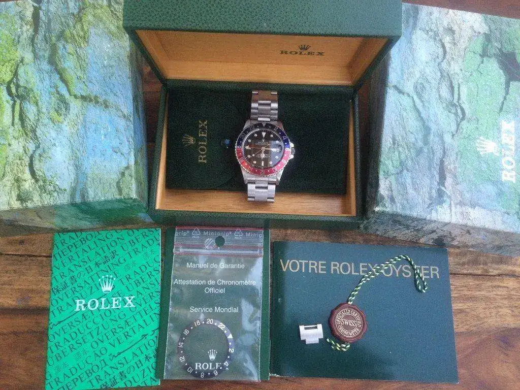 Actualmente tiene un bisel pepsi nuevo, el que se observa en las fotos, pero también entrego el original que montaba la pieza en negro. El set se compone de caja, estuche, funda de viaje, libritos, lacre y eslabón, pero NO dispone de la garantía original.