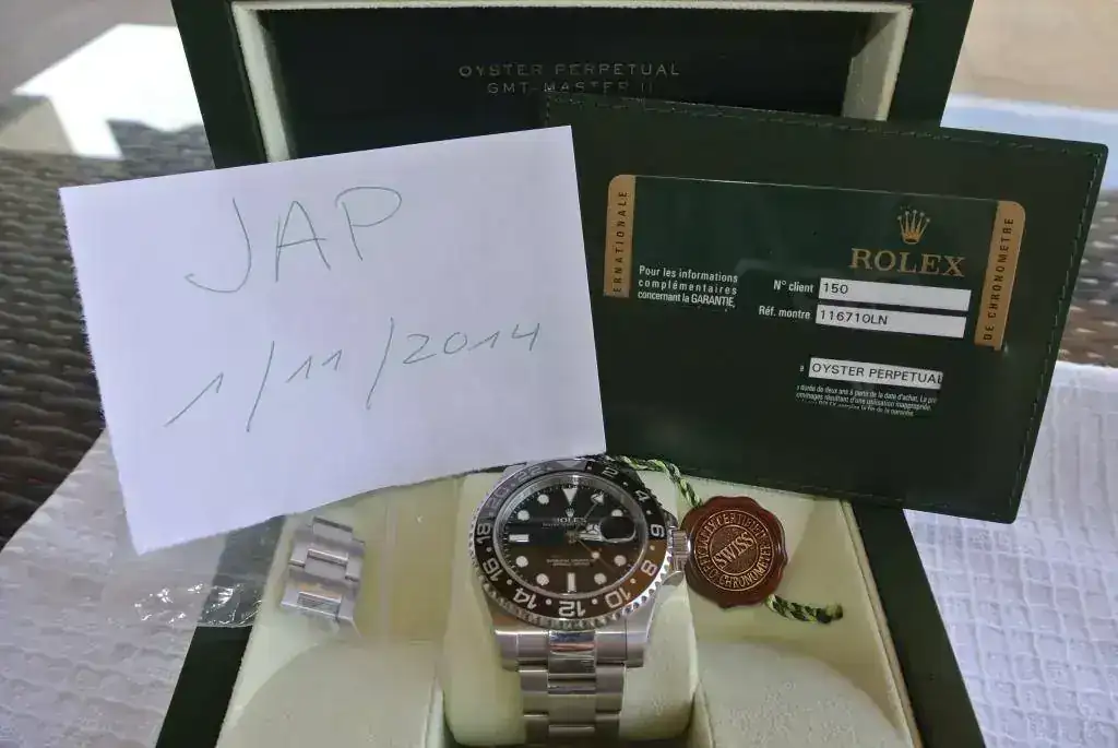 Saco a la venta Rolex GMT Master II 116710LN comprado en CO Barcelona en noviembre 2013, por lo que le quedan 12 meses de garantía oficial. El estado del reloj es muy bueno, con las marcas normales (sobre todo cuando lleva el pulido "espejito") de un uso totalmente cuidadoso, como siempre