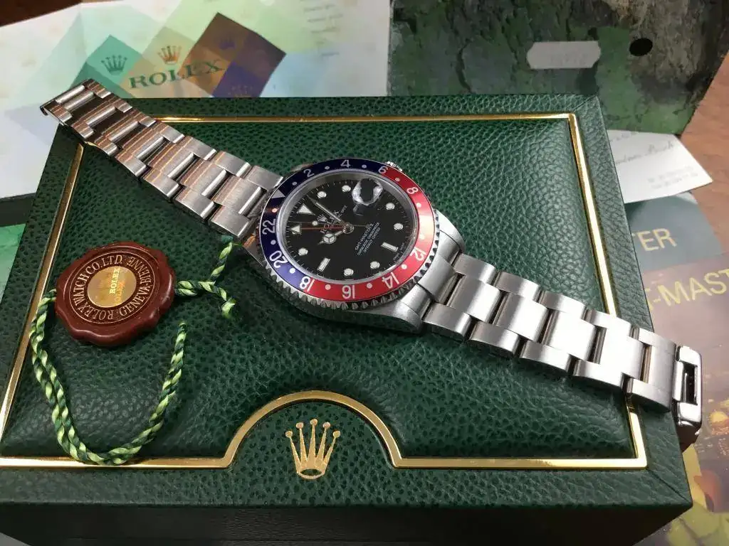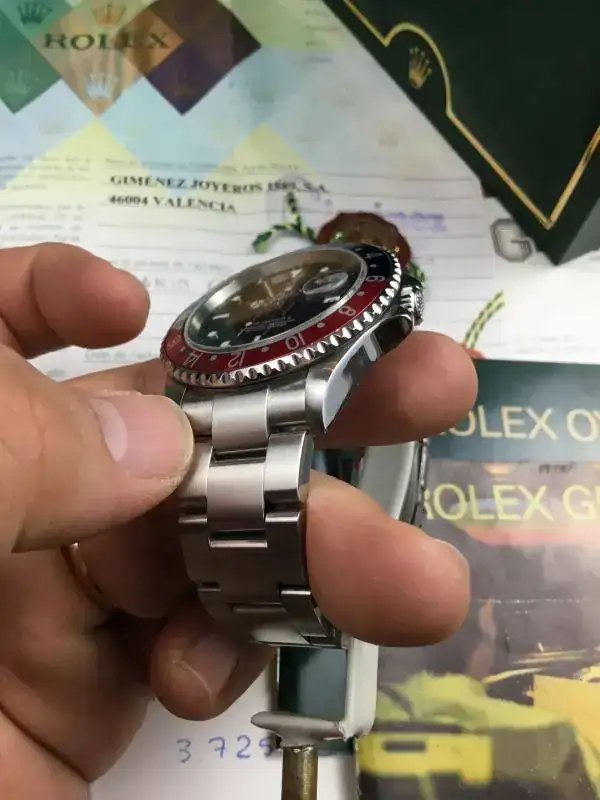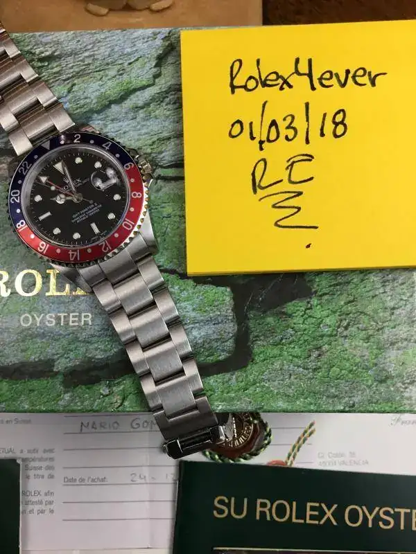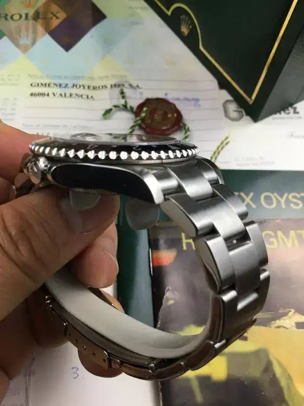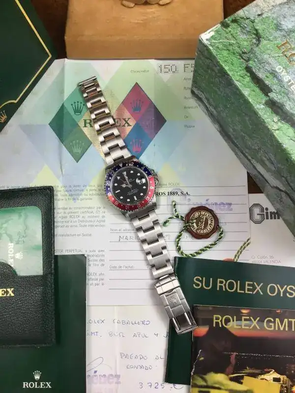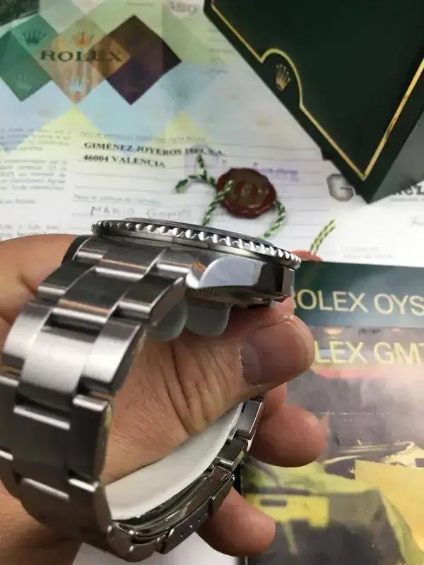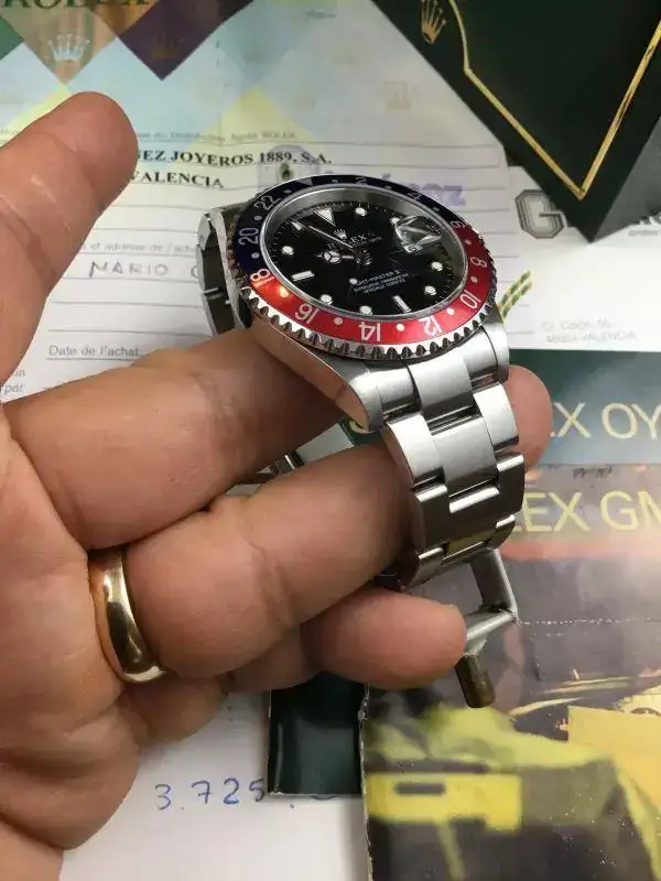 De mi colección vendo este GMT Master II 16710 recién revisado por mi relojero - especialista en Rolex - . El reloj se encuentra en un estado impresionante. En la revisión ha sido puesto a punto y ligeramente pulido y cepillado. Las fotos muestran claramente su excelente condición. El pulido ha sido muy leve ya que el reloj estaba bastante bien.