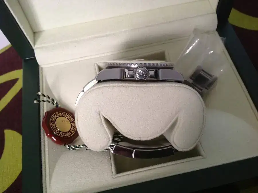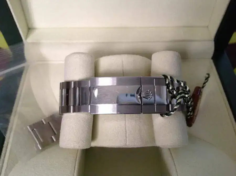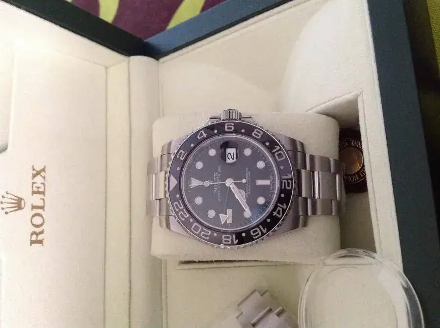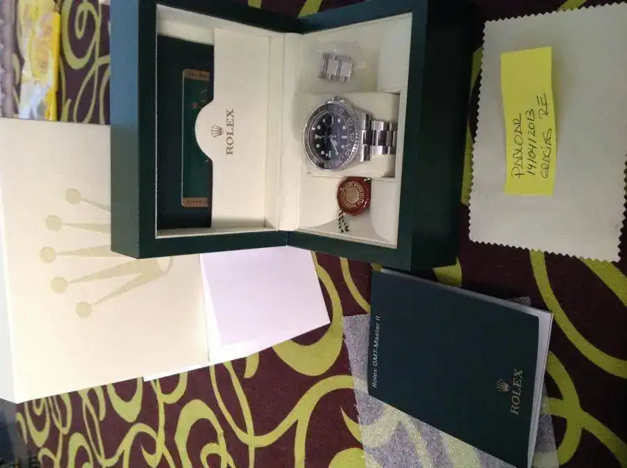Observaciones : Rolex GMT MASTER II modelo con bisel cerámico,cristal de zafiro, aguja GMT verde, fechador a las 3 con lente ciclops. Sumergible 100 metros. Esfera negra con maxi-dial. Aro de seguridad con logotipo y número de serie.