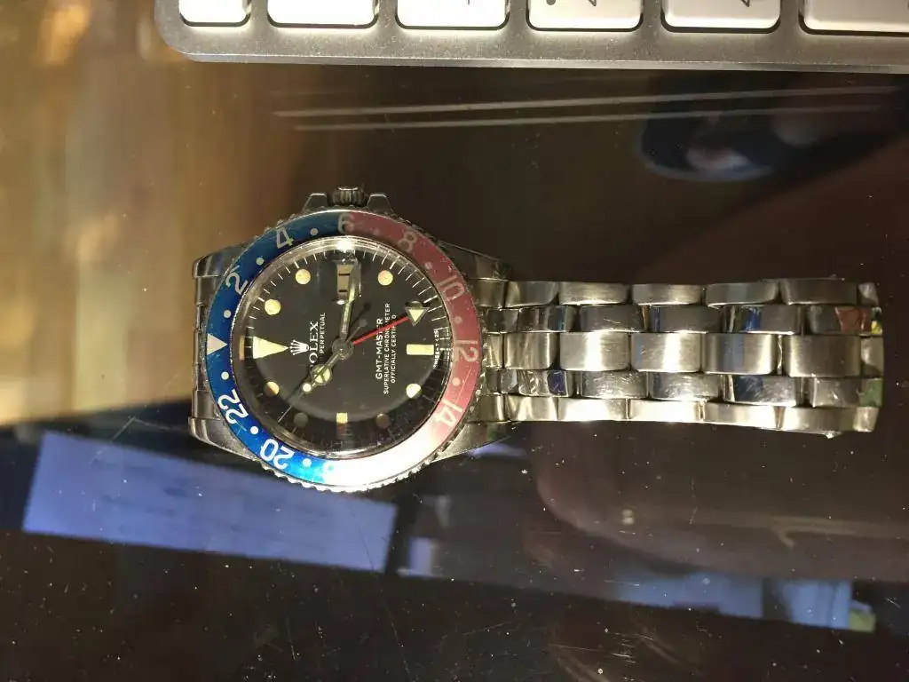 Espero que me podais arrojar luz, soy nuevo en este foro y os cuento lo que me sucede, tengo un Rolex Gmt master, de los que denominan Pepsi no se por que, la verdad es que va muy bien pero necesita repasos ya que fue de mi abuelo luego de mi padre y hace ya unos años mío, el problema es que me temo que llevarlo a la casa a cambiar la correa por la original limpiar los indicadores horarios en forma de puntos y barras y sustituir la corona exterior roja y azul, me va salir por un ojo de la cara y tampoco se si compensa económicamente por lo que pueda valer el reloj a aparte de lo sentimental claro.
