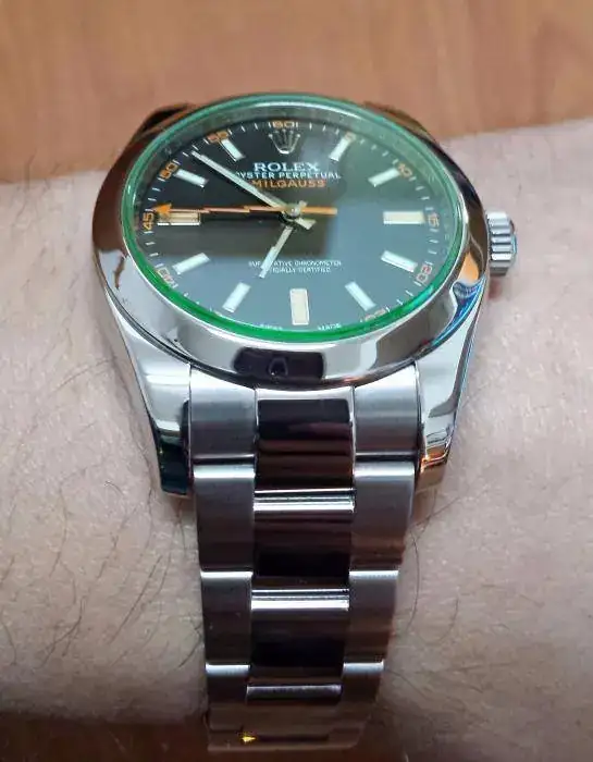 Buenas compañeros, pongo en venta este magnífico Rolex Milgauss GV de abril de 2013. El estado del reloj es simplemente excepcional, algún pelillo inevitable el las zonas pulidas del cierre sólo visibles según incida sobre él la luz, que de hecho me ha sido imposible reflejar en la fotos, por lo demás está impoluto, un 9 sobre 10 siendo crítico. Se entrega con caja blanca exterior, caja verde, toallita, libreto Milgauss, libreto COSC y tarjetero verde con tarjeta de garantía sellada y cumplimentada. Faltaría el lacre rojo que no lo traía cuando lo adquirí y el protector de plástico del bisel, que desconozco si lo trae este modelo, pero por sí acaso lo menciono. El precio que le pongo a este espectacular reloj es de 4200 euros con envío a través de MRW 24 horas sin asegurar, aunque prefiero entrega en mano en Pamplona o alrededores. Cualquier otra opción de envío sería por cuenta del comprador. No deseo cambios. Un saludo y felices fiestas.