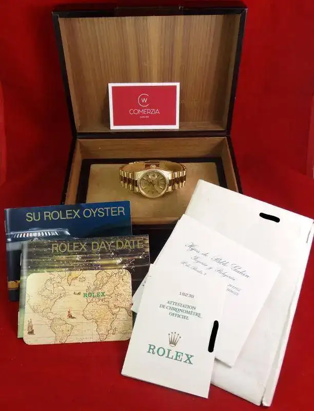 El reloj fue adquirido en 1989 en CO nacional. Se incluye la factura original de compra. Se encuentra en un estado realmente excelente como se puede apreciar. Incluye todo el set, formado por garantía, manual oyster, manual day date, calendario, cartera, factura y caja de piel.