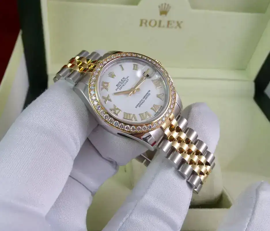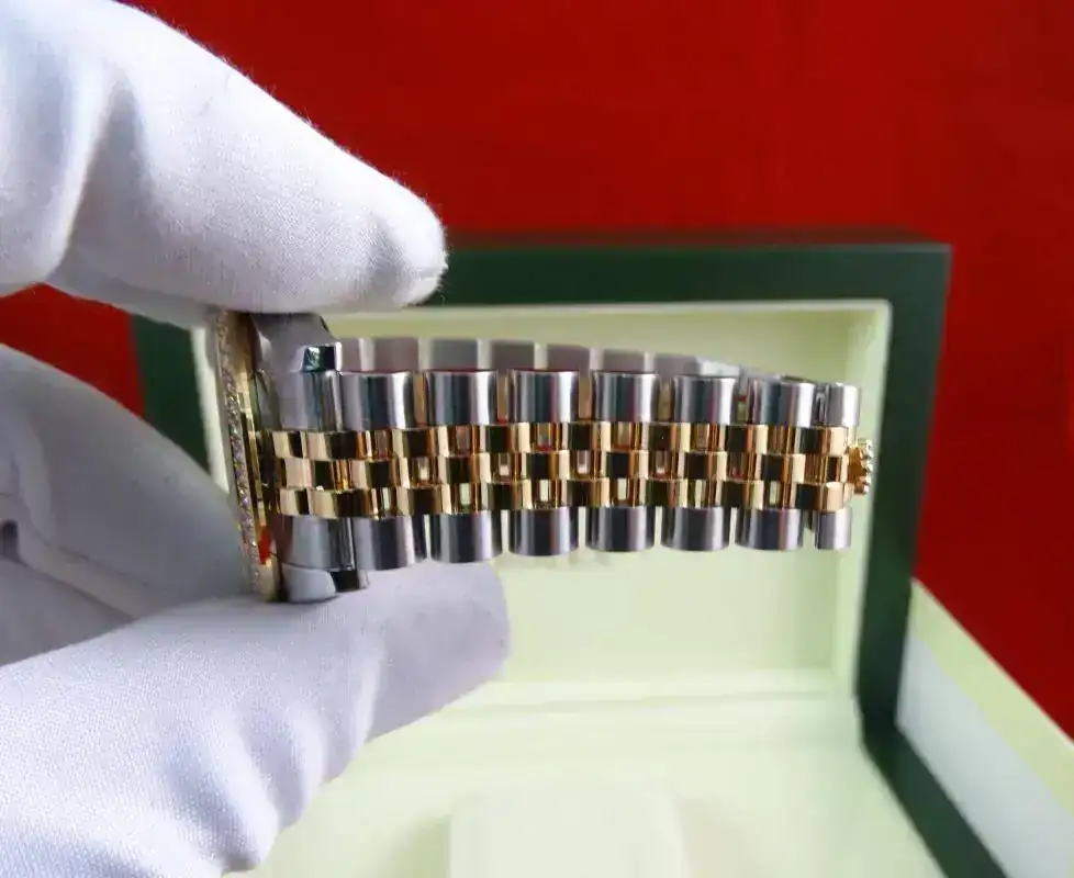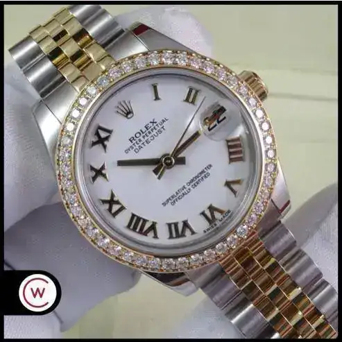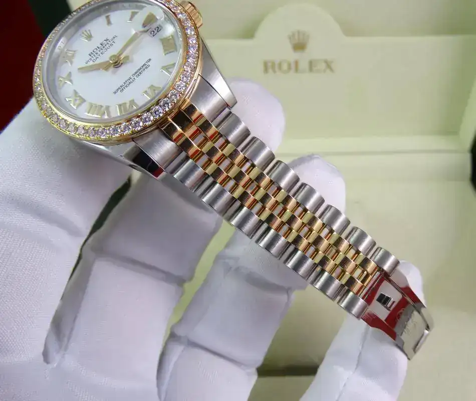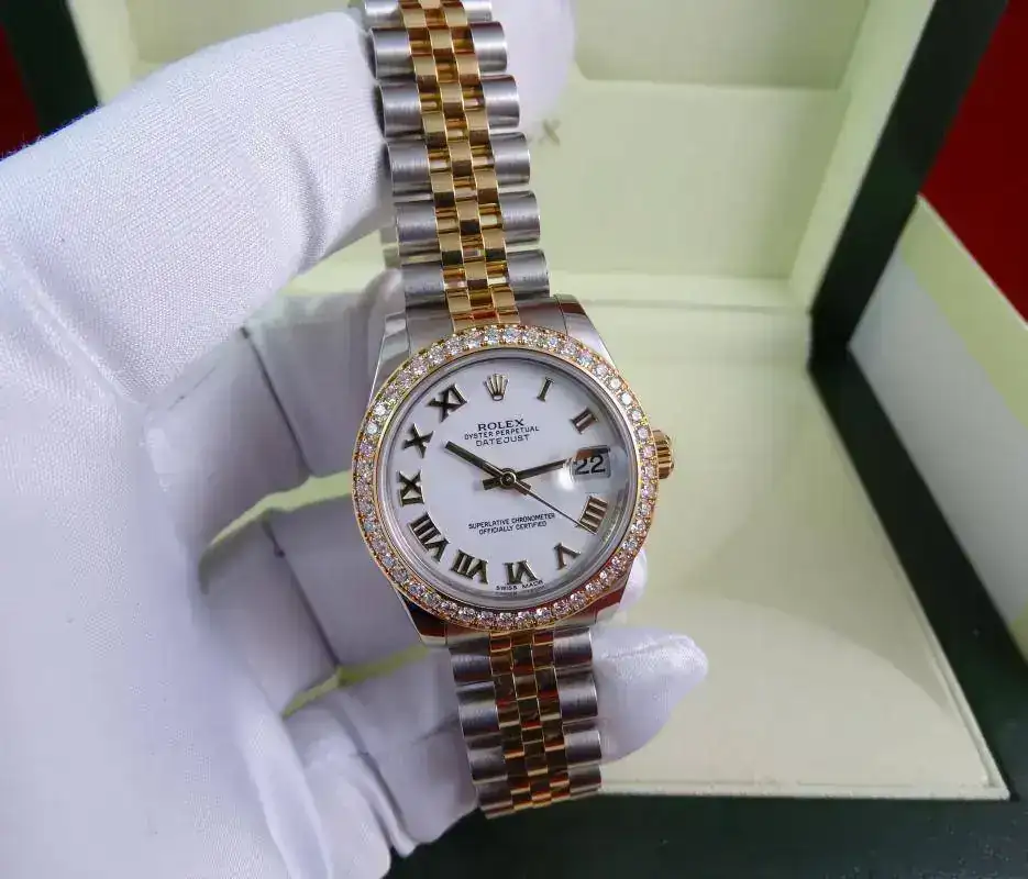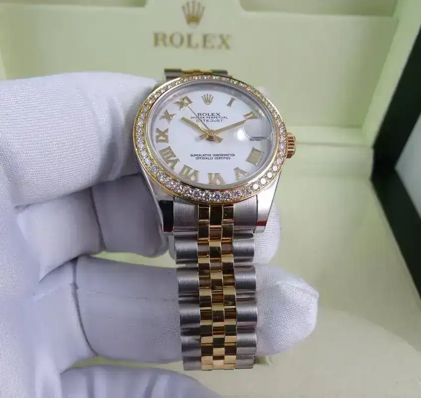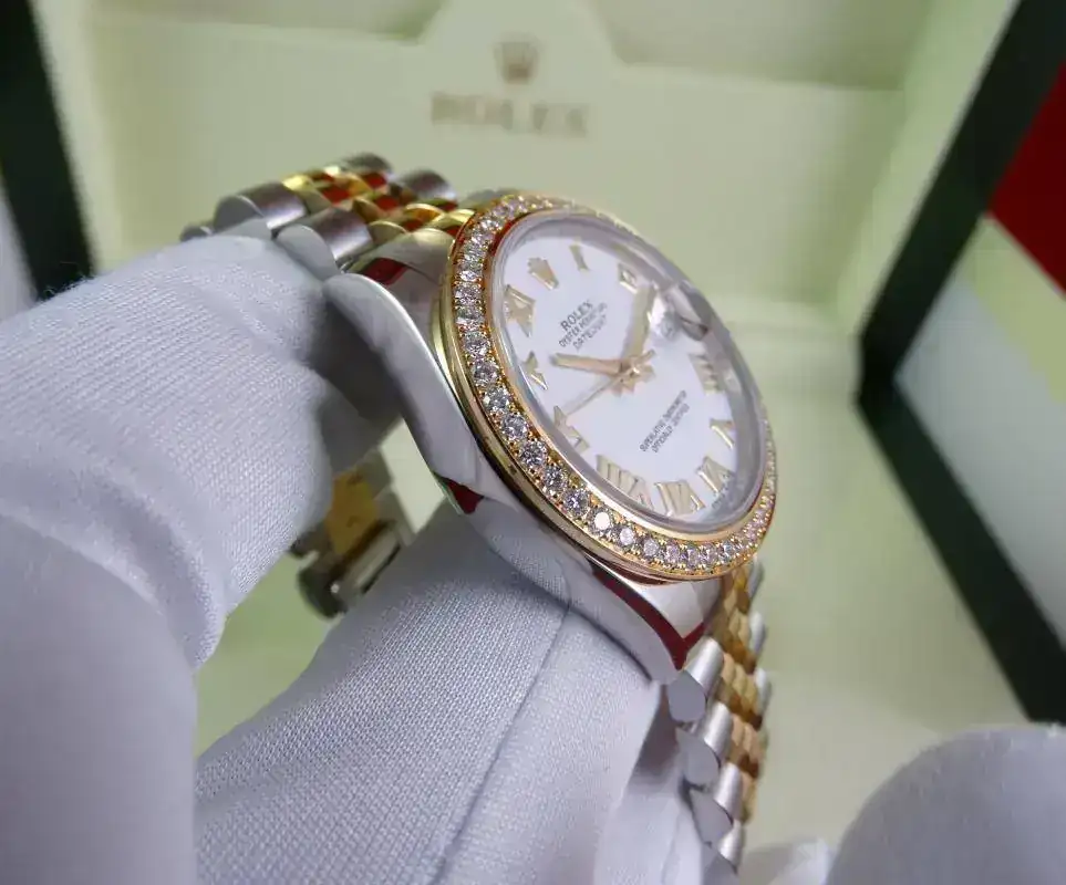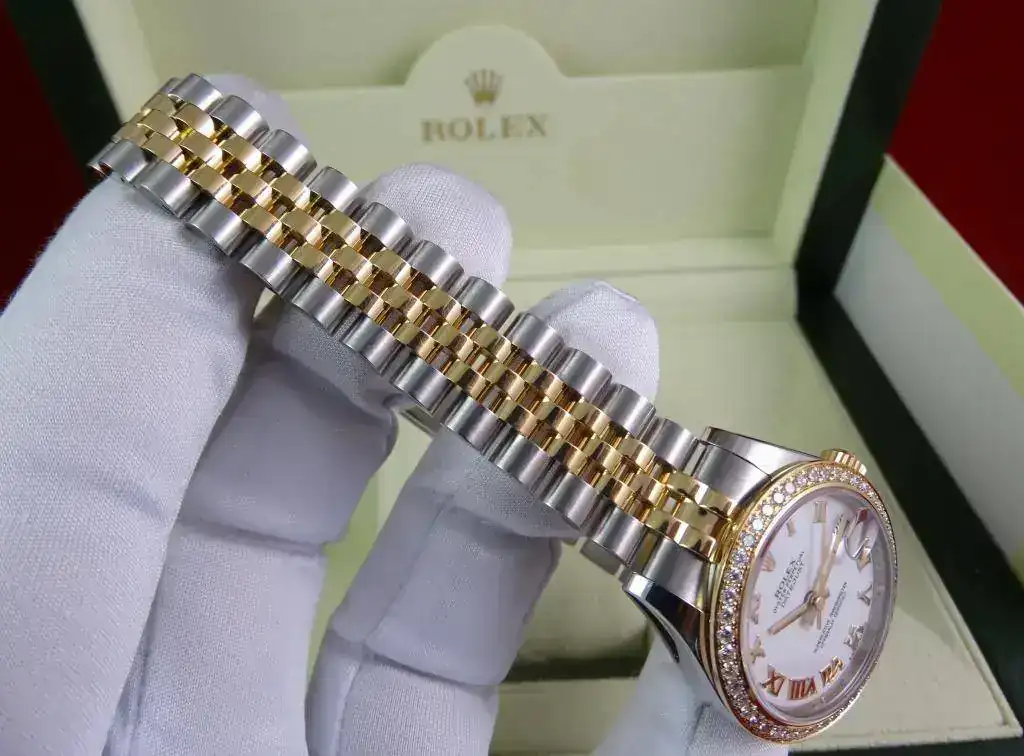 Uno de los modelos más vendidos de Rolex es el Datejust sin lugar a dudas, en todos los tamaños ofrecidos por la firma suiza. Una de sus configuraciones más exitosas es el modelo rolesor, mixto con esfera blanca e índices romanos, brazalete jubilee, y, en este caso, un plus al reloj con el bisel de brillantes. Es importante indicar que este modelo es configurado con dicho bisel en Rolex, no es un modelo modificado a posteriori. Un reloj con el tamaño ideal para muñecas comedidas y gustos de relojes que sean de fácil lectura, pero de tamaño ajustado. Una auténtica joya.
