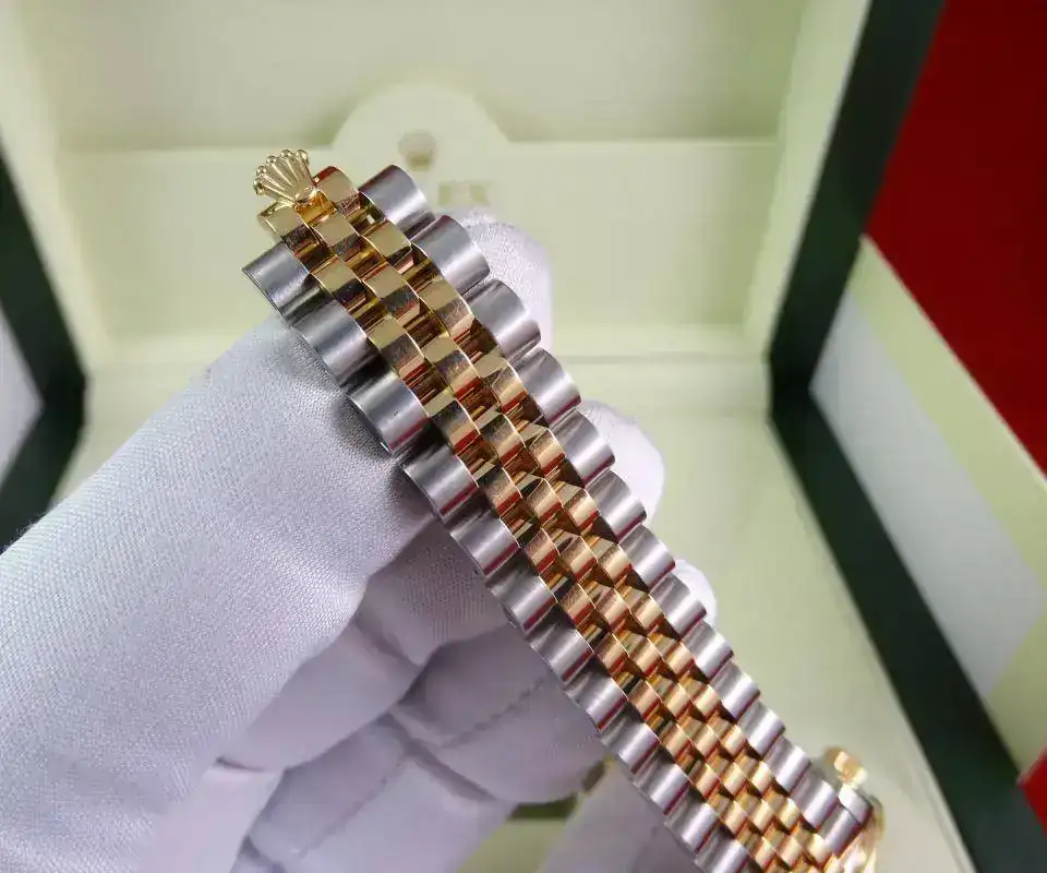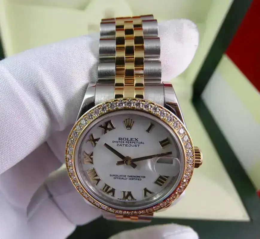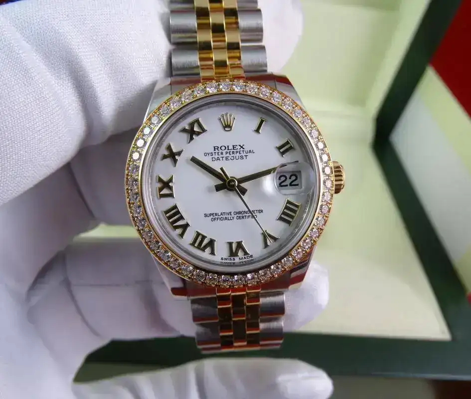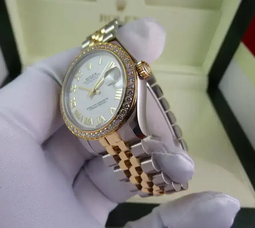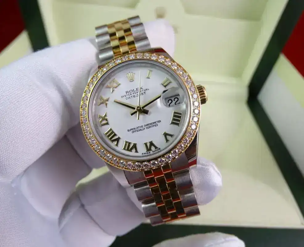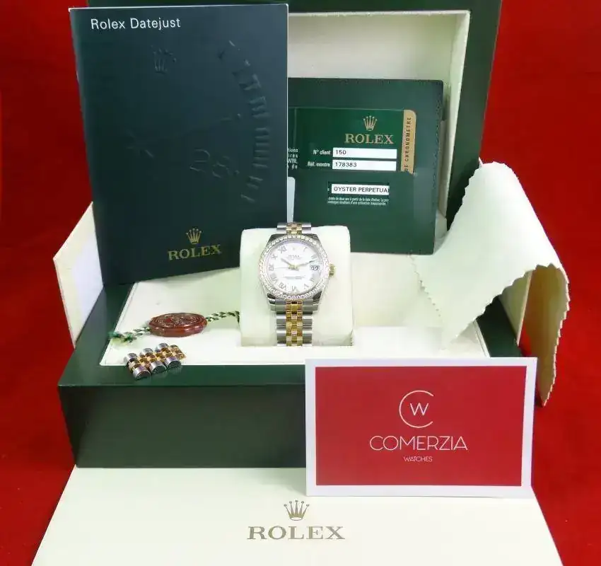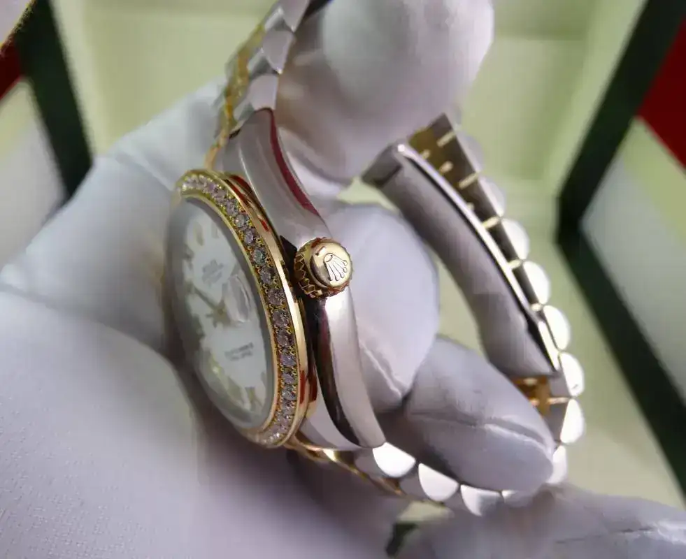 Uno de los modelos más vendidos de Rolex es el Datejust sin lugar a dudas, en todos los tamaños ofrecidos por la firma suiza. Una de sus configuraciones más exitosas es el modelo rolesor, mixto con esfera blanca e índices romanos, brazalete jubilee, y, en este caso, un plus al reloj con el bisel de brillantes. Es importante indicar que este modelo es configurado con dicho bisel en Rolex, no es un modelo modificado a posteriori. Un reloj con el tamaño ideal para muñecas comedidas y gustos de relojes que sean de fácil lectura, pero de tamaño ajustado. Una auténtica joya.