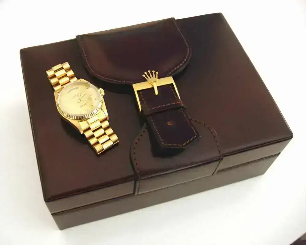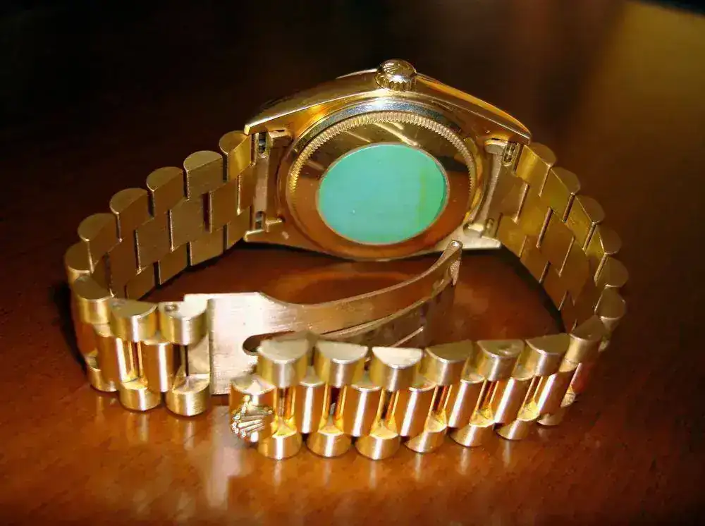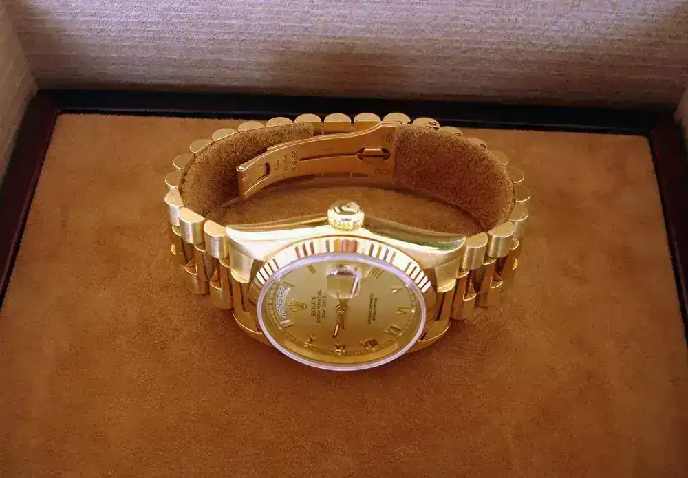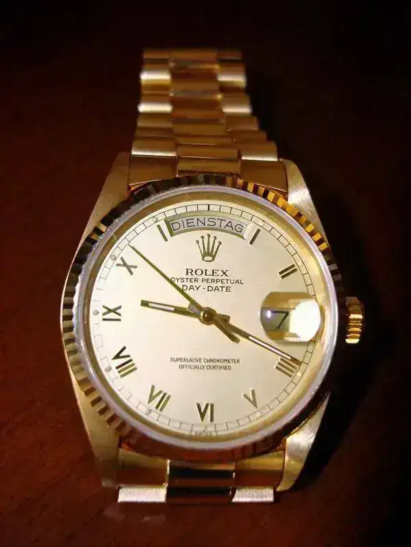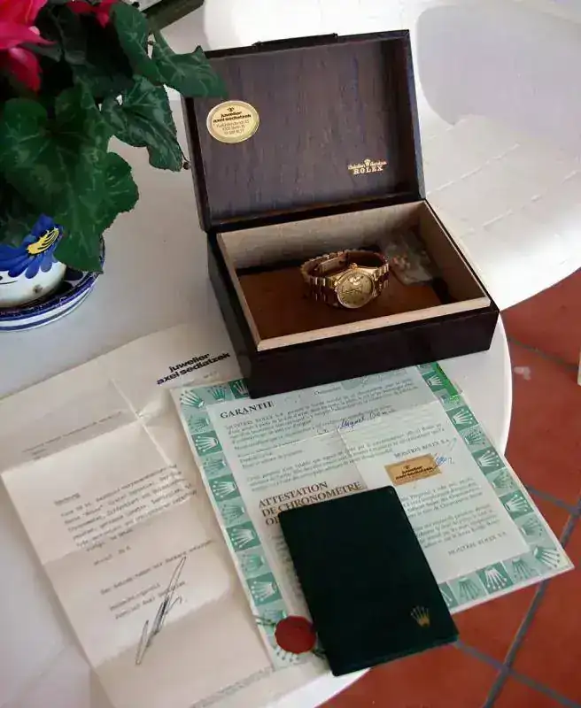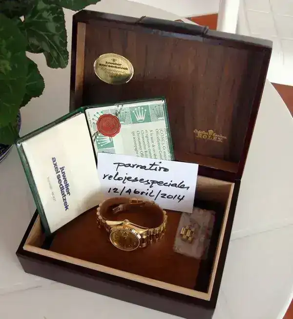 Rolex Oyster Perpetual Day-Date Chronometer, en oro Amarillo 18kt., caja de 36 m/m, dial Champagne con indices en numeros romanos de oro, Bisel acanalado, Cristal zafiro y armis President con cierre oculto sin ningun tipo de olguras. El reloj está como nuevo y sin uso,( fecha de compra 10/08/89 adjunto factura de compra ademas de toda la documentacion de casa ) tan solo puesto algunas veces en casa, para mover la maquinaria. Tiene su caja nueva original de piel, y el certificado numerado. No lo he usado por resultarme excesivamente lujoso. El envio se realiza sin cargo, asegurado y a través de la empresa de transporte urgente MRW.