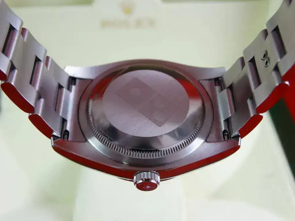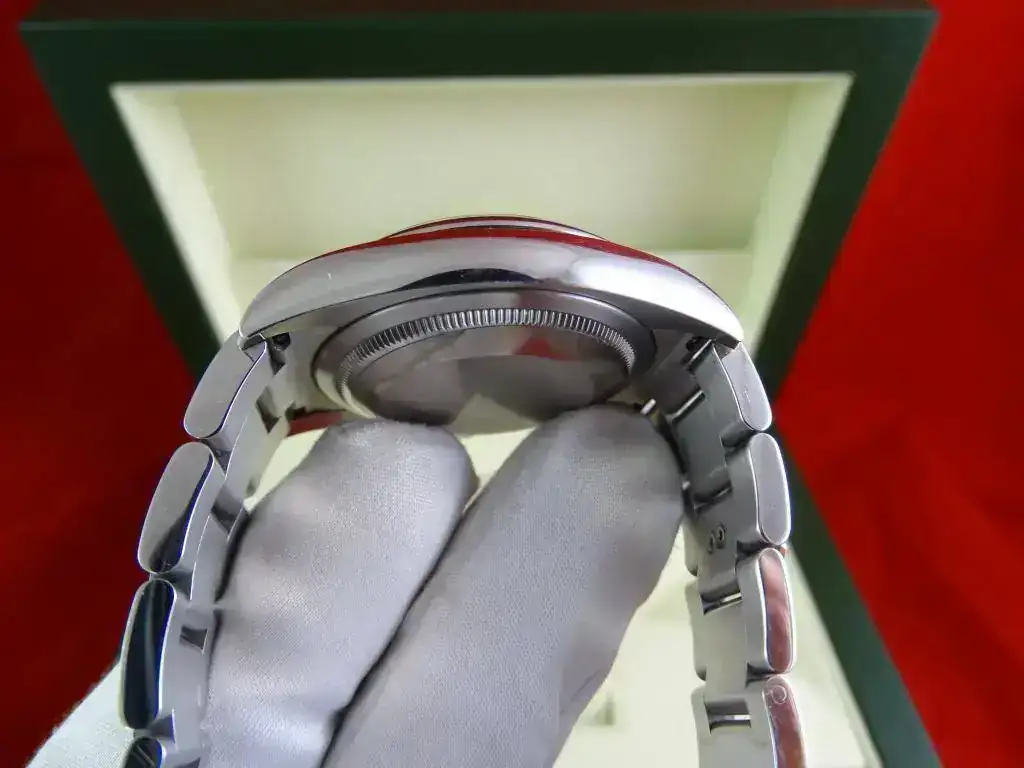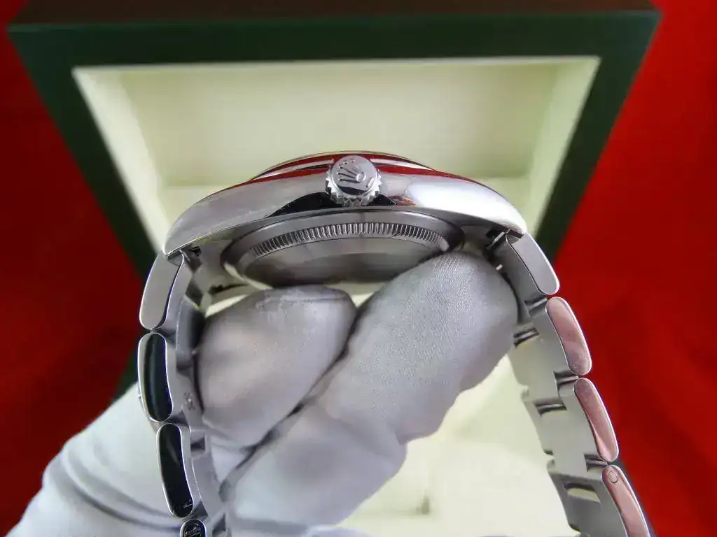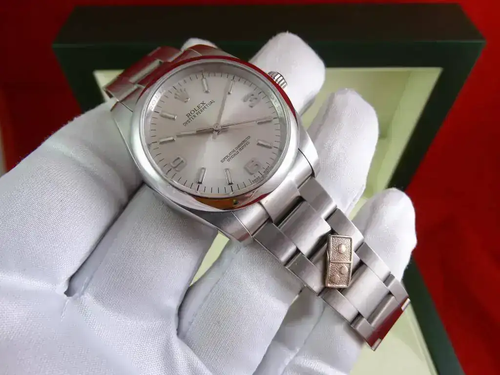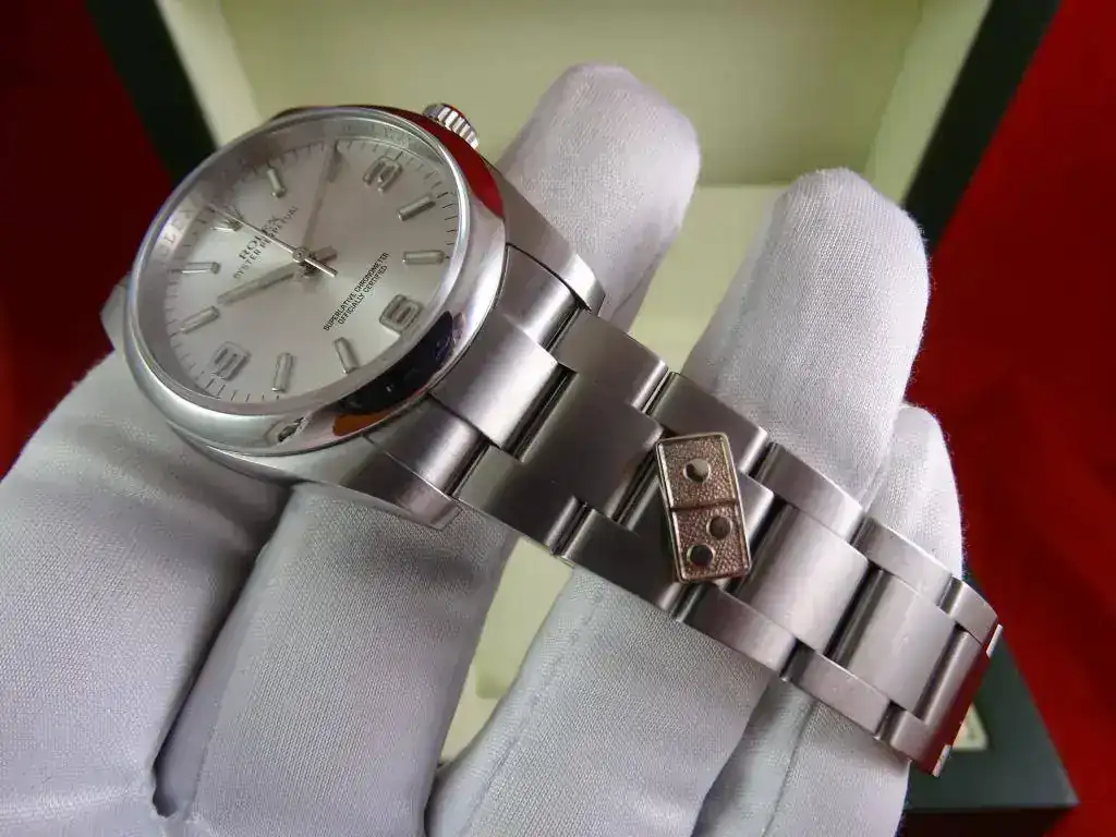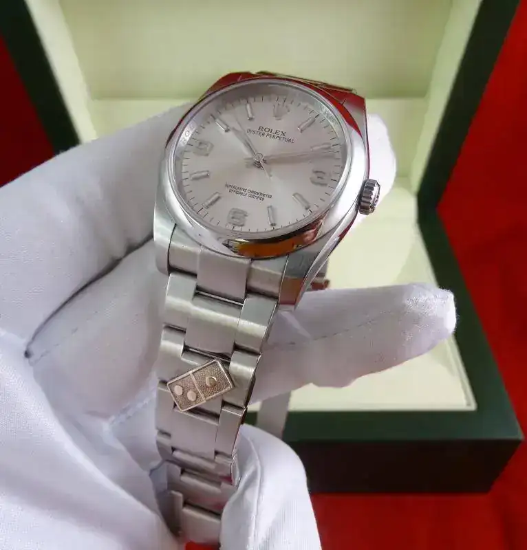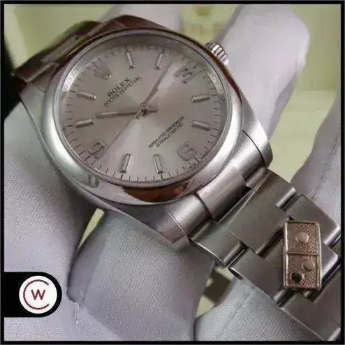 El reloj es un clásico de ROLEX, y representa el acceso a la marca. Con medida de 36 mm, y el brazalete de acero, en la muñeca tiene presencia suficiente, también en el caso de muñecas medias y grandes, precisamente por no ser un deportivo puro. La esfera plata, realzada por los numerales arábigos 3-6-9 (un magnifico detalle) y el anillo de seguridad, le confieren un aspecto gran calidad, y la ausencia de fecha (y la consiguiente lupa) hacen que el reloj parezca mas grande que otros modelos de 36 que sí la incorporan.