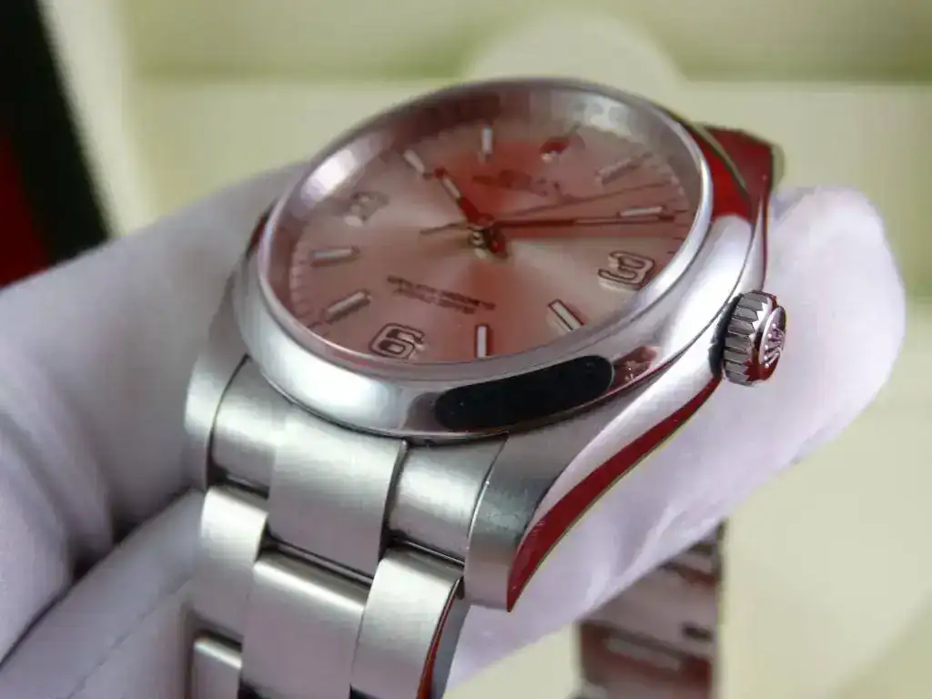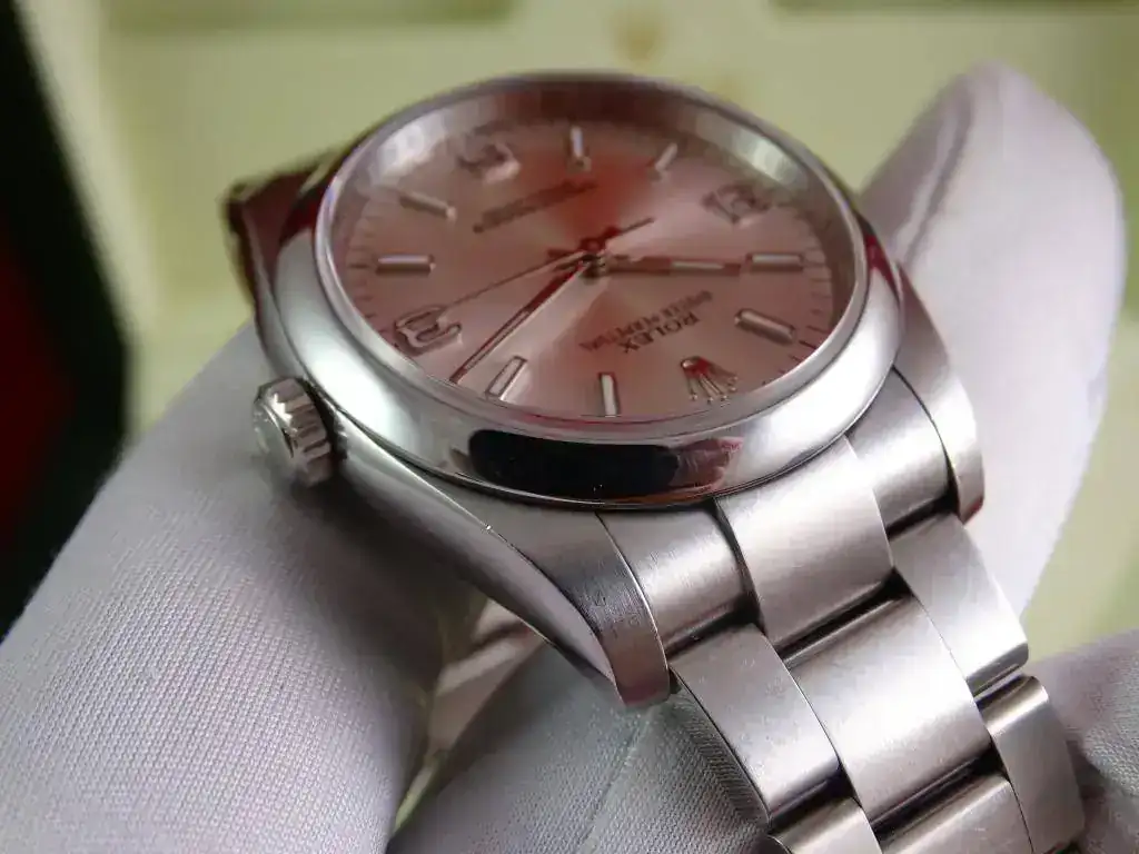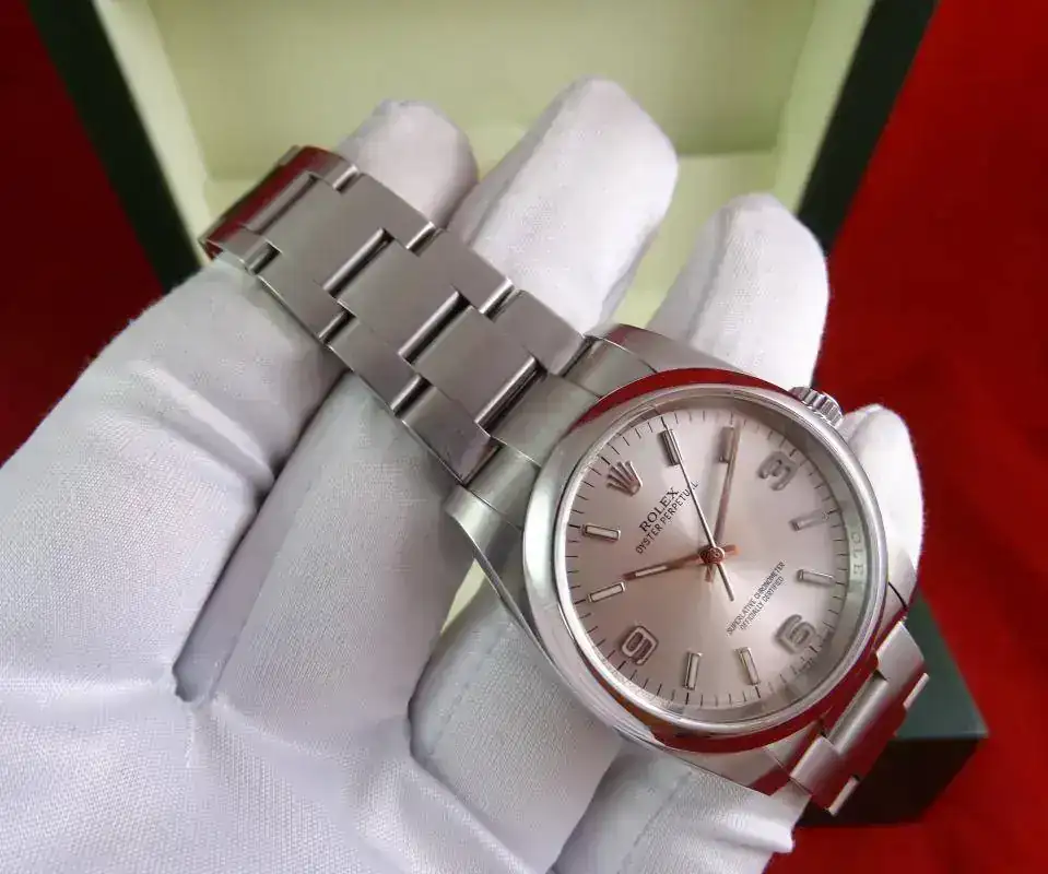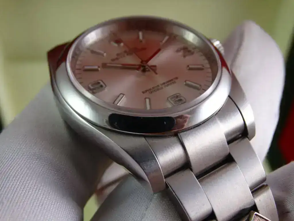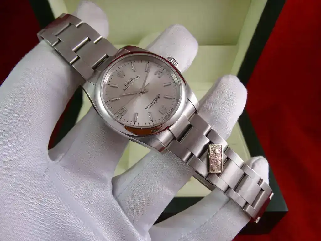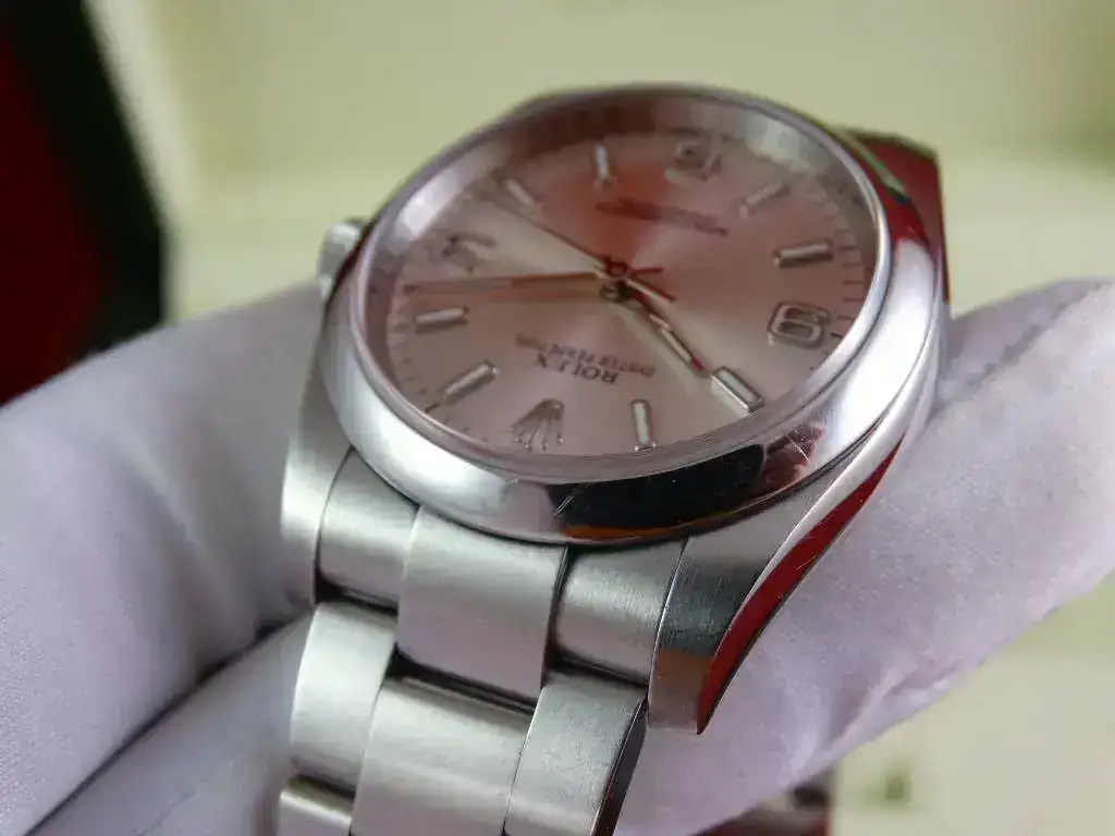 El reloj es un clásico de ROLEX, y representa el acceso a la marca. Con medida de 36 mm, y el brazalete de acero, en la muñeca tiene presencia suficiente, también en el caso de muñecas medias y grandes, precisamente por no ser un deportivo puro. La esfera plata, realzada por los numerales arábigos 3-6-9 (un magnifico detalle) y el anillo de seguridad, le confieren un aspecto gran calidad, y la ausencia de fecha (y la consiguiente lupa) hacen que el reloj parezca mas grande que otros modelos de 36 que sí la incorporan.