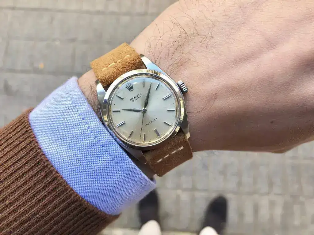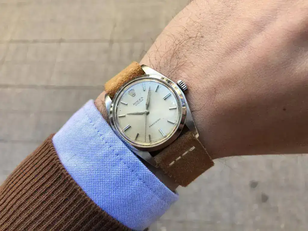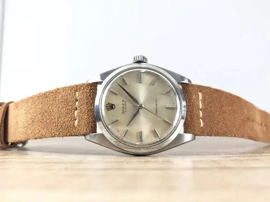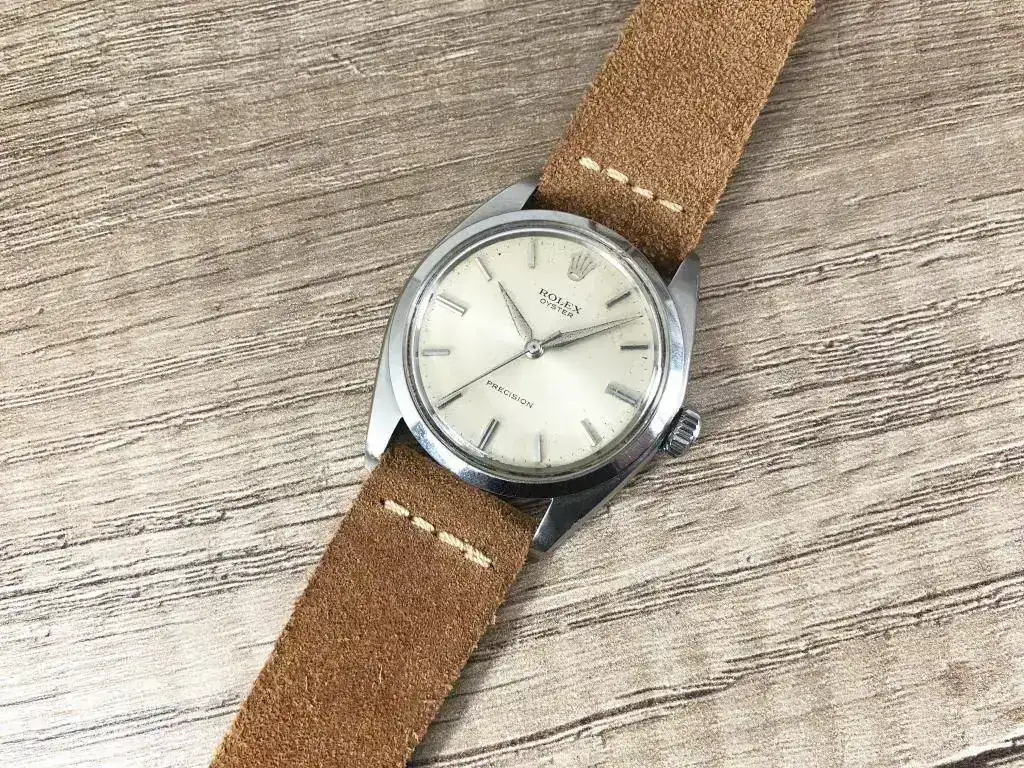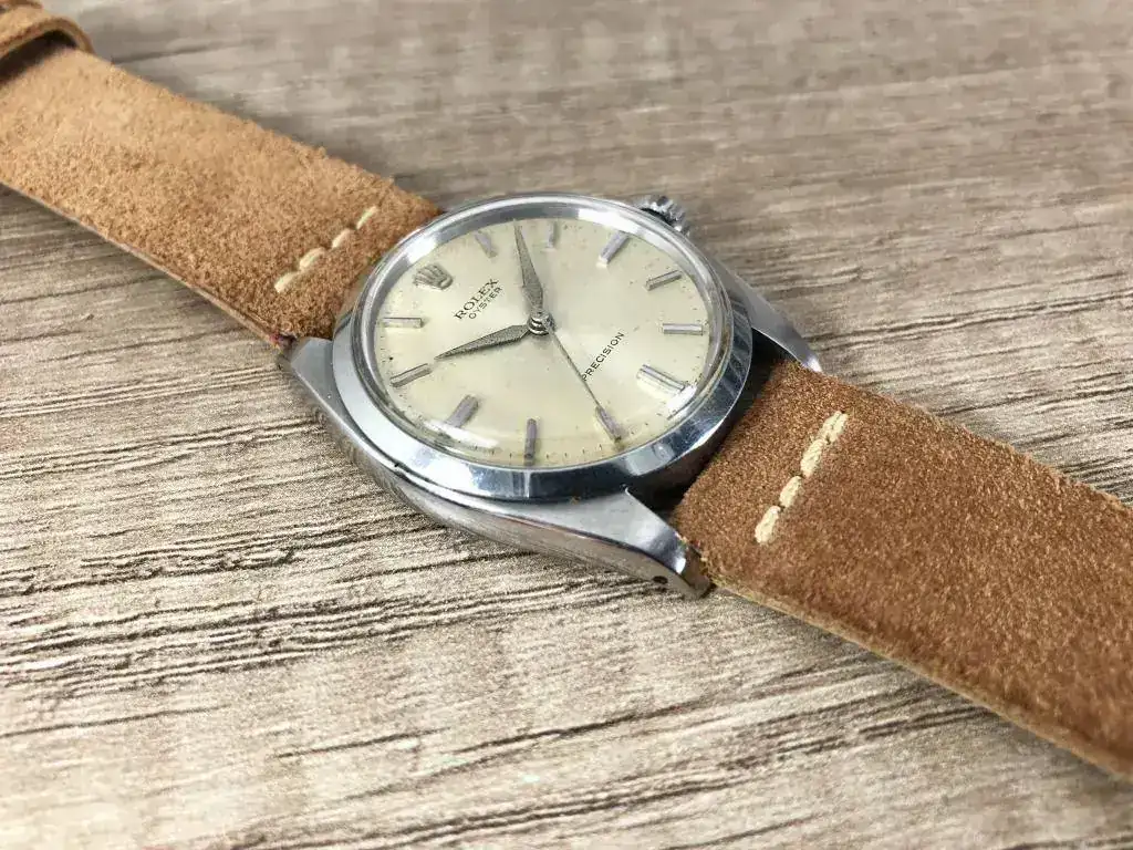 Saco a la venta este bonito Rolex Precision. Modelo característico de los años 60, con una preciosa esfera color crema que denota el paso de los años. Correa de ante estilo vintage nueva a estrenar.