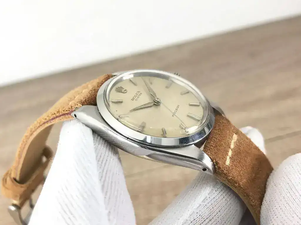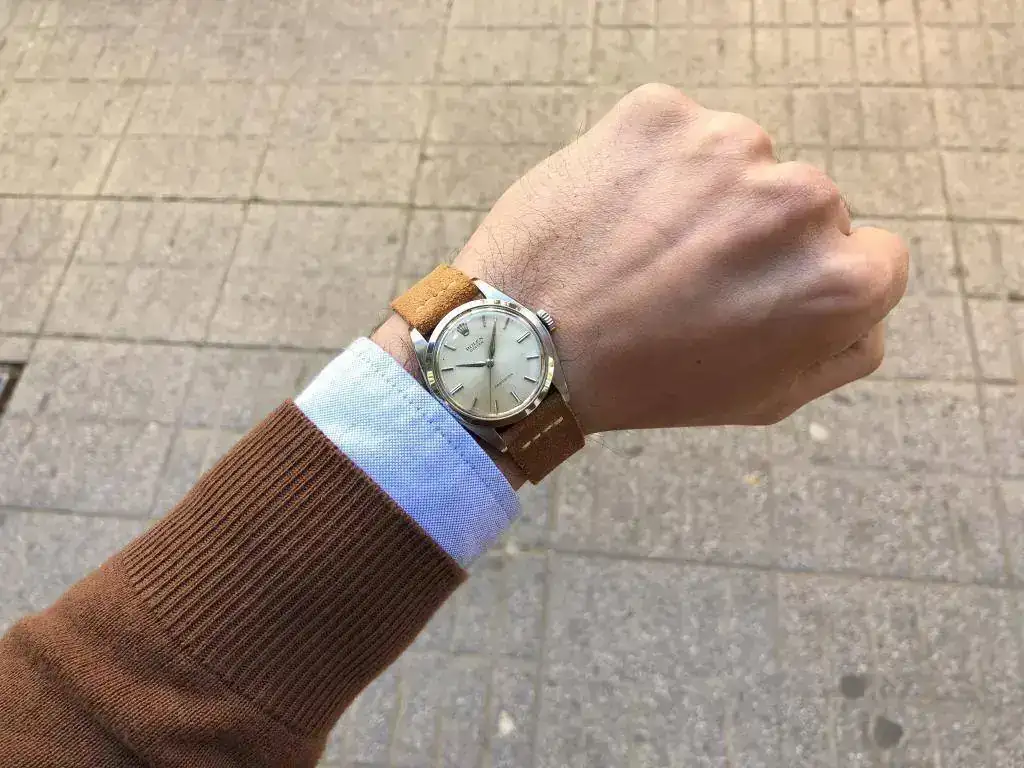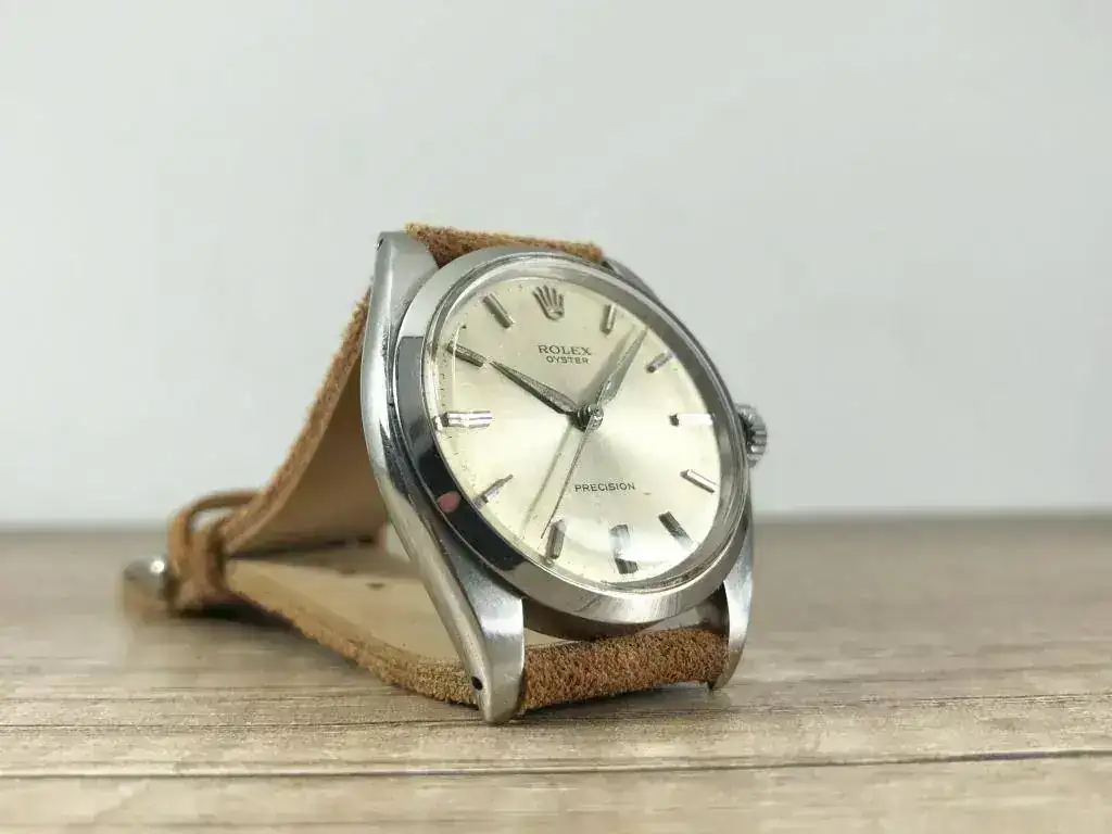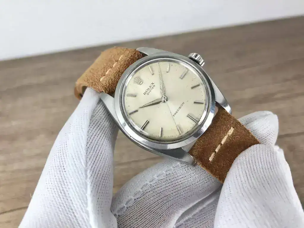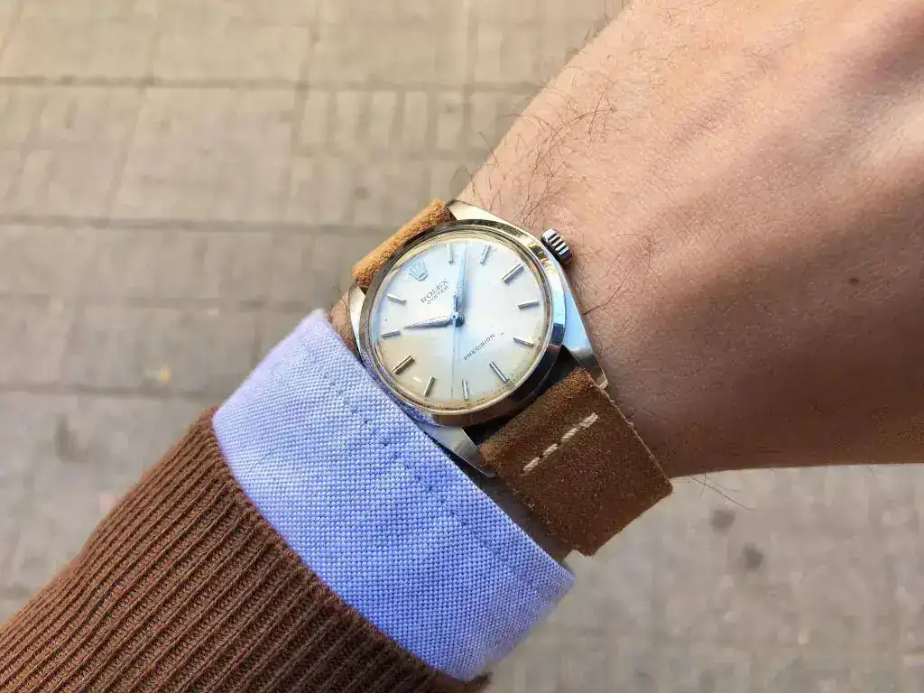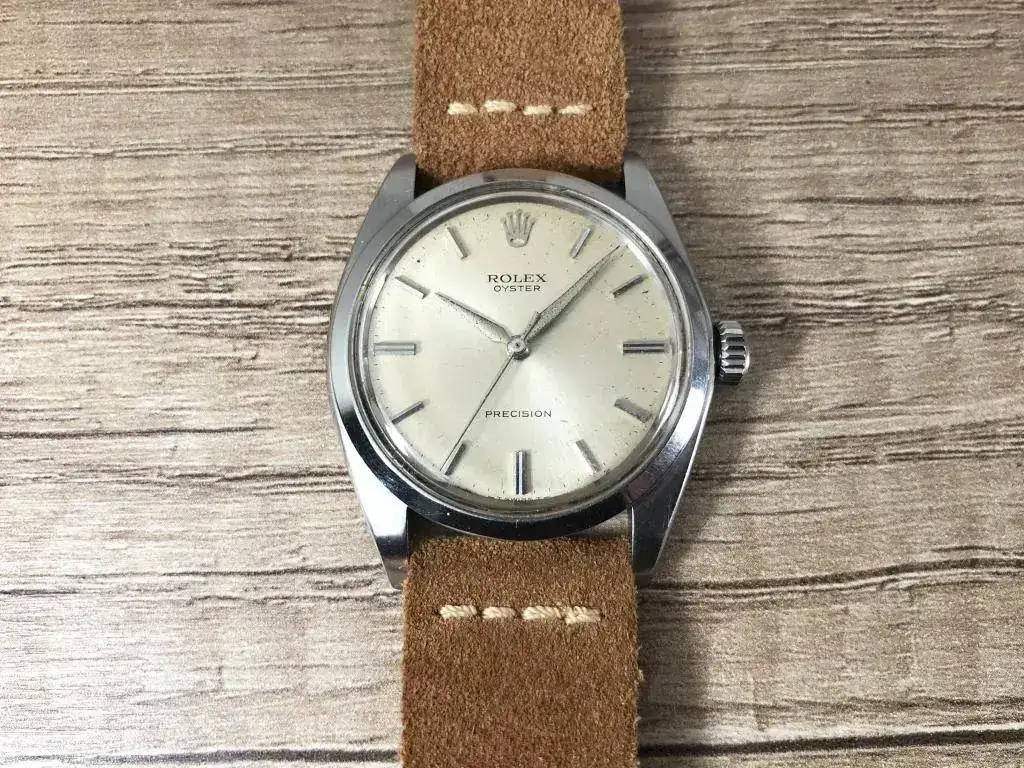 Saco a la venta este bonito Rolex Precision. Modelo característico de los años 60, con una preciosa esfera color crema que denota el paso de los años. Correa de ante estilo vintage nueva a estrenar.