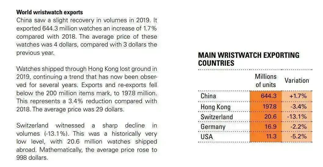 Creo que esa cifra se refiere a varios años, no solo a uno, porque si en 5 años (2013-17) exportaron 688 millones de relojes, es difícil que exportaran 850 mills. solo durante el 2019De todos modos los mayores fabricante de relojes del mundo con una enorme diferencia en número de unidades sobre los demás son los chinos. Dicho de otro modo. Que si a nivel mundial observamos a las personas que llevan un reloj en la muñeca hay una altísima probabilidad de que ese reloj sea chino.