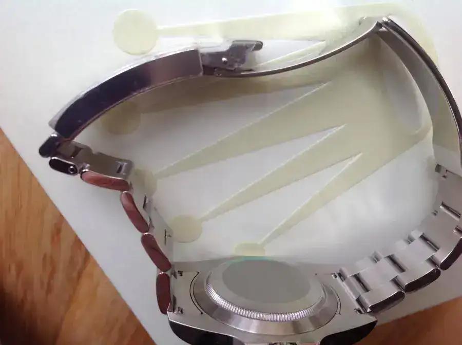 en la boutique de Castellana.Tiene alguno de sus plásticos,le faltan aquellos que me quitaron en el momento del ajuste a mi muñeca .El reloj lo adquirí en concesionario nacional y es de principios de diciembre del 2013,por lo cual le quedan los dos años completos de garantía.