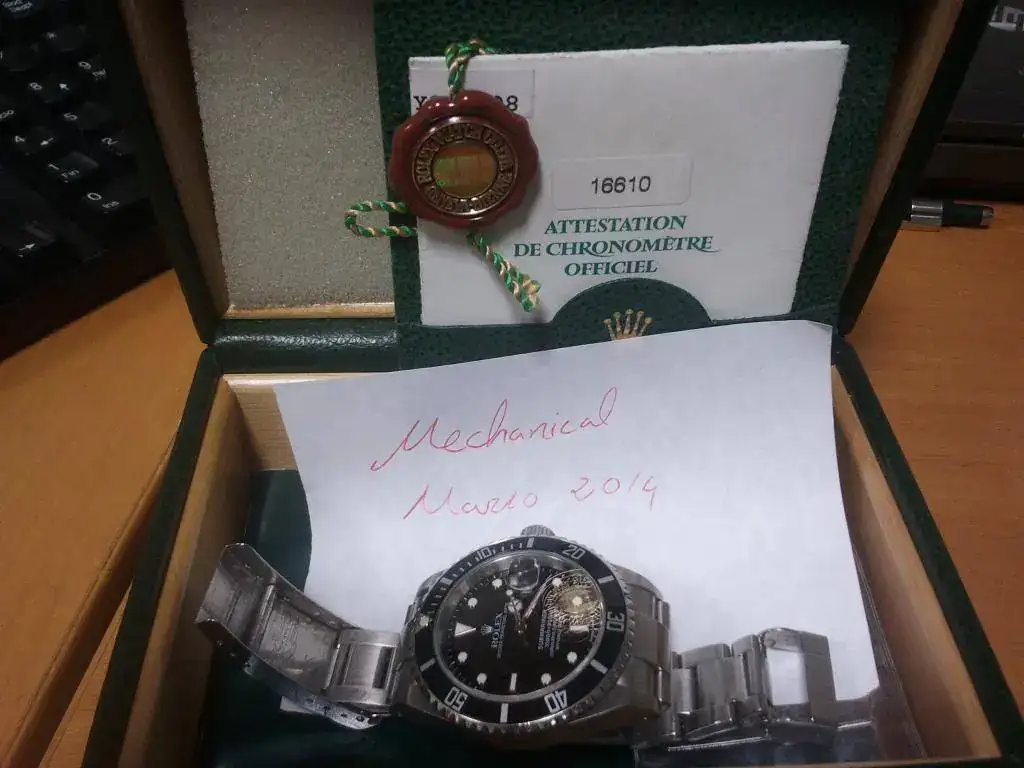 saco a la venta mi Rolex Submariner 16610 comlpeto de cajas y papeles (hasta el ancla) de 2003, en estado "muy cuidado" como dijo el vendedor de la relojería Alemana de Palma. Va completo con garantía sellada y sin nombre, sin pulir, nunca abierto, o sea virginal, según me dijo su anterior propietario que fue su único dueño. Con marcas de uso pero buen estado general, armis carente de holgura como se ve en la foto, orden de marcha correcto, en fin todo lo esperable de un reloj de estas características. Mi precio, que es el que pido es de 3800€. El envío por cuenta del comprador y convendría que lo asegurara. Cambios, en principio no contemplo, salvo por otro Rolex que me guste y de menor cuantía, pero es poco probable porque quiero la pasta para otros vicios