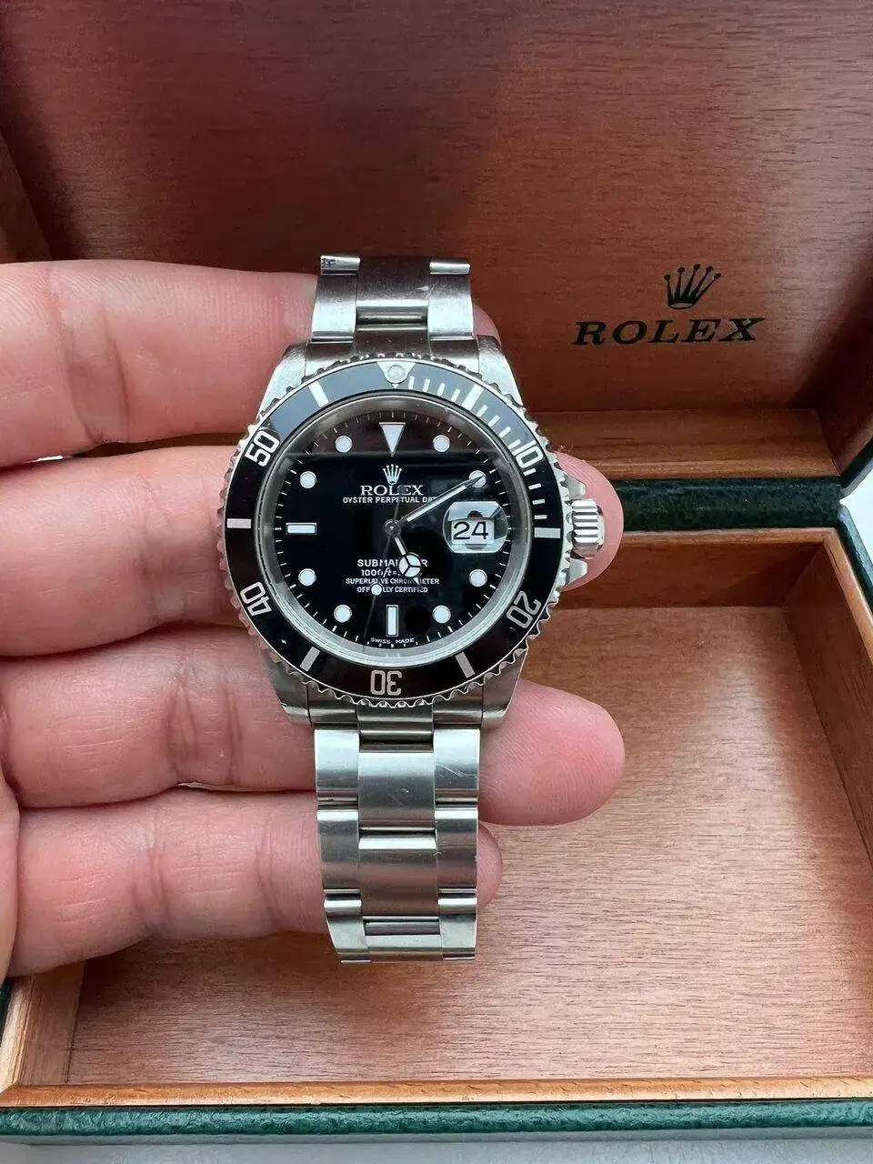 Se trata de un archi conocido Submariner Date del año 2001 serie P, es un reloj usado que desde que está en mi poder se ha usado con mucho cuidado, si buscas un reloj nuevo este no es es el tuyo, no se ha pulido en mi poder y desconozco si en el pasado se ha hecho, a juzgar por las asas, yo diría que no, pero vamos que no soy experto en la materia.