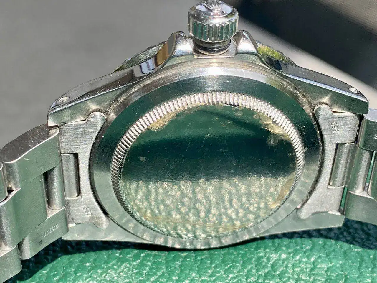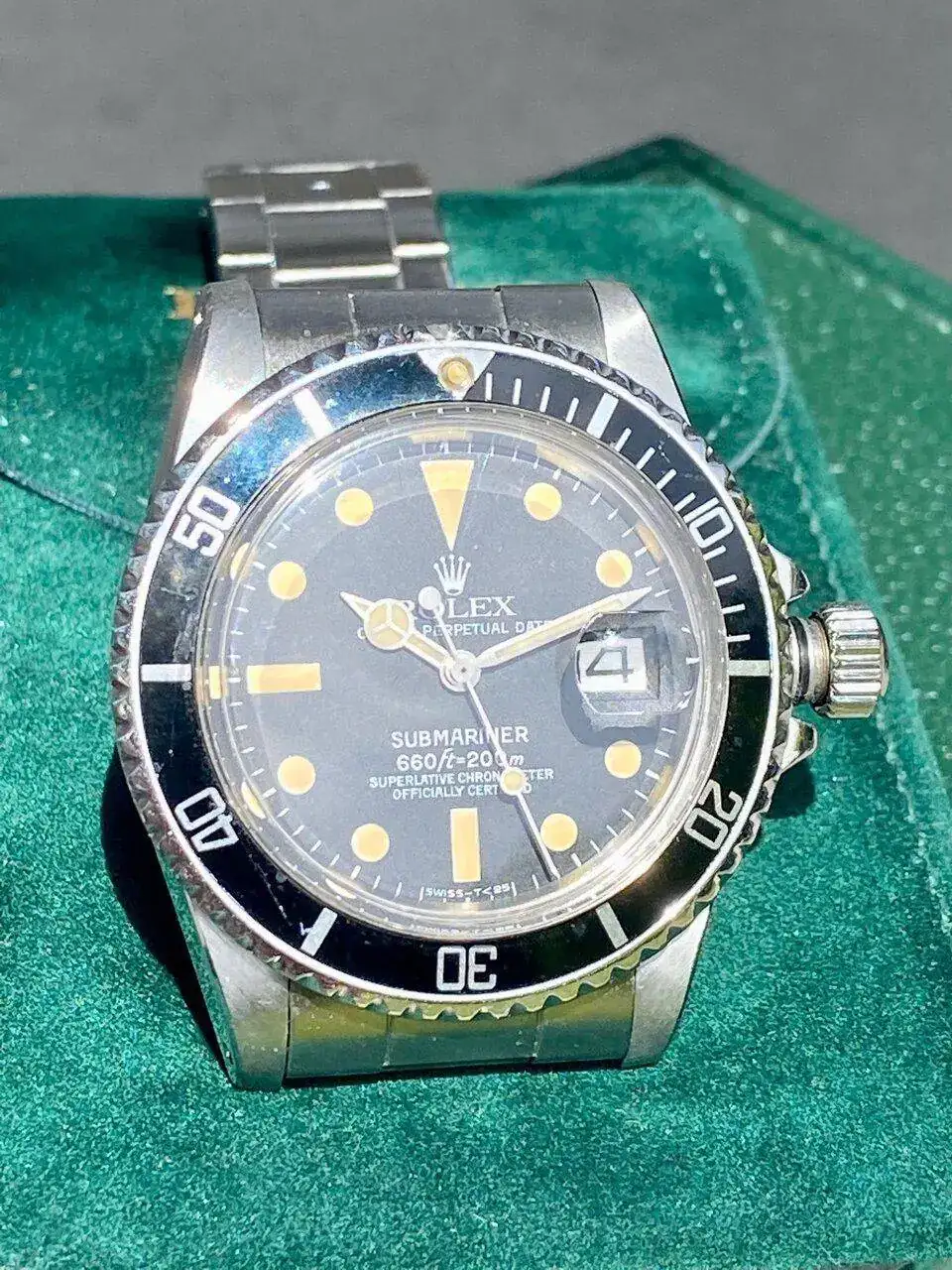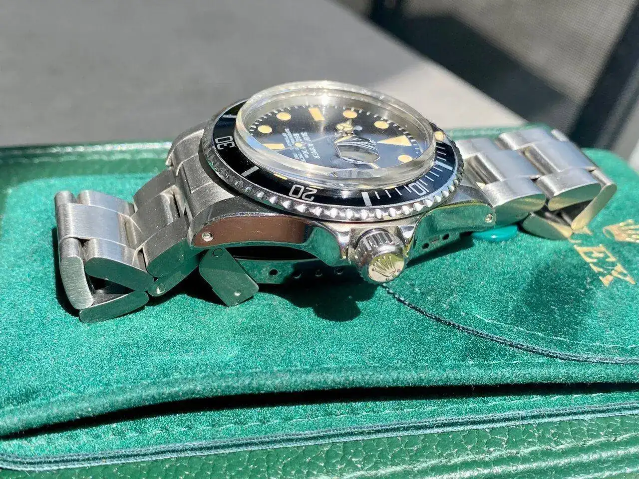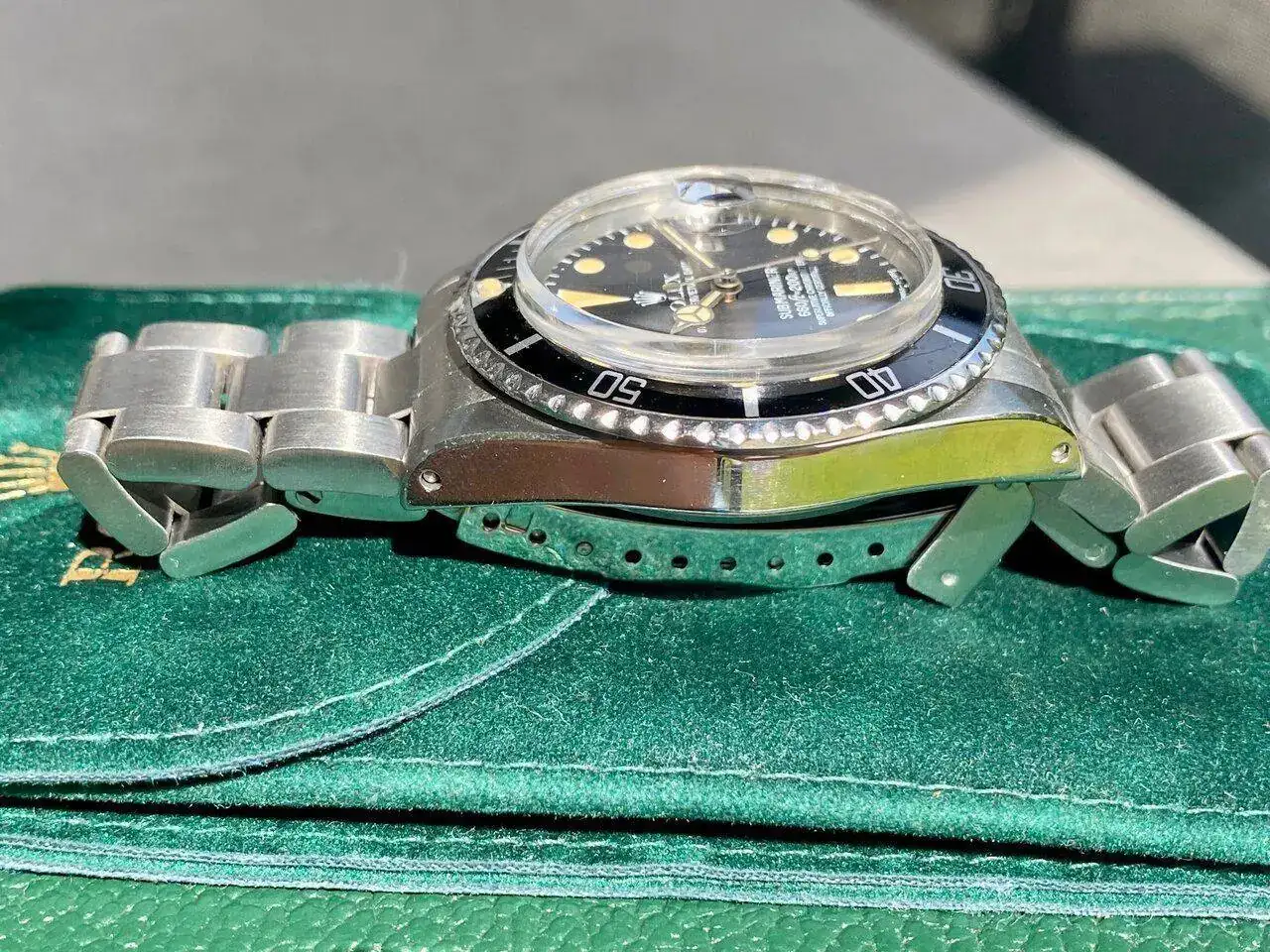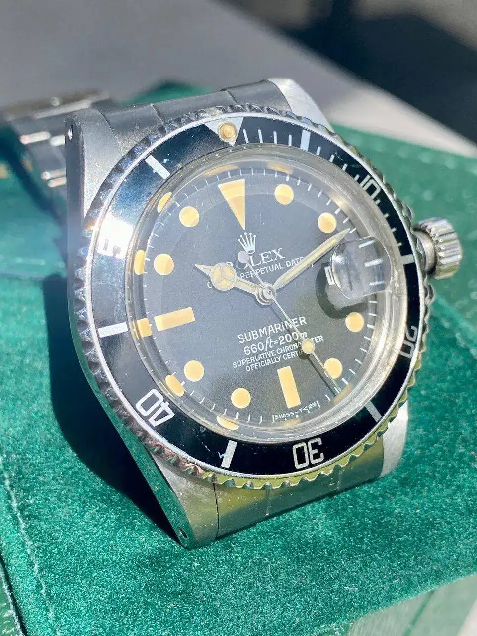 La esfera mate tiene una patina brutal con los índices, aguja y perla bien caramelizados. La caja no tiene golpes y conserva su forma y bordes de origen a pesar de sus 45 años.