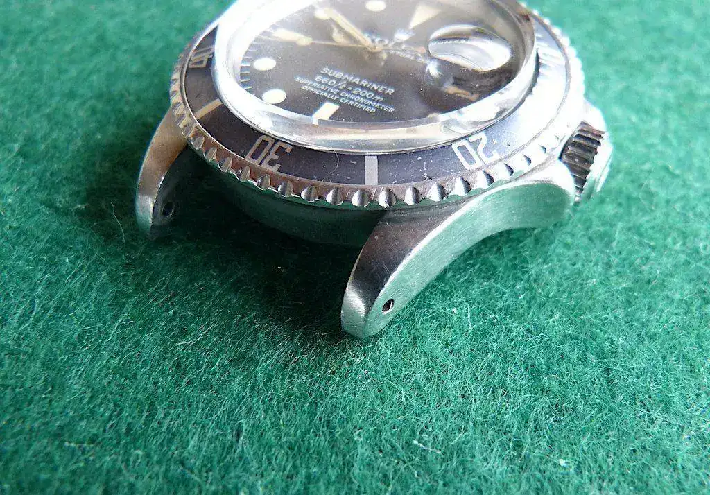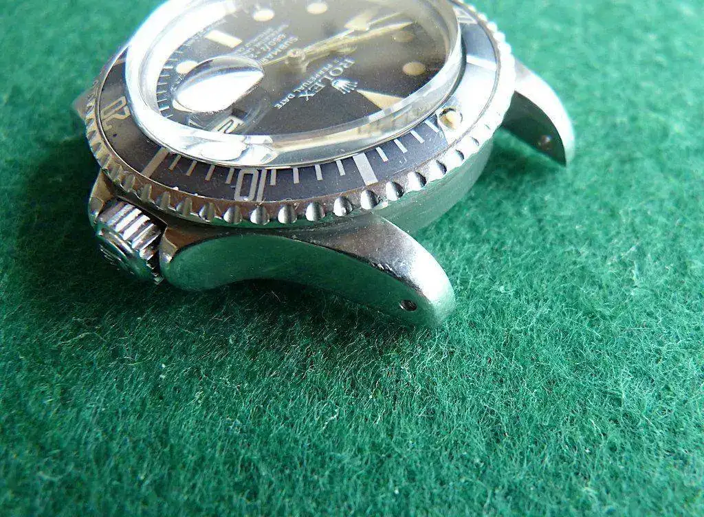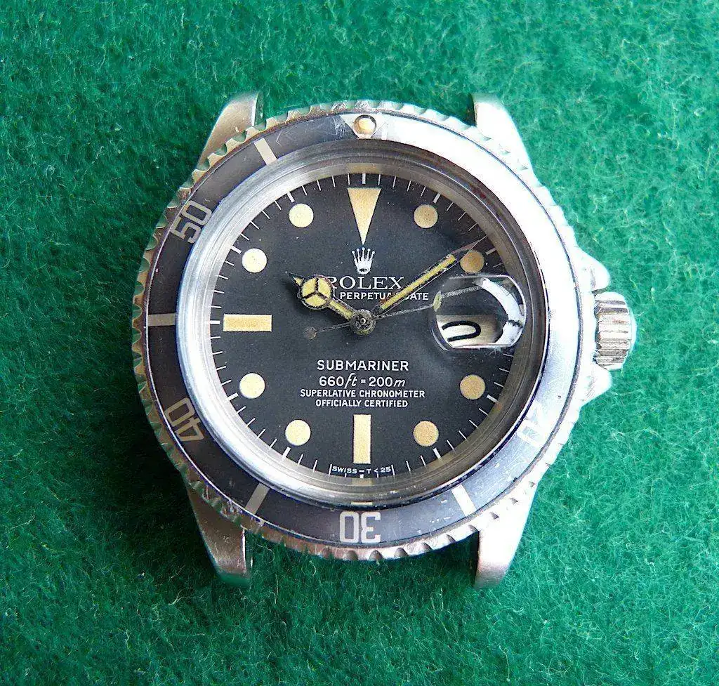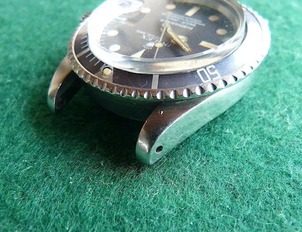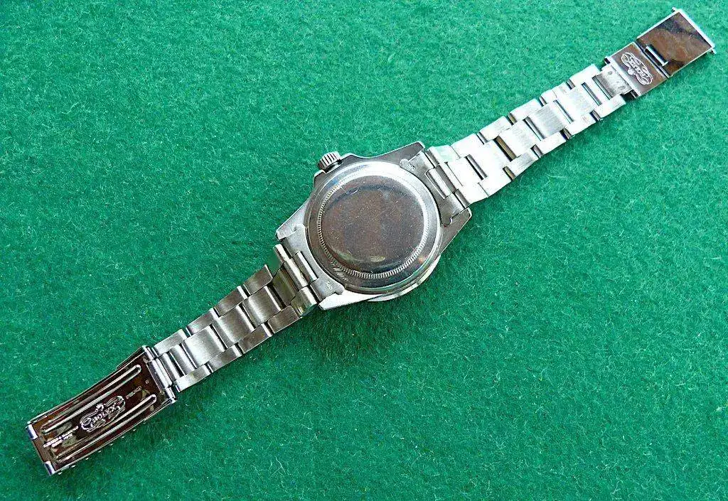 La esfera de origen y sin retocar presenta una preciosa patina y leves halos. La corona del logo Rolex tiene un defecto leve, la pintura está ligeramente levantada como si fueran pequeñas burbujas con volumen (ver fotos). Las agujas de origen presentan algo de pitting y el tritio también con patina oscurecida pareja a la esfera.