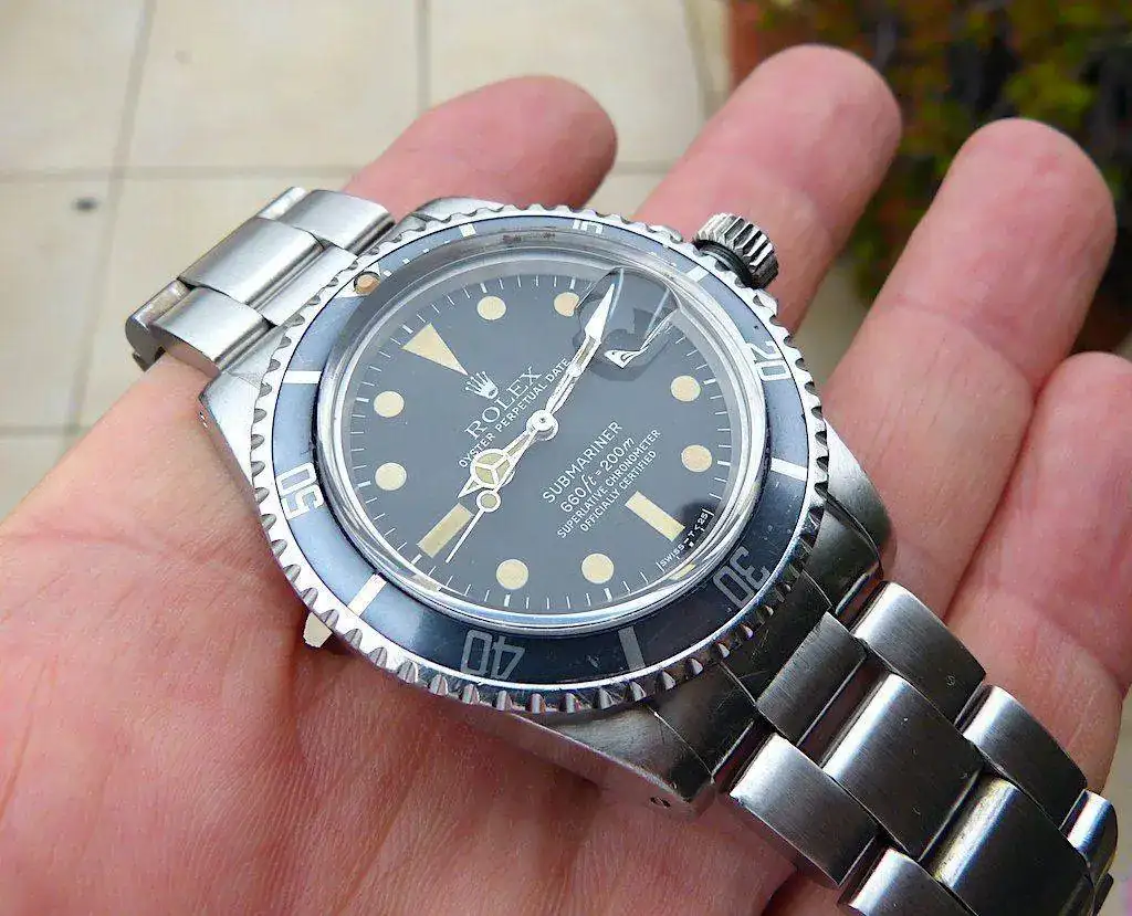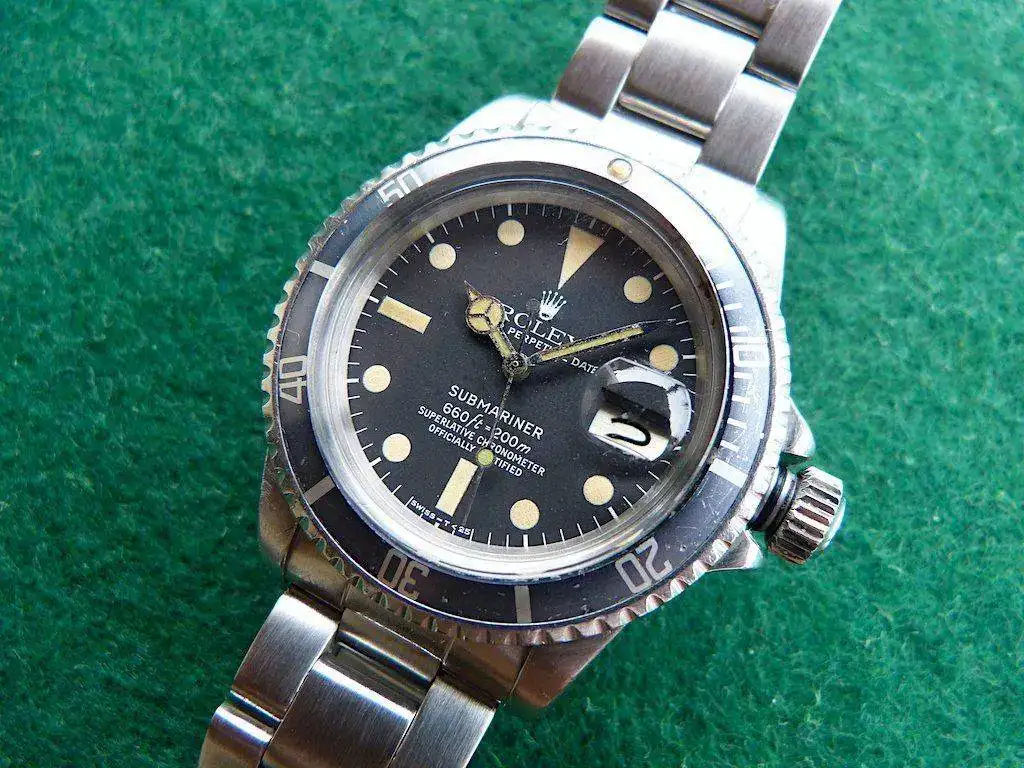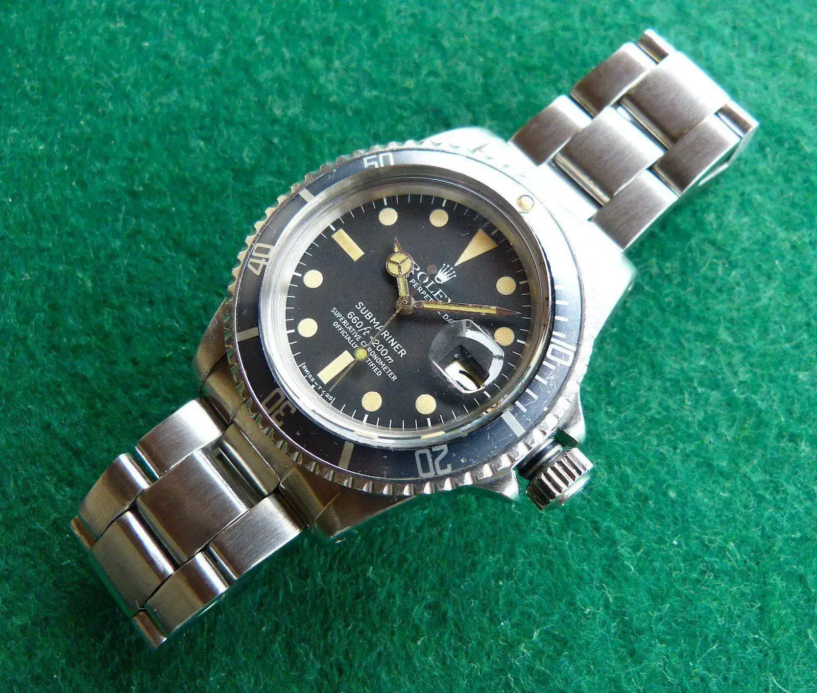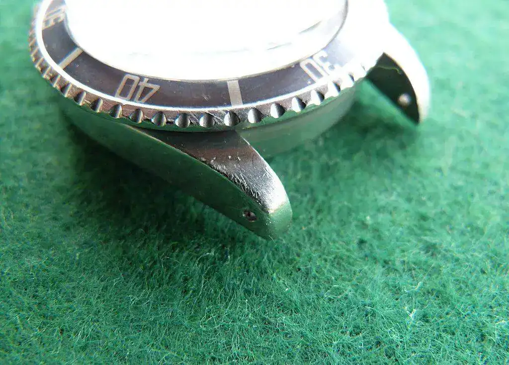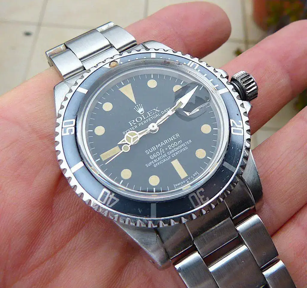 La esfera de origen y sin retocar presenta una preciosa patina y leves halos. La corona del logo Rolex tiene un defecto leve, la pintura está ligeramente levantada como si fueran pequeñas burbujas con volumen (ver fotos). Las agujas de origen presentan algo de pitting y el tritio también con patina oscurecida pareja a la esfera.