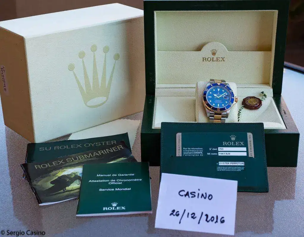 Está completo con su caja exterior, estuche verde, eslabones sobrantes, paño, manual, librito de garantía, lacre, etc.