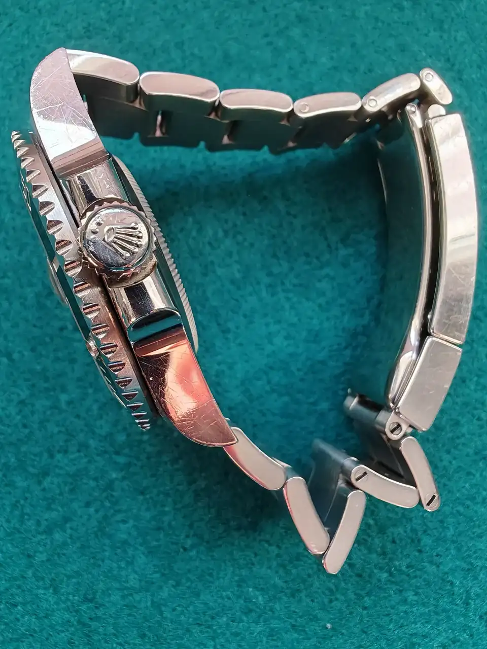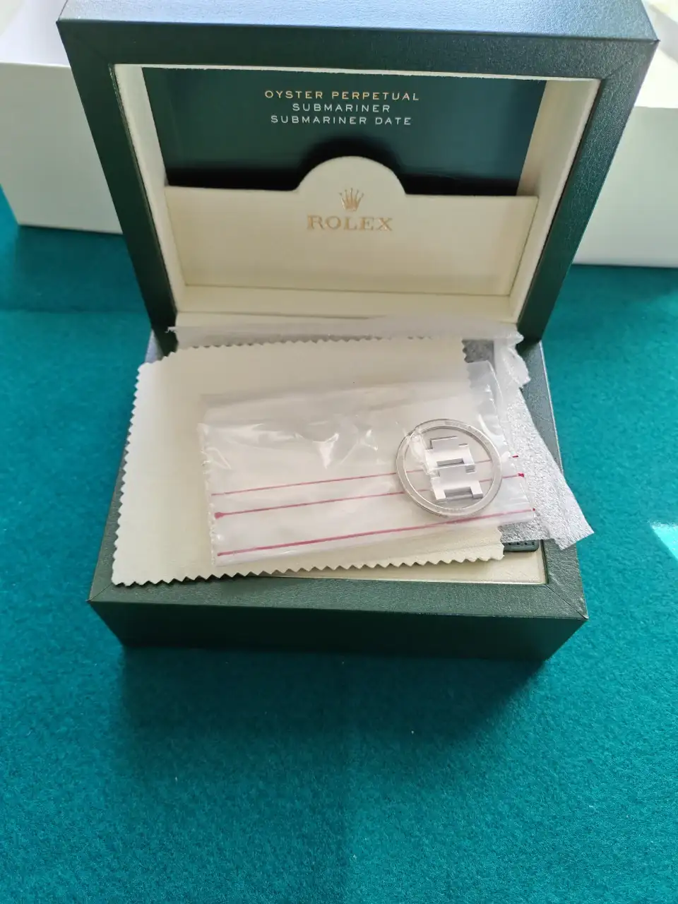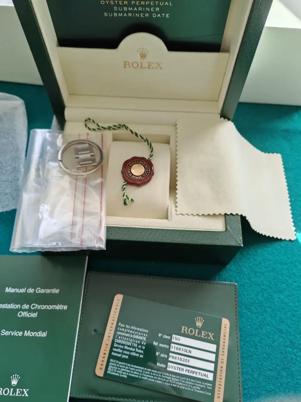 El reloj está muy bien porque siempre lo he cuidado mucho. Tiene el set completo, tal y como lo compré en la relojería: tarjeta garantía (no vigente), eslabones, caja, contracaja, factura, manual, etc.