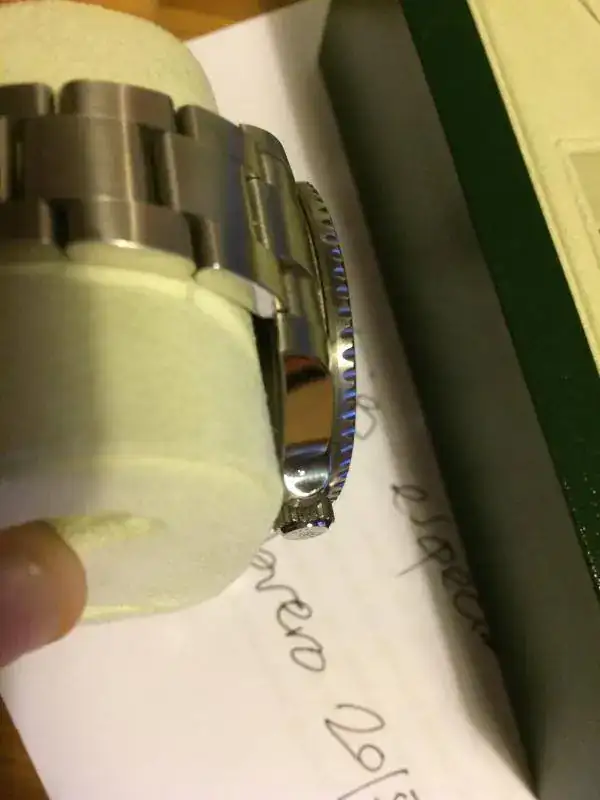 2. Un pequeño golpe en el lateral de la caja, en la zona del segundo protector de la corona. He intentado que se vea en una de las imágenes. Según la luz, es más o menos visible.
