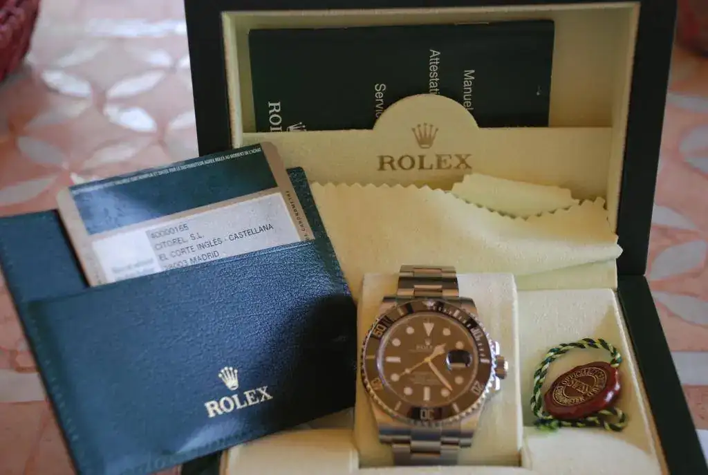 Vendo Rolex Submariner date comprado en el Corte Ingles de Castellana en Mayo de 2.013. Se trata de un reloj usado que se encuentra en muy buen estado. Únicamente quiero resaltar la existencia de un leve arañazo en un lateral de la caja de apenas 2 mm y no profundo, así como una pequeña marca en el lumen de las 12 que para cerciorarme de su existencia he tenido que coger una lupa, por lo que penas es perceptible, simplemente prefiero dejar constancia para así evitar malentendidos.