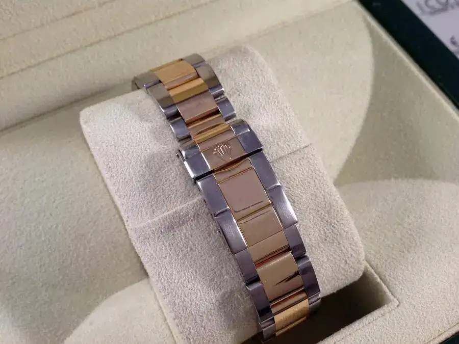 Las características son: Reloj automático con caja de 40mm., cristal de Zafiro, calibre Rolex 3135, esfera de nácar, sumergible a 100m.