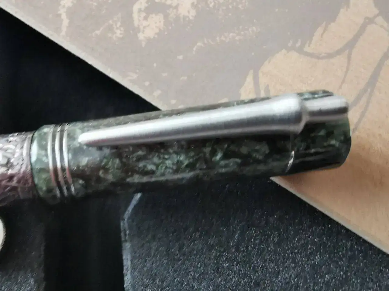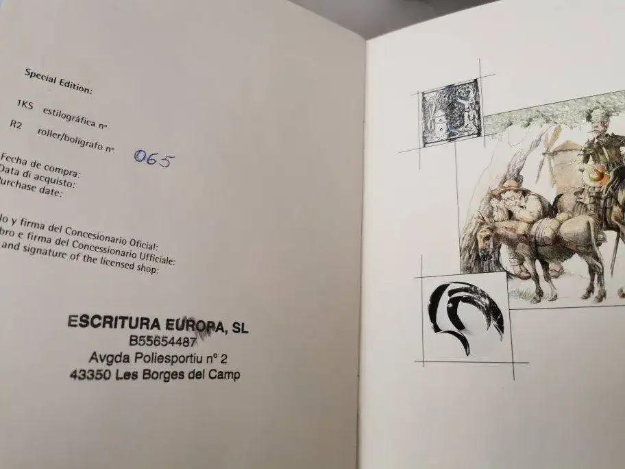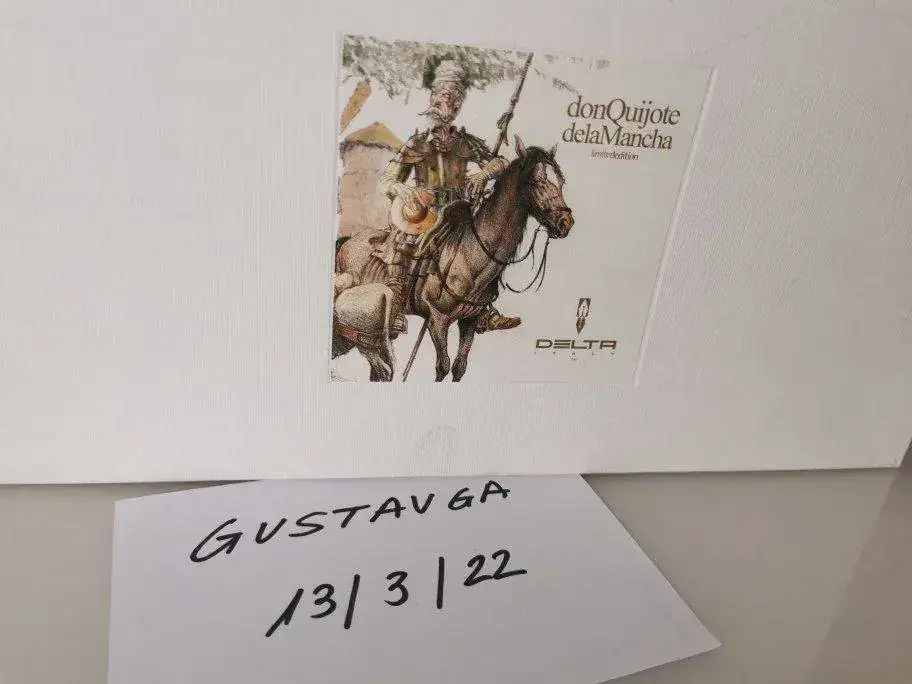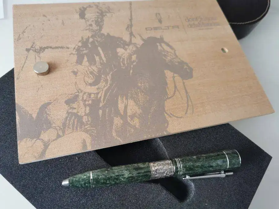 Cuerpo: Resina especial torneada a mano a barra llena. Acabado madreperla que recuerda al jade. Franja de plata maciza en la que se recrea el episodio de los molinos.